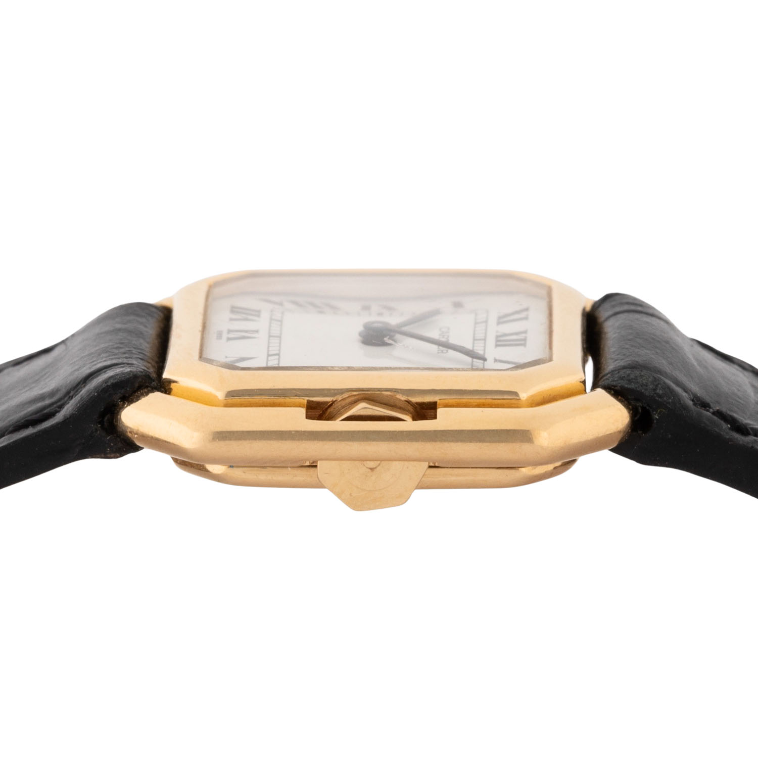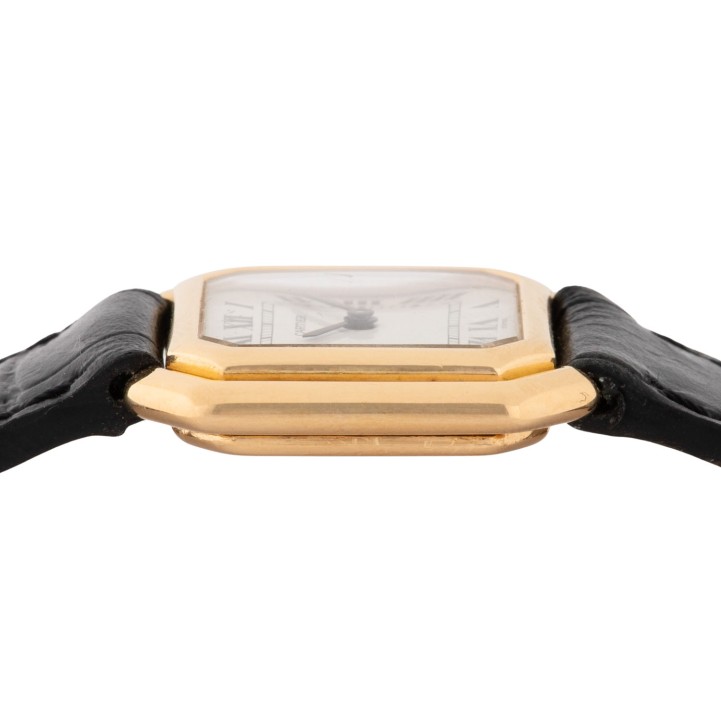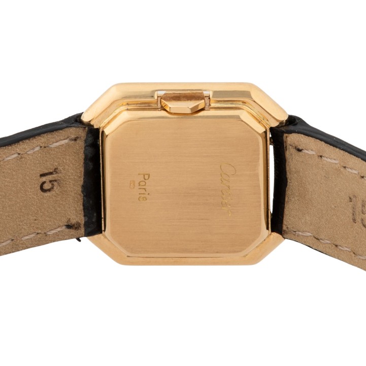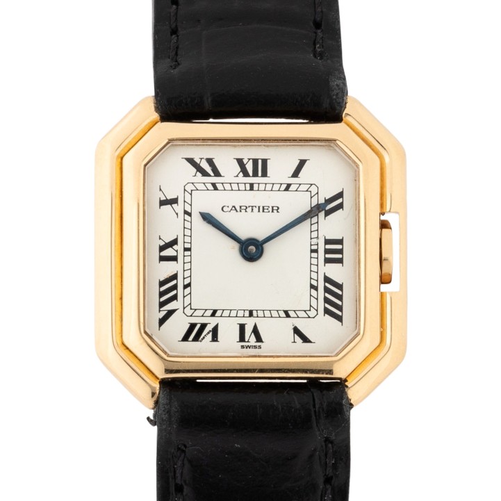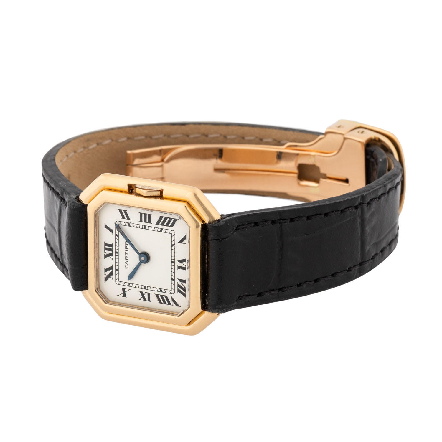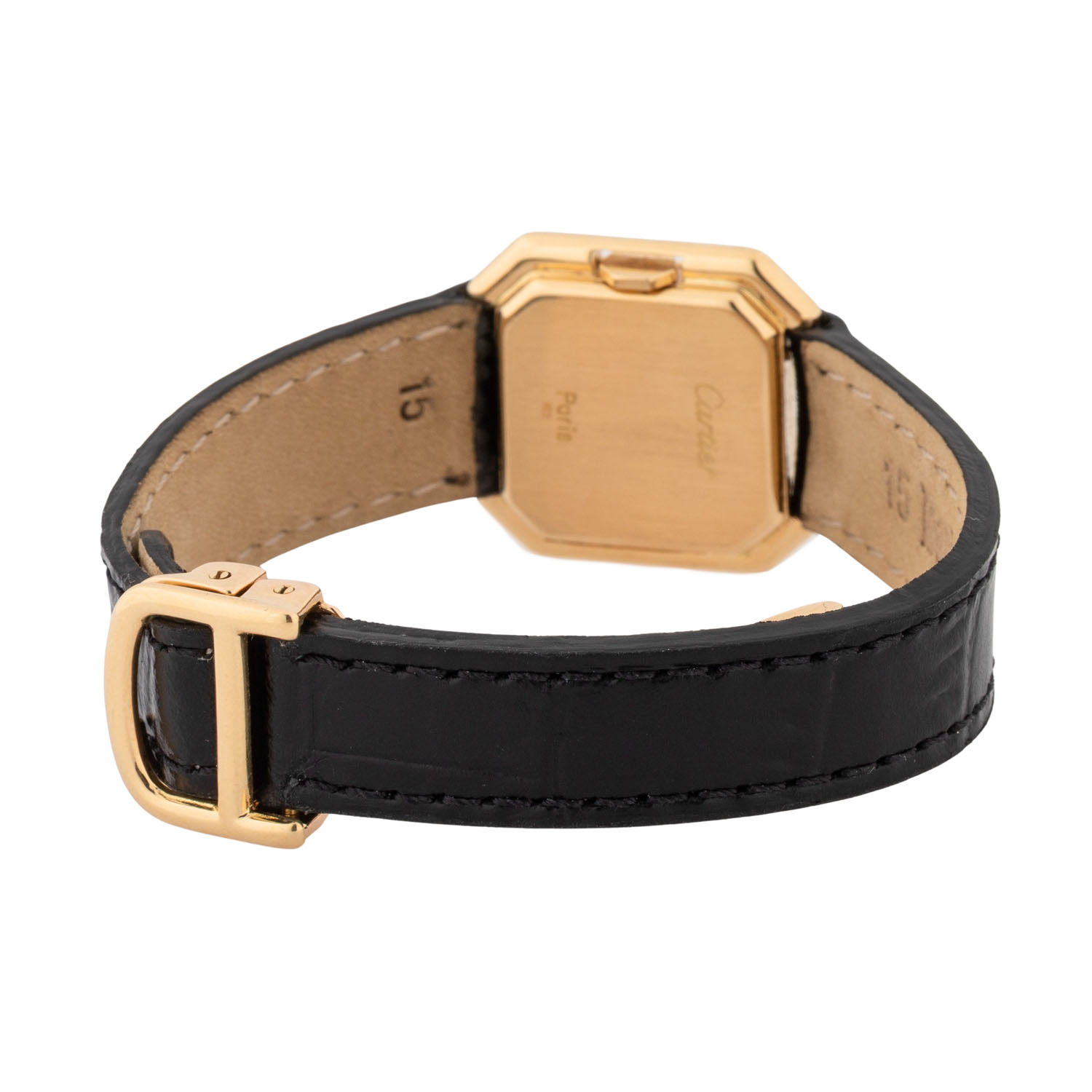 CARTIER Ceinture ladies' watch from the 80s. 18K yellow gold. Case number 429. Hand-wound movement Cal. 78-1 with very good performance (+9 s/d. 269° amplitude). White dial with Roman numerals and railway minute track. Blued hands. New leather strap with the original Cartier folding clasp in 18K yellow gold. Good condition with signs of wear. The glass has several scratches. Diameter approx. 24 mm (measured without crown). Suitable for wrist size up to approx. 16.5 cm.