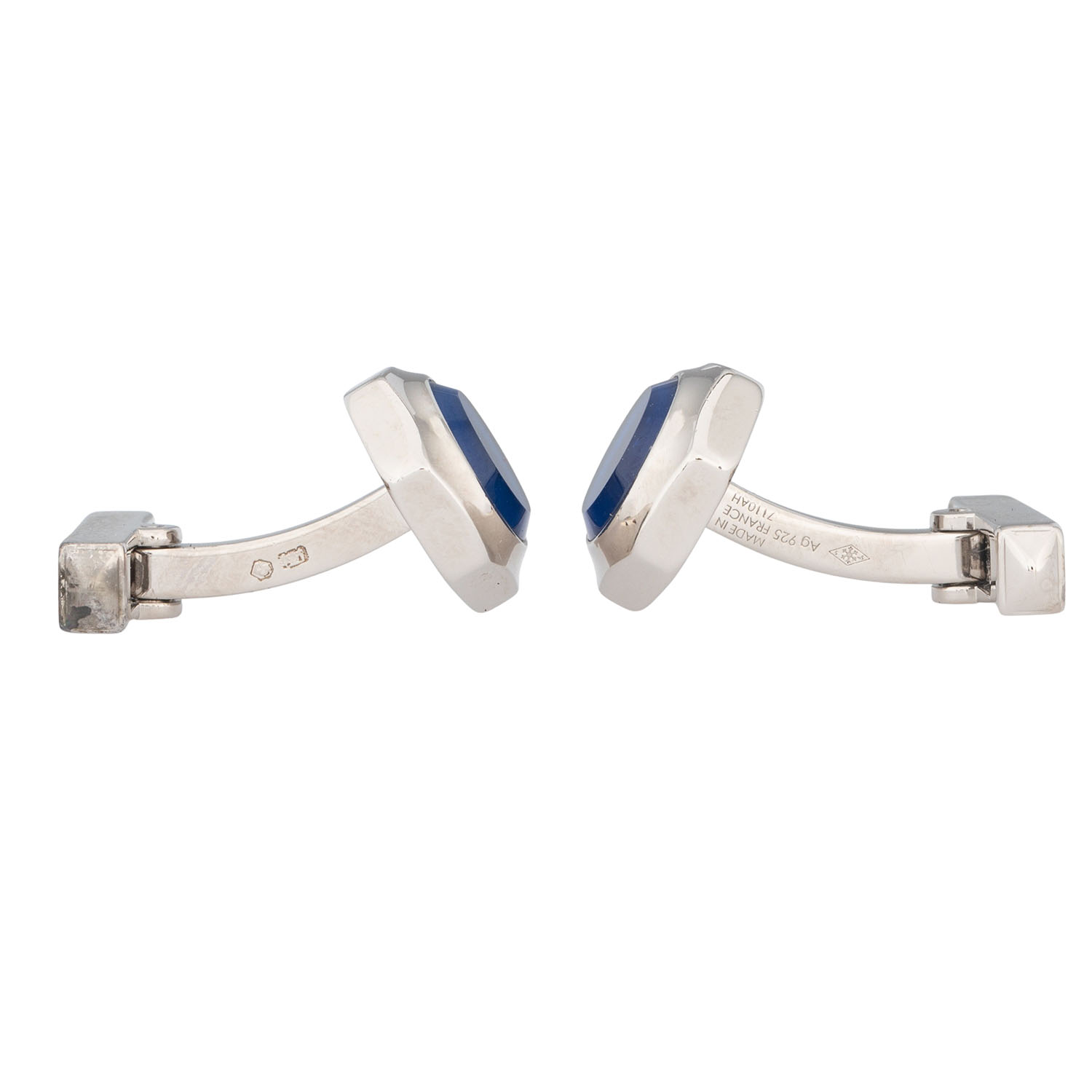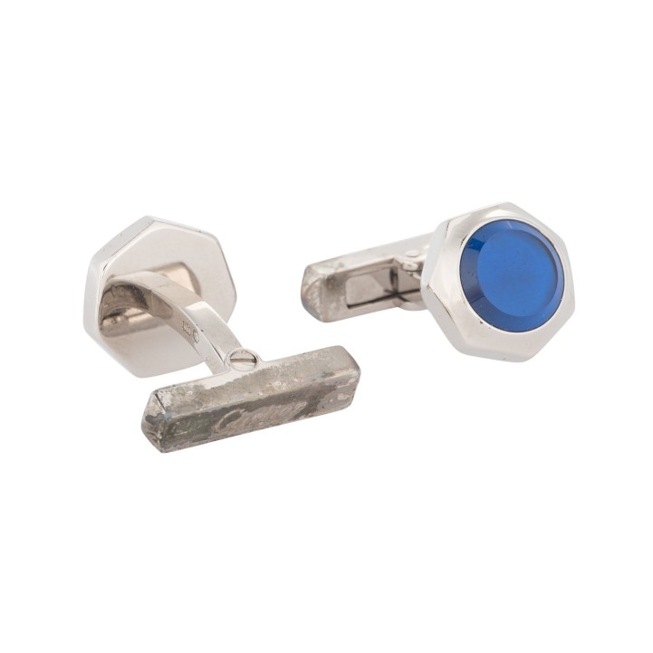 CARTIER cufflinks ‘SANTOS DE CARTIER’, retail price: €730. 925 sterling silver with palladium finish and blue synthetic spinel. Signs of wear present.