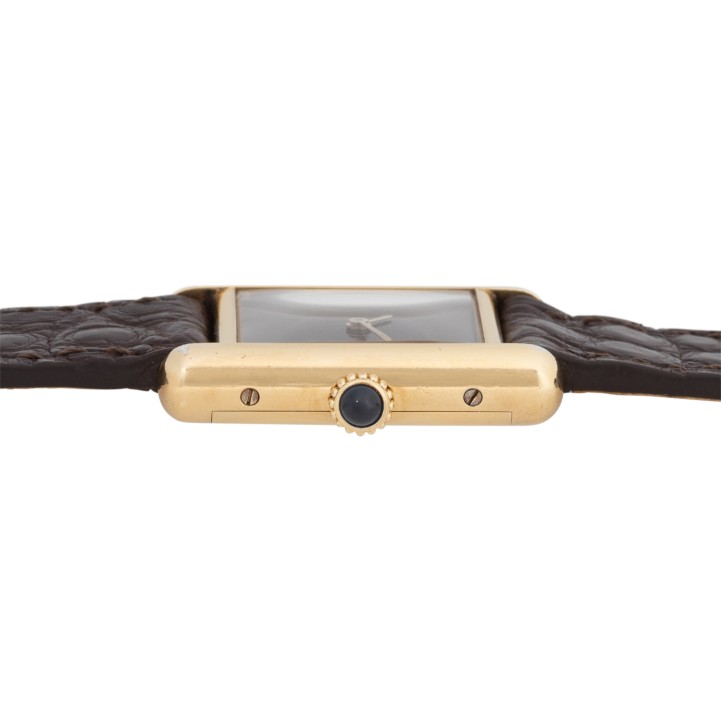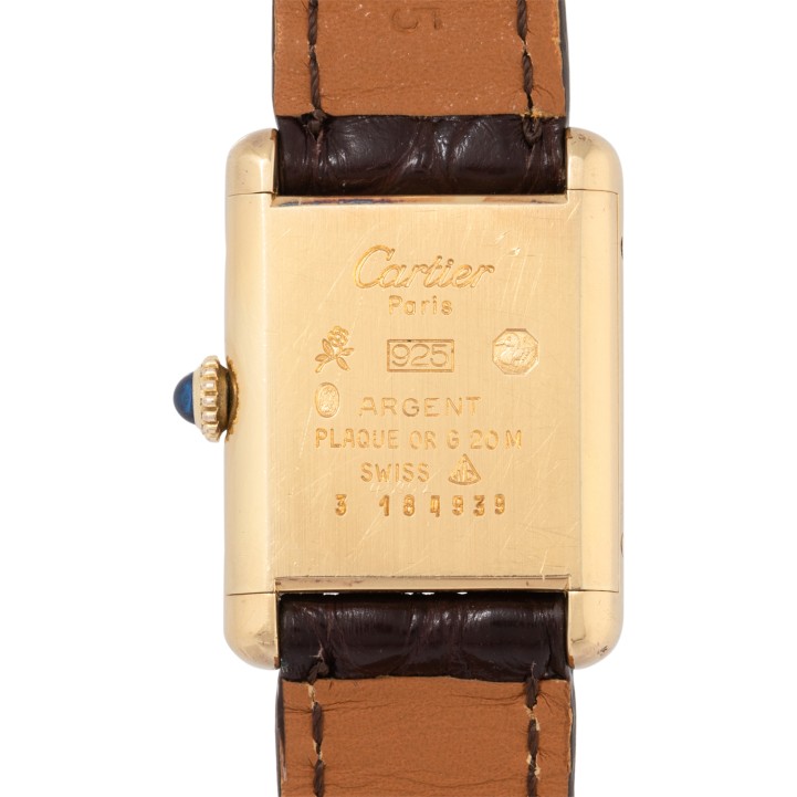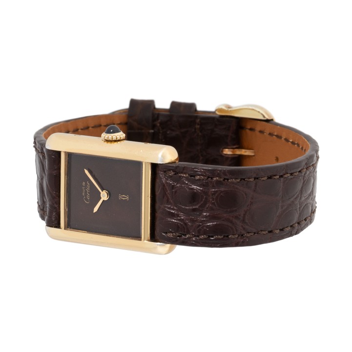 CARTIER Must de Tank Vermeil ‘Burgundy’ ladies' watch. Approx. 1980s. 925 silver / gold-plated. Serial number 3184939. Hand-wound movement calibre 78-1 with very good performance (+4 s/d. 281° amplitude). Burgundy red dial with slight craquelure. Crown with blue sapphire cabochon. New leather wristband with gold-plated Cartier buckle. Good condition with signs of wear. The gold plating is slightly worn in some places. Diameter approx. 20 mm (measured without crown).