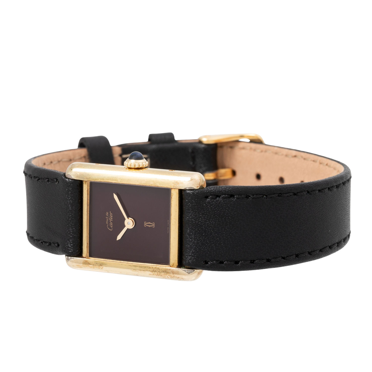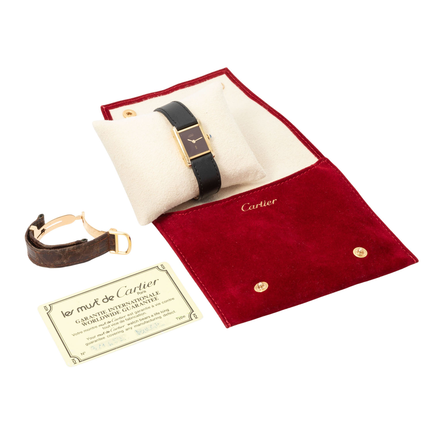CARTIER must de Tank 'Vermeil' wristwatch with papers. Silver 925 / gold-plated. Hand-wound movement with very good performance (+9s/d. 299°). Burgundy red dial. Crown with blue sapphire cabochon. New leather wristband with gold-plated pin buckle. The watch had a revision in 2024. The dial, crystal, hands and crown were renewed as part of the overhaul. Case cover with service sticker. Good condition with visible signs of wear. The gold plating on the lugs is slightly rubbed. Cartier velvet case, old Cartier leather wristband (worn) with Cartier folding clasp in 18K yellow gold, invoice of an revision from April 2024 and warranty card enclosed. Purchased in December 1979 from Cartier in St. Moritz/Switzerland. Diameter approx. 20.5 mm without crown.