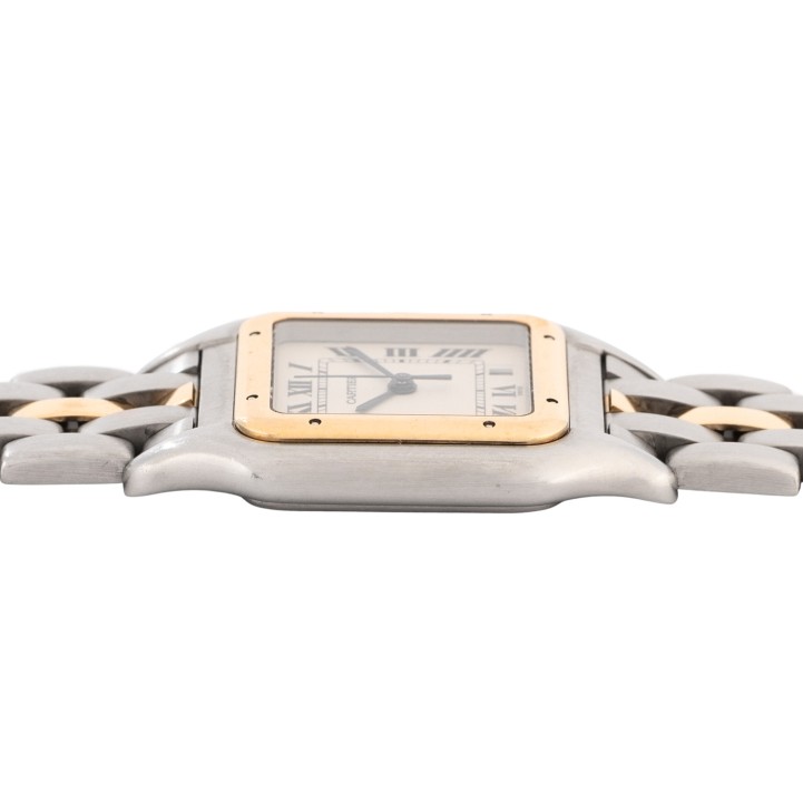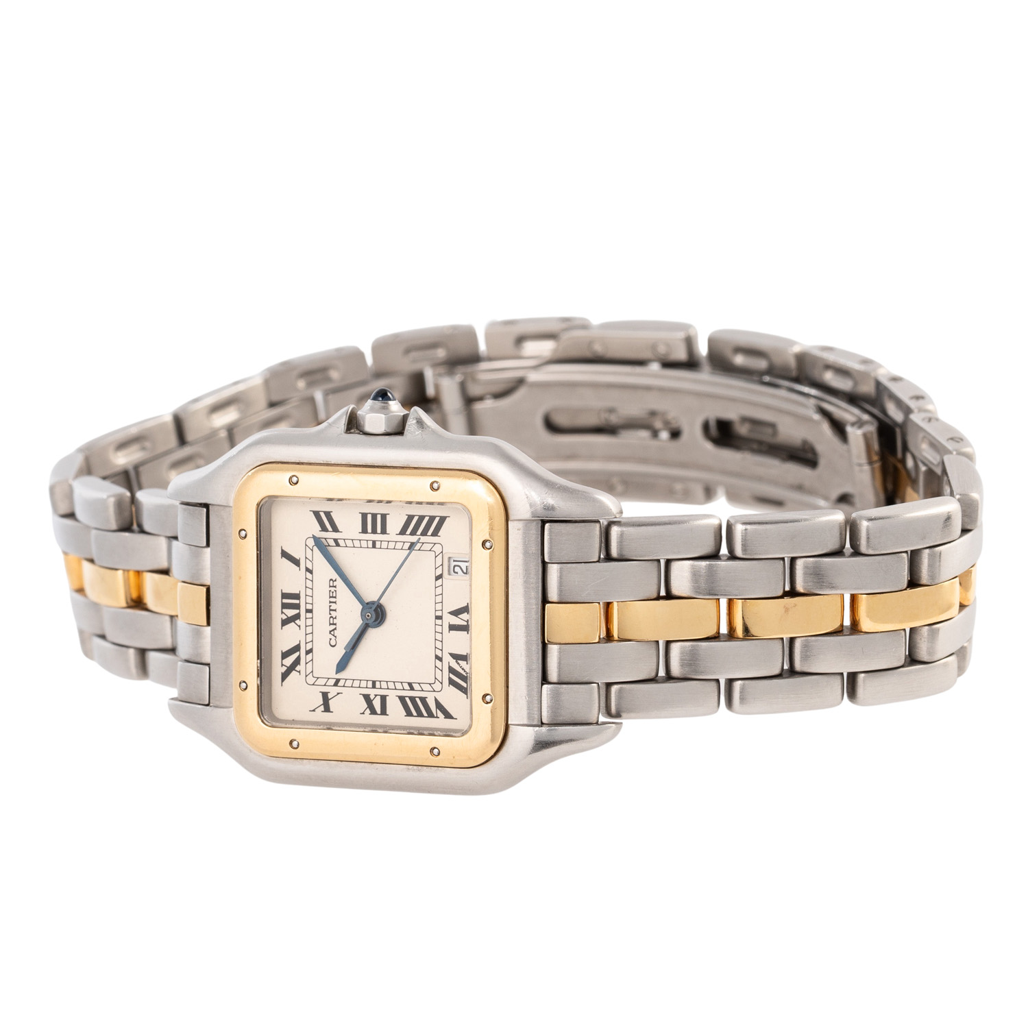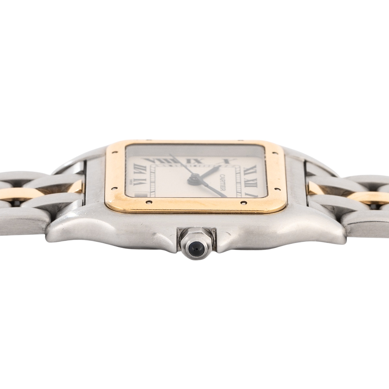 CARTIER Panthère Ref. 1100 Ladies' watch circa 1990s. Stainless steel/18K yellow gold. Quartz movement Cal. 87 with a new battery in working condition. Dial with blued hands, Roman numerals, and date display at 5 o’clock. Steel/gold link bracelet 1-row with folding clasp. Good condition, slight signs of wear on the bracelet and case. Diameter approx. 26.5 mm, measured without crown. Fits wrist circumference up to approx. 18.5 cm.