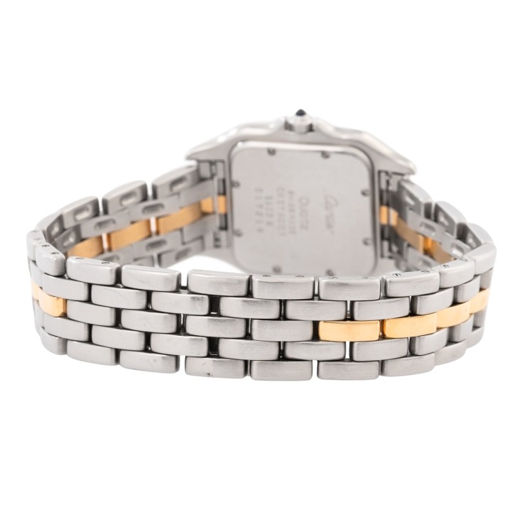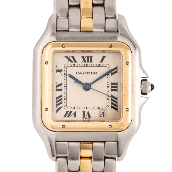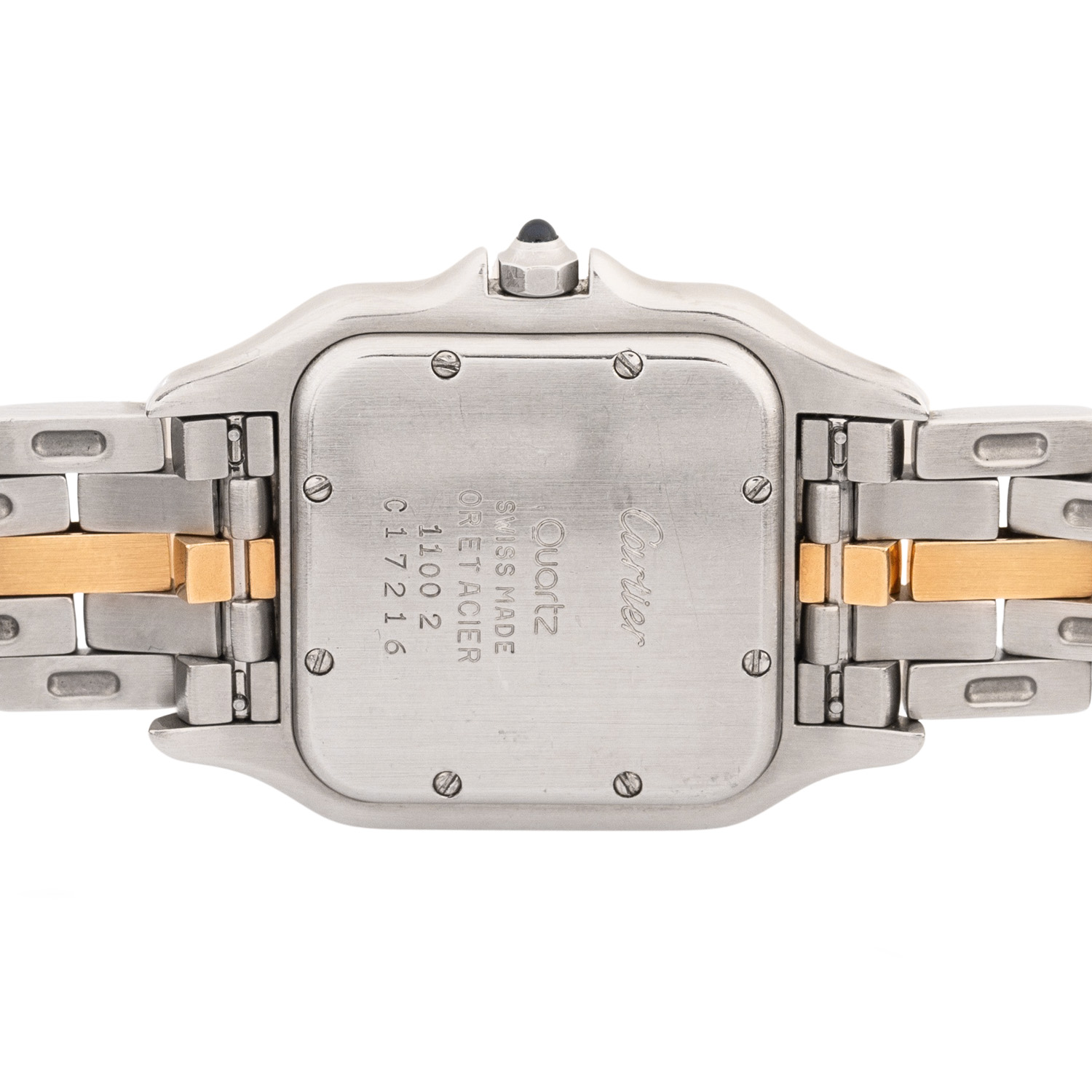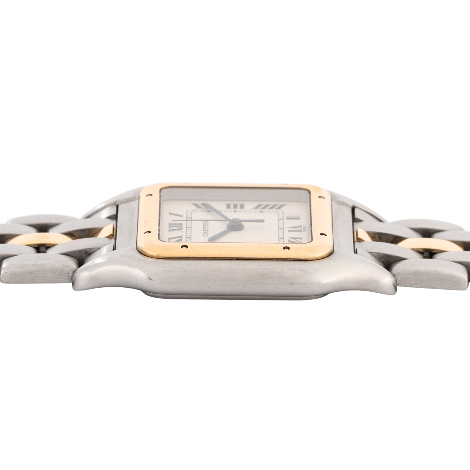 CARTIER Panthère Ref. 1100 Ladies' watch circa 1990s. Stainless steel/18K yellow gold. Quartz movement Cal. 87 with a new battery in working condition. Dial with blued hands, Roman numerals, and date display at 5 o’clock. Steel/gold link bracelet 1-row with folding clasp. Good condition, slight signs of wear on the bracelet and case. Diameter approx. 26.5 mm, measured without crown. Fits wrist circumference up to approx. 18.5 cm.