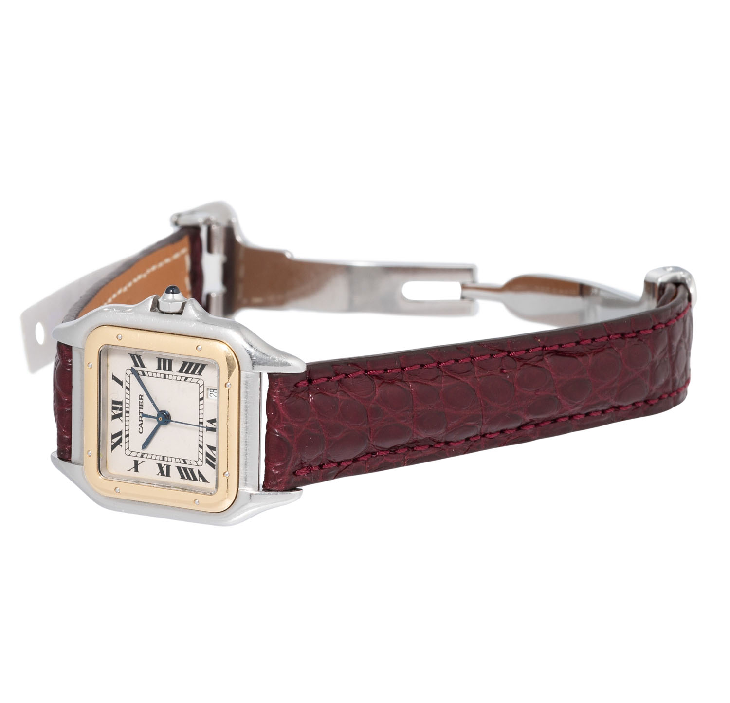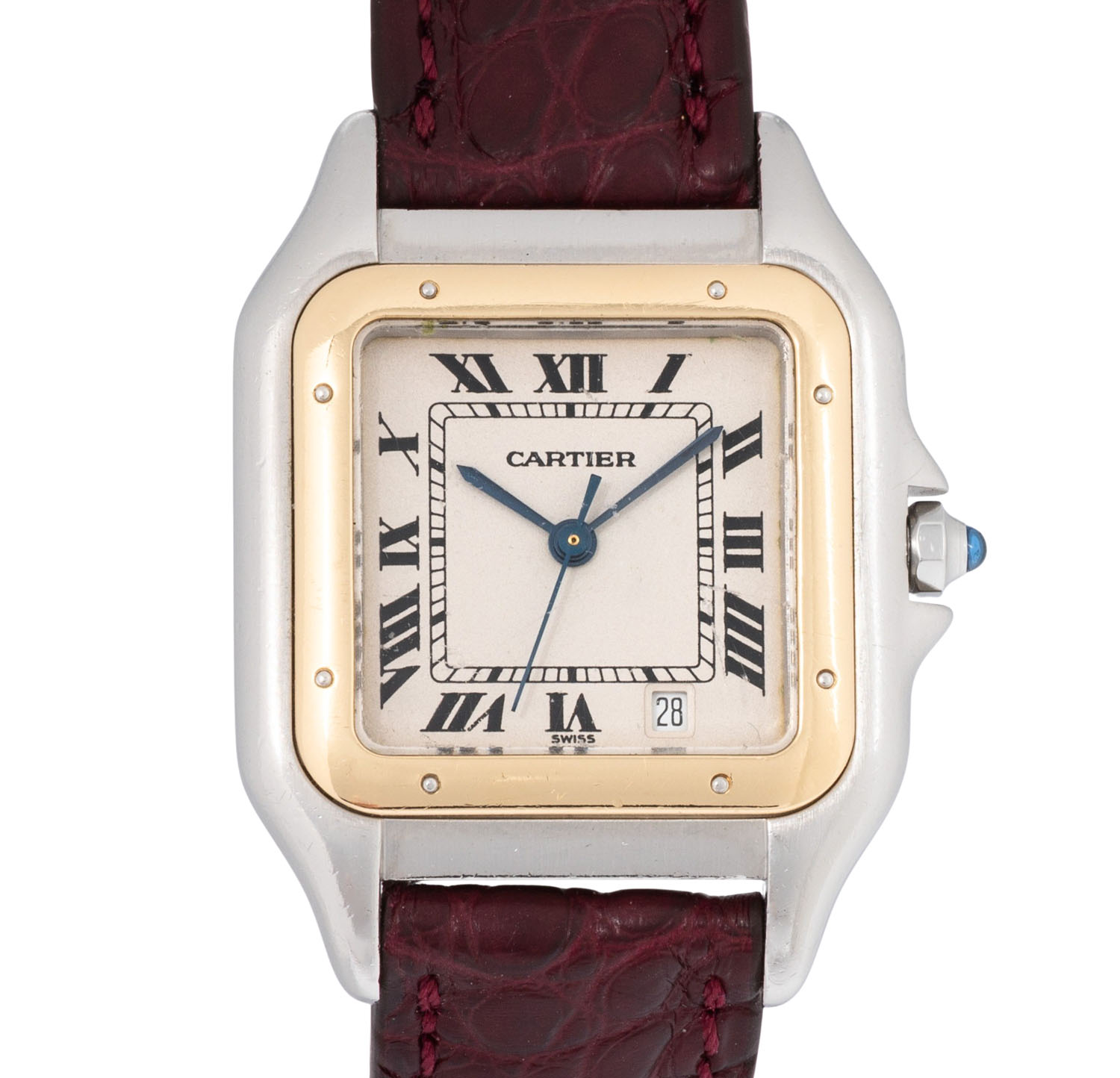 CARTIER Panthère ref. 1100 ladies' wristwatch, approx. 90s. Stainless steel/18K yellow gold, crown with blue spinel cabochon. Quartz movement Cal. 087 with new battery. Ivory-colored dial with Roman numerals, railroad minute track, blued sword hands, and date display. New brown leather strap with original Cartier stainless steel folding clasp. Pre-owned with signs of wear on the case and clasp. Diameter approx. 27 mm measured without crown.