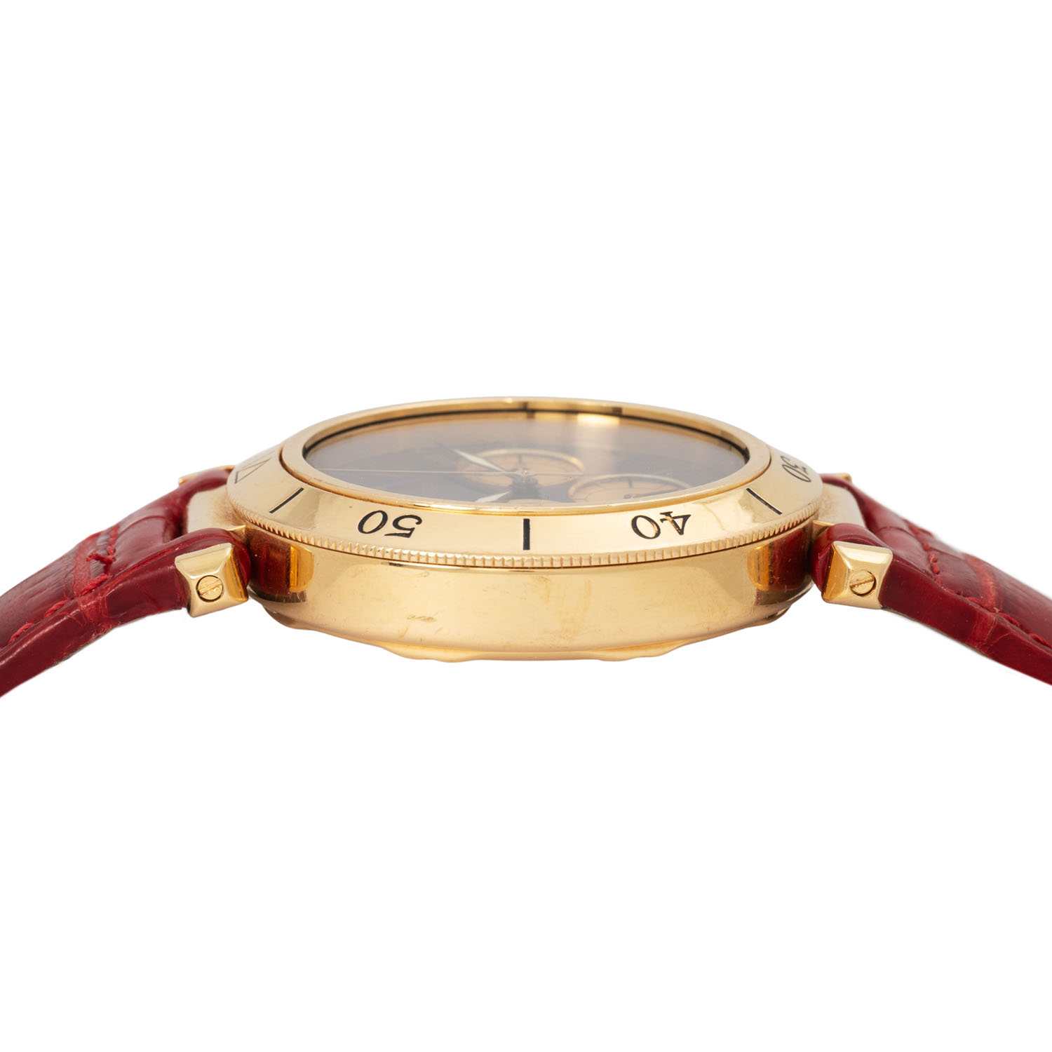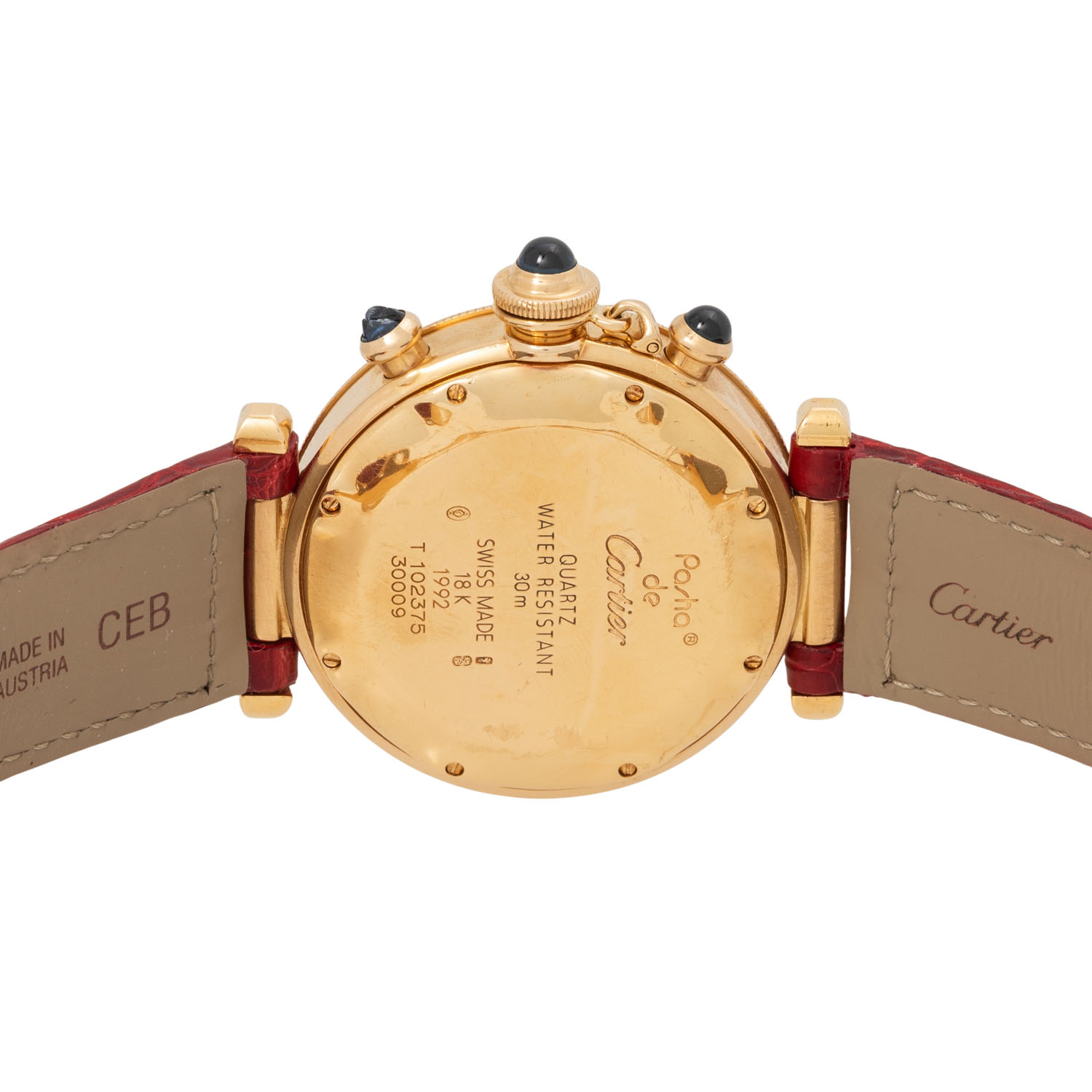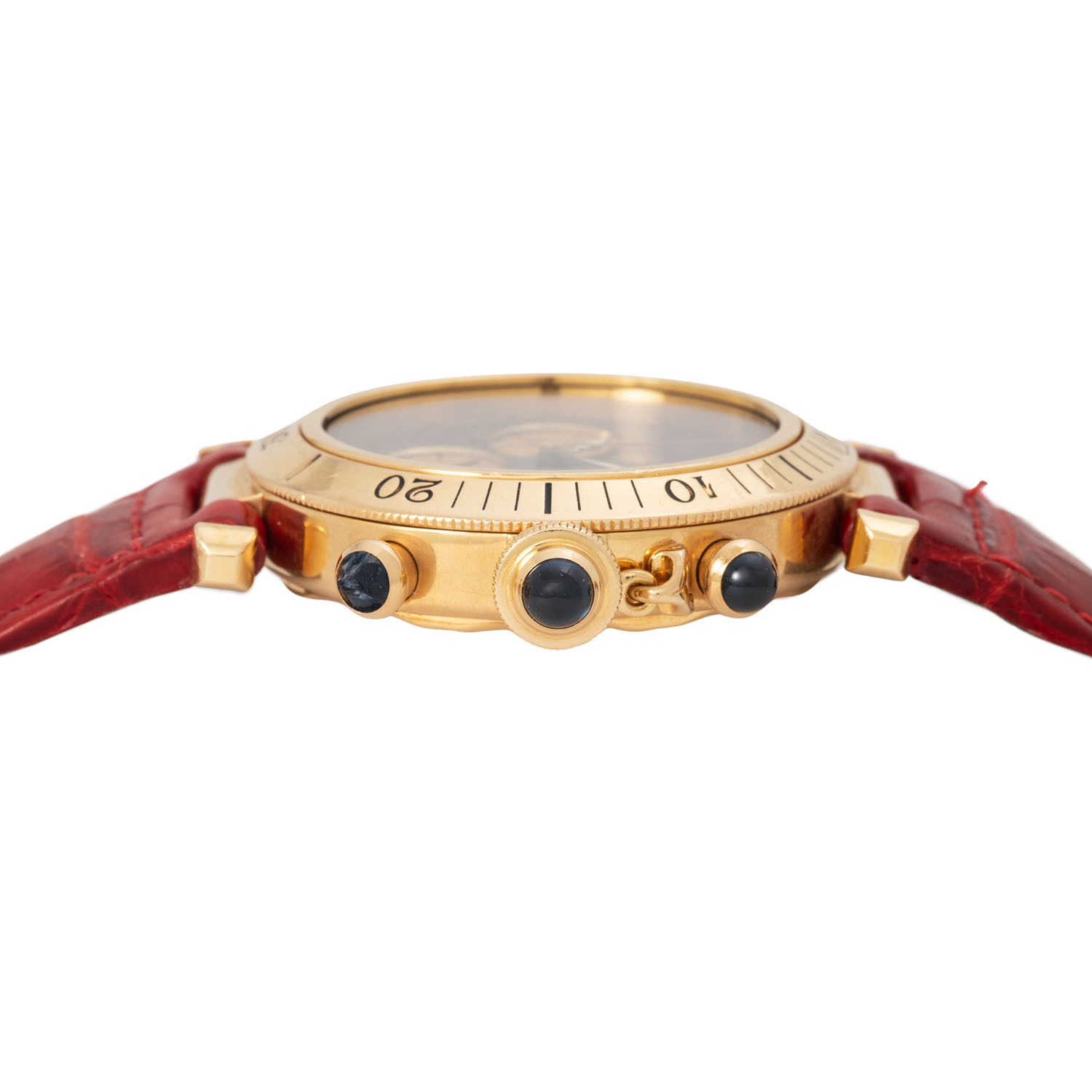 CARTIER Pasha Chronograph ref. 30009 men's wristwatch from 1992. 18k yellow gold, screwed crown guard and pushers with blue sapphire cabachons, serial no° T102375. Quartz movement with new battery, movement running. Blue dial with Roman numerals, three golden subdials, date display, center stop seconds and railroad minute track. Red original Cartier leather strap in mint condition with 18k yellow gold Cartier folding clasp. Used condition, visible signs of wear. Diameter approx. 38 mm measured without crown.