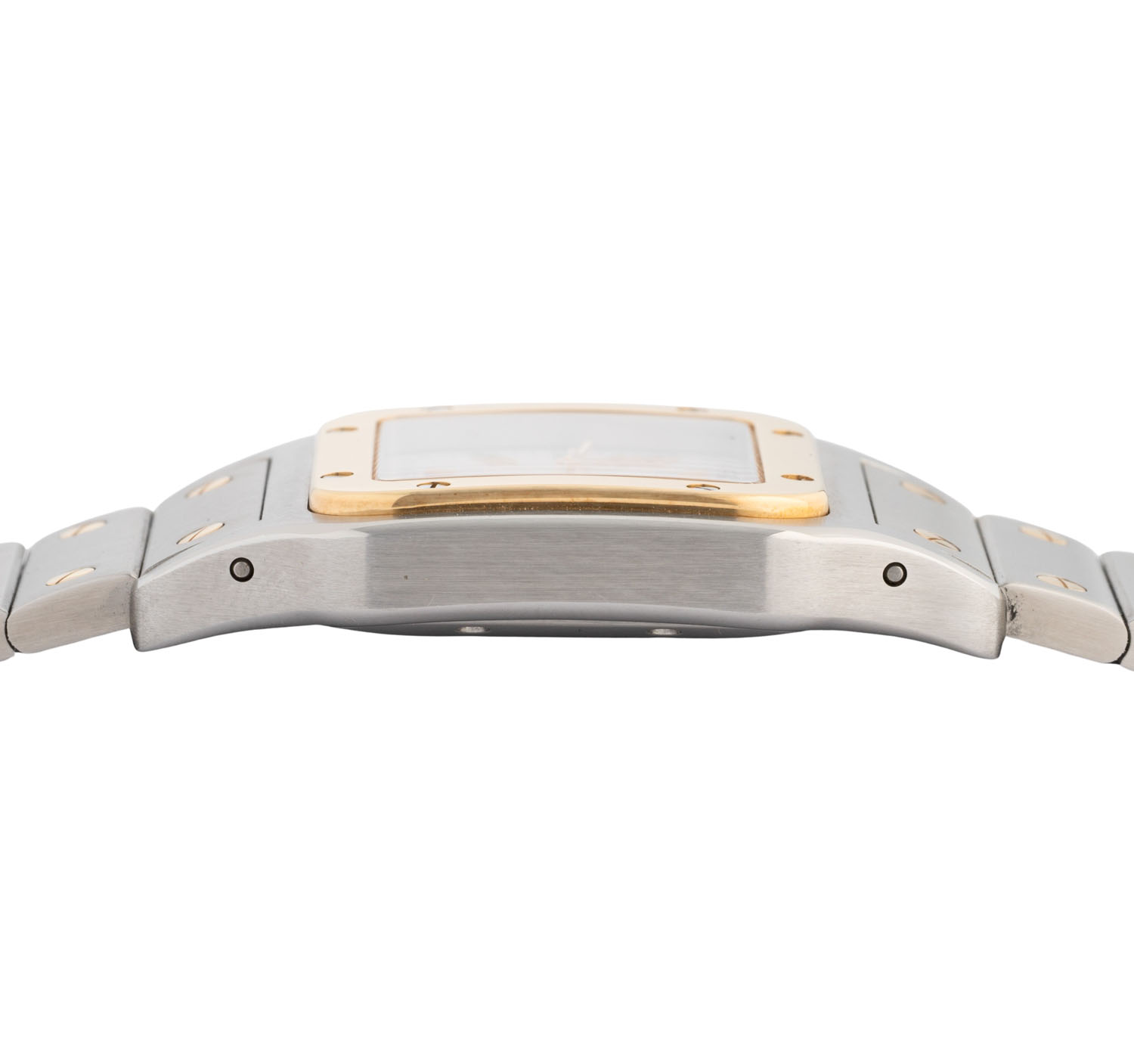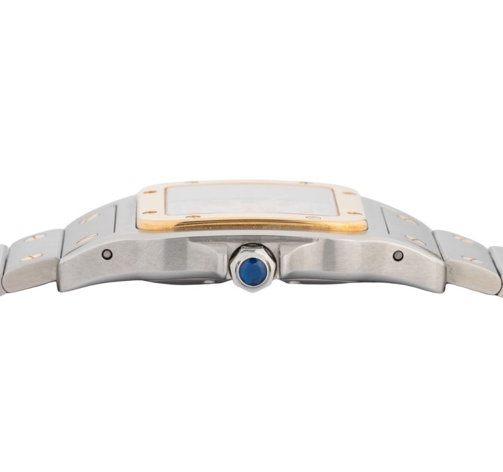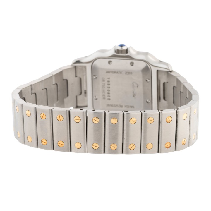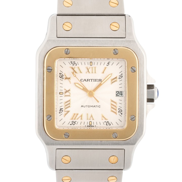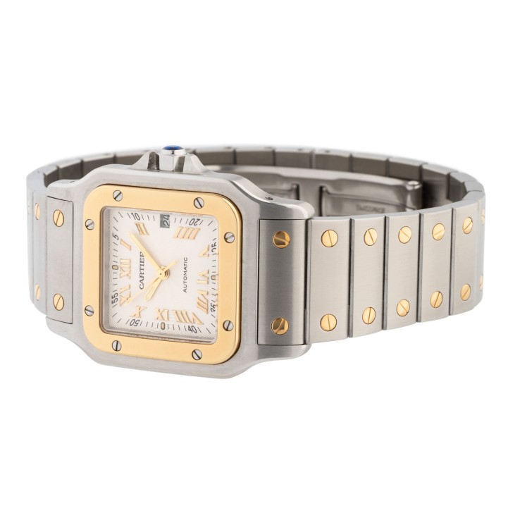 CARTIER Santos Galbee Ref 2319 men's watch from 1999. Box and papers. Stainless steel / 18K yellow gold. Serial number 755508CC. Automatic movement caliber 120 with very good performance (+3 s/d. 327° amplitude). White guilloché tritium dial with applied Roman indices and date display. 18K yellow gold bezel. Crown with blue sapphire cabochon. Cartier bracelet in stainless steel / gold with folding clasp. Very good condition with slight signs of wear. Original box. Cartier folder, instructions, dealer directory, and warranty booklet including warranty certificate included. Purchased in August 1999 from jeweler Brogle in Esslingen. Diameter approx. 29 mm (measured without crown). Suitable for wrist sizes up to approx. 18.5 cm.