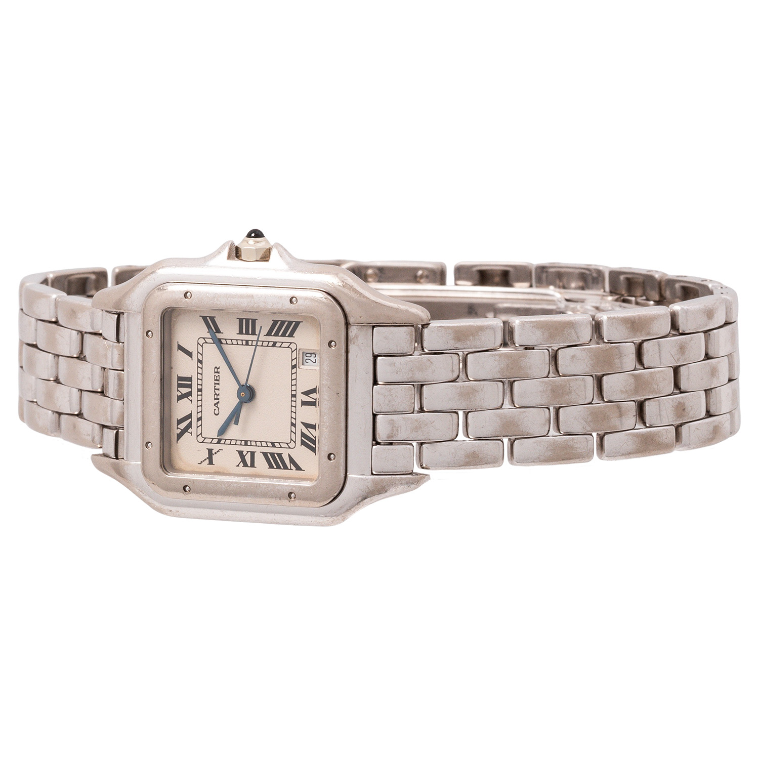 CARTIER very rare Vintage MM Panthere wrist watch, ref. 383955. Approx. 1980s. White gold 18K, very rare execution. Quartz movement with new battery, working. Eggshell colored dial with roman numerals and date display, blued hands. Original Cartier bracelet with butterfly folding clasp in white gold 18K. Visible signs of wear on case and bracelet. Diameter approx. 26.5mm measured without crown, suitable for approx. 18.5cm wrist size.
