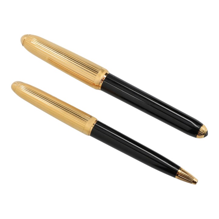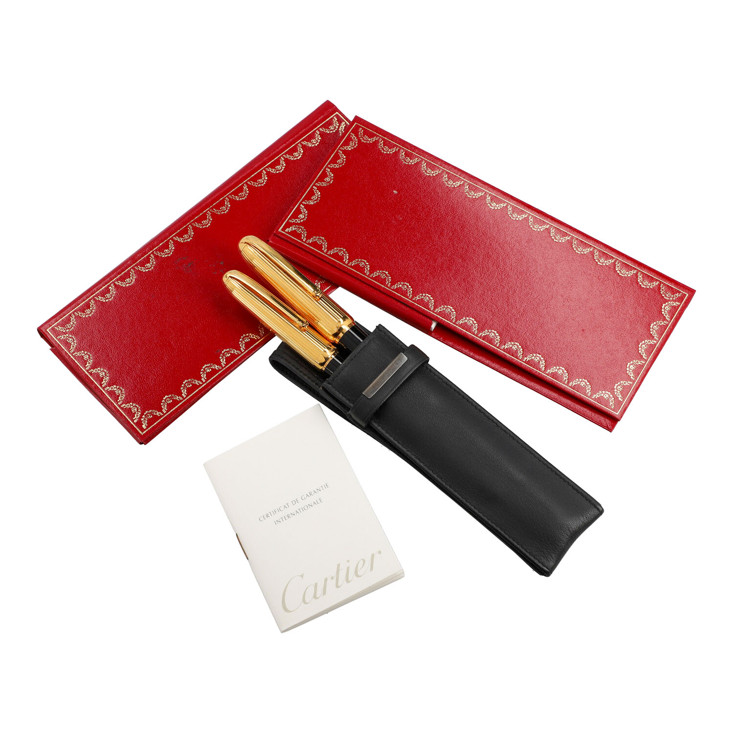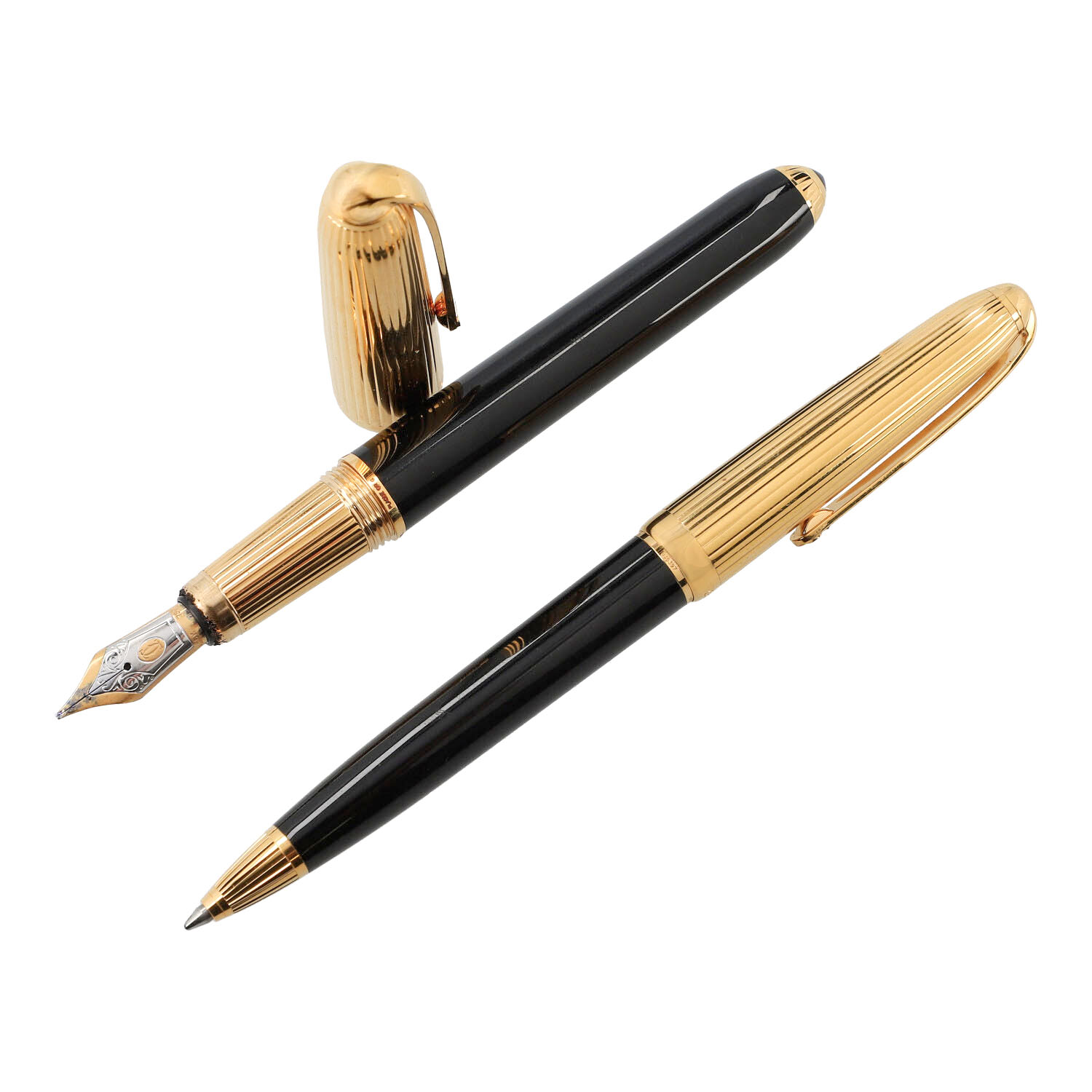 CARTIER writing set ‘LOUIS’. Set consisting of a biro and a fountain pen with gold-plated hardware and black china lacquer. Various accessories and a leather case from Porsche enclosed. Signs of use present.