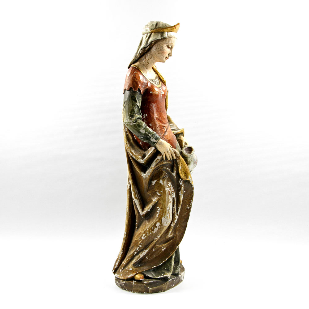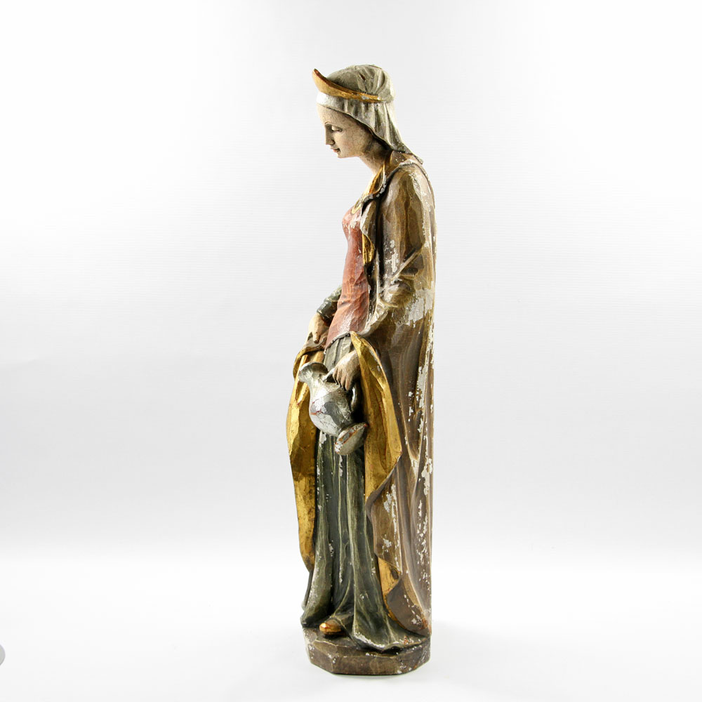 Burgfrau mit Krug 1st half 20th century, wood, painted and partly gilded, probably Oberammerg, woman with waving veil and jug, h: 70 cm. Frame dam.