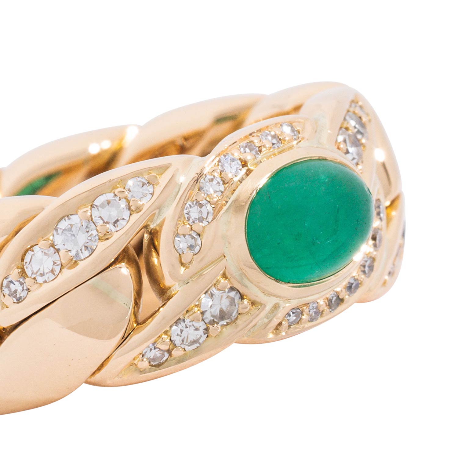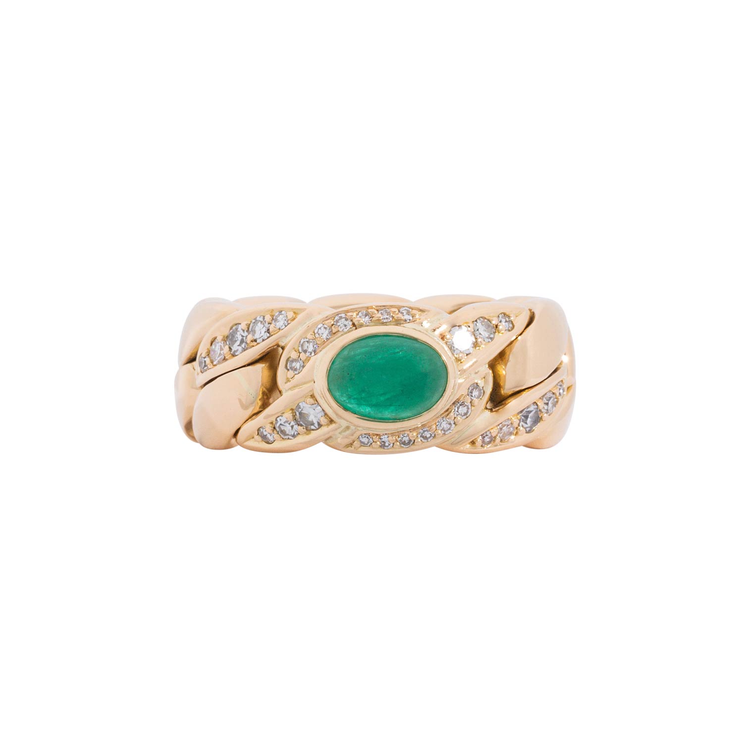 Chainring with oval emerald cabochon, ap. 7 x 5 mm, 30 single cut diamonds, totalling ap. 0.25 ct, good colour and clarity, 18K yellow gold, 18.8 g, ring size 56, late 20th century, minor signs of wear.