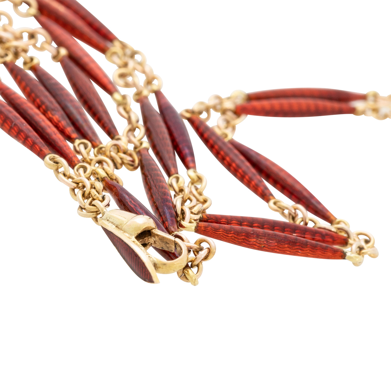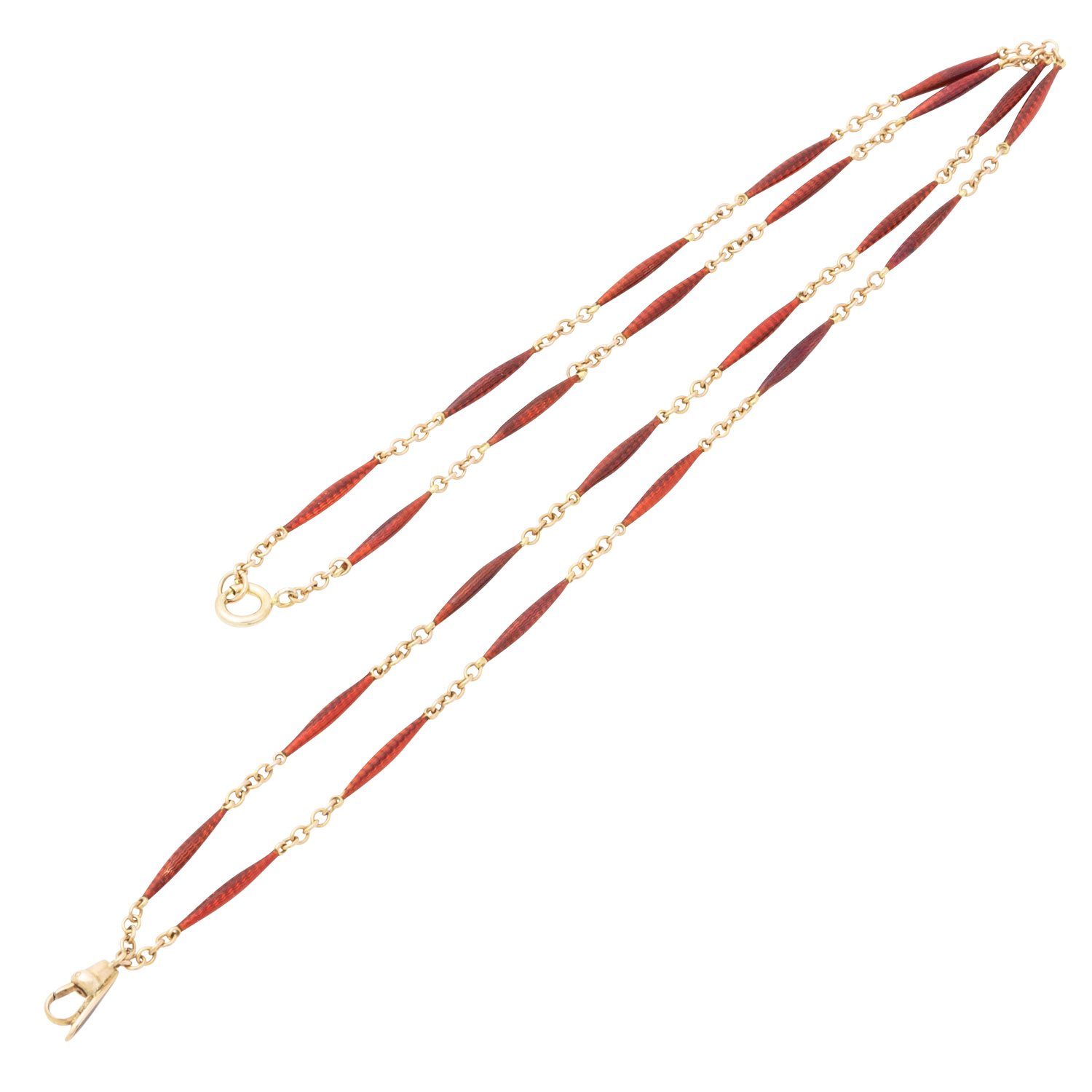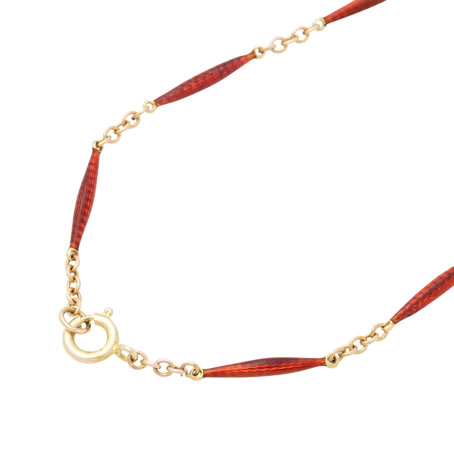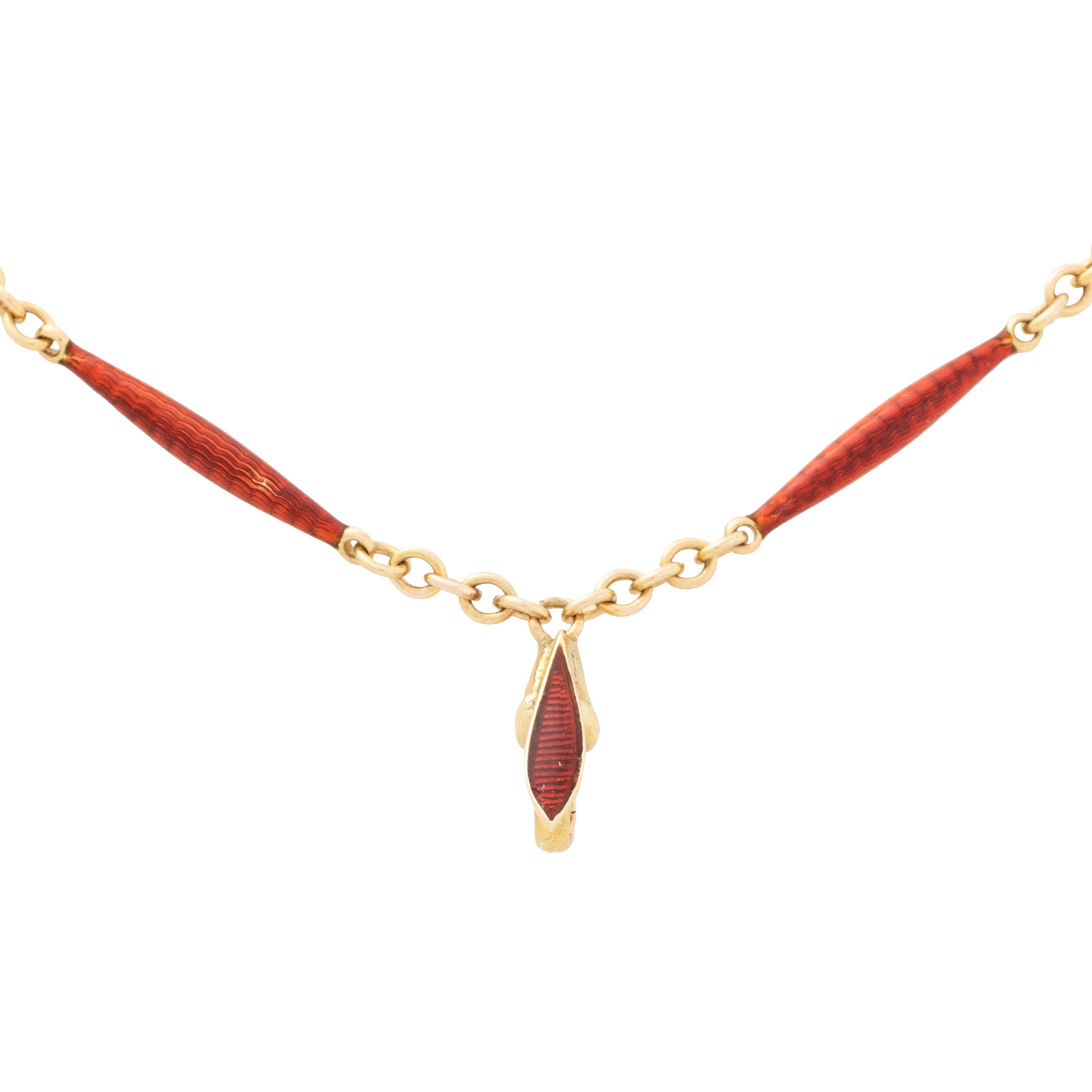 Necklace with interlinks, transparent red coated (probably Colorit), 9K yellow gold, 8.7 g, L: 55,5 cm, spring ring, in addition in center covered carabiner clasp for pendant, late 20th century, minimal signs of wear.