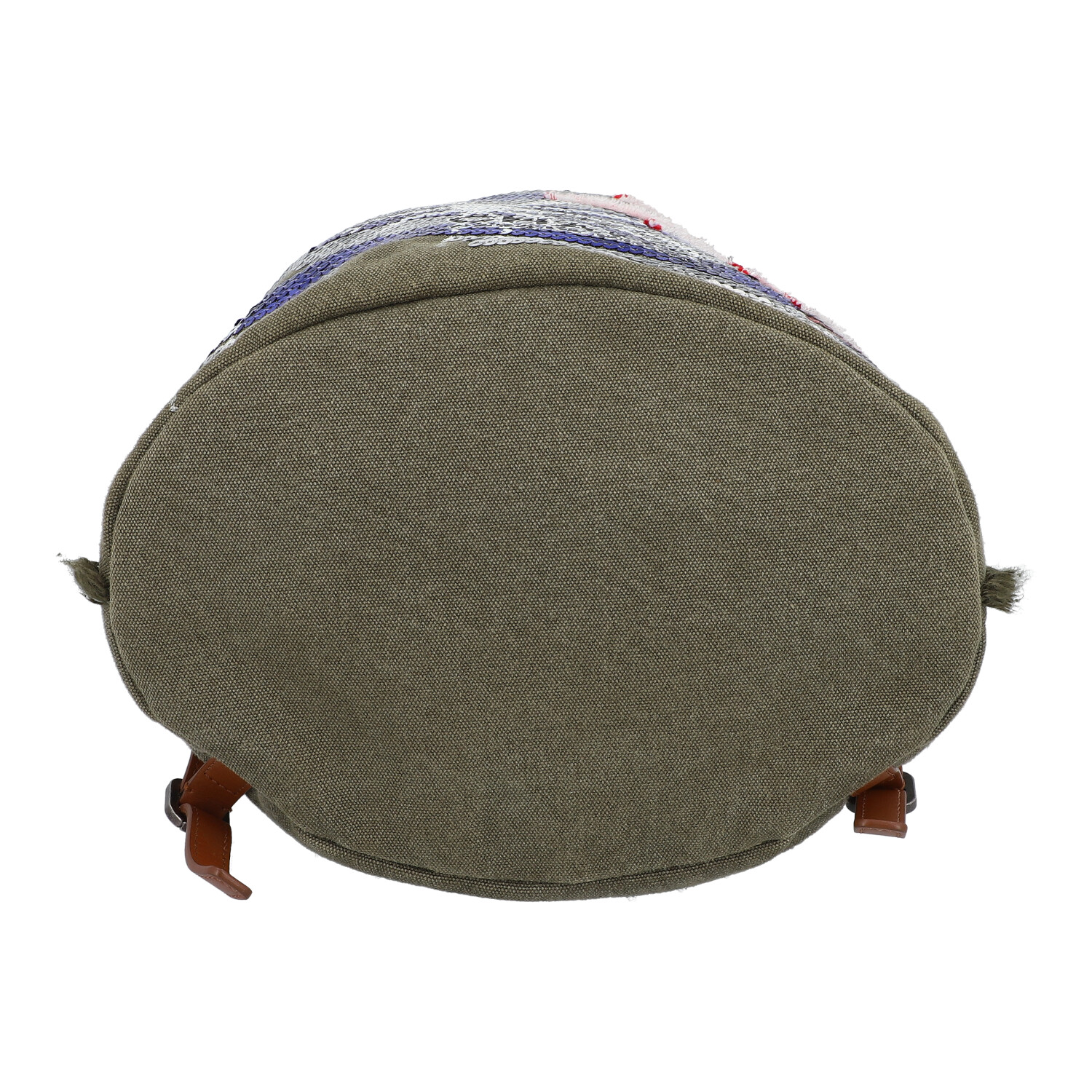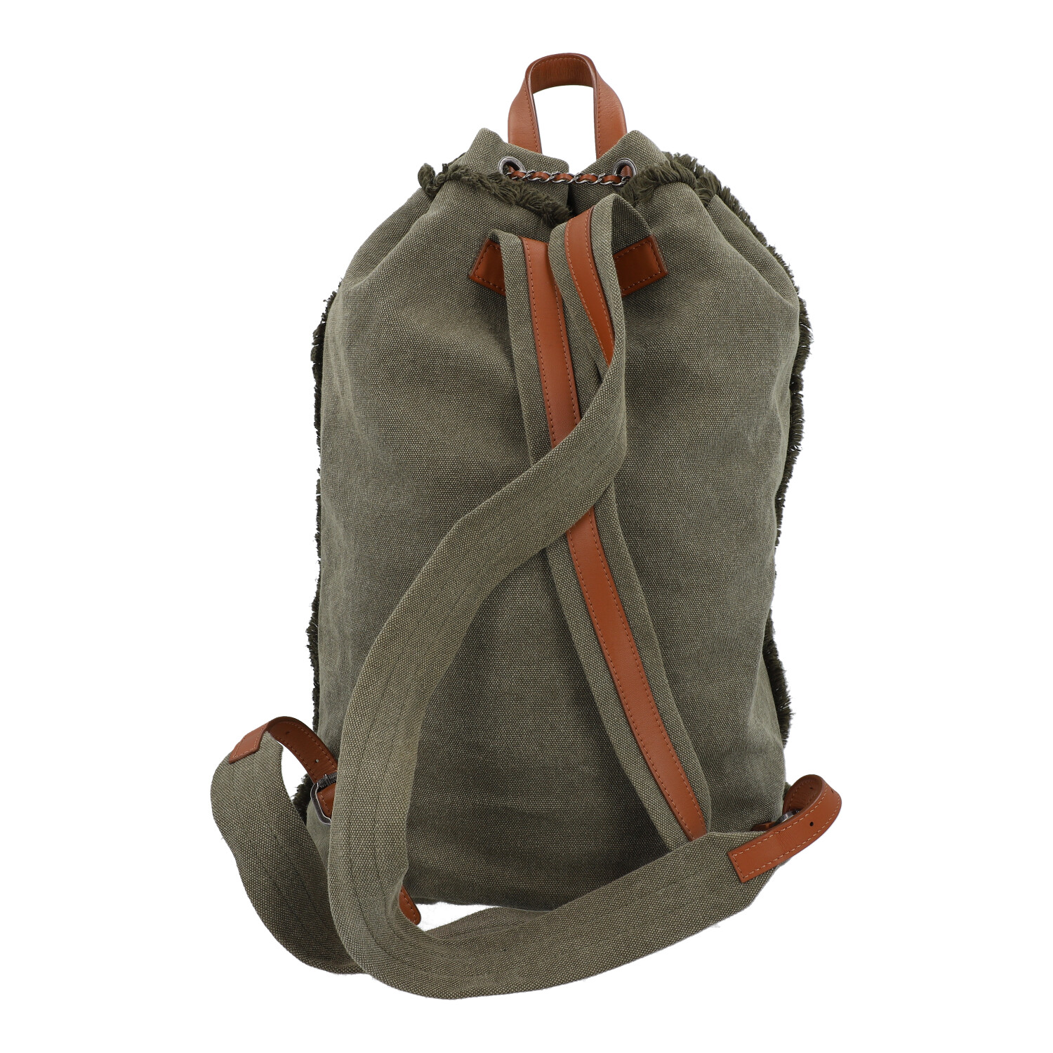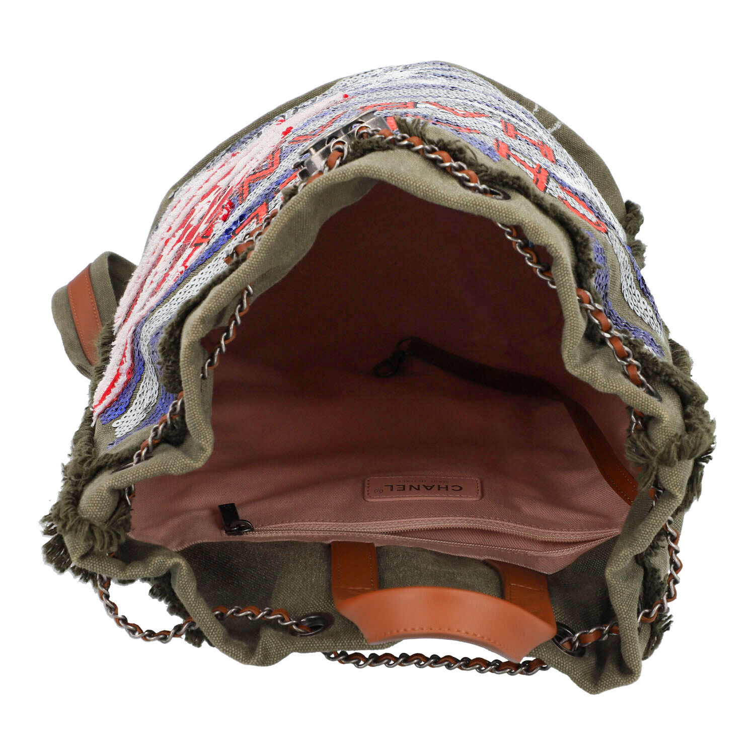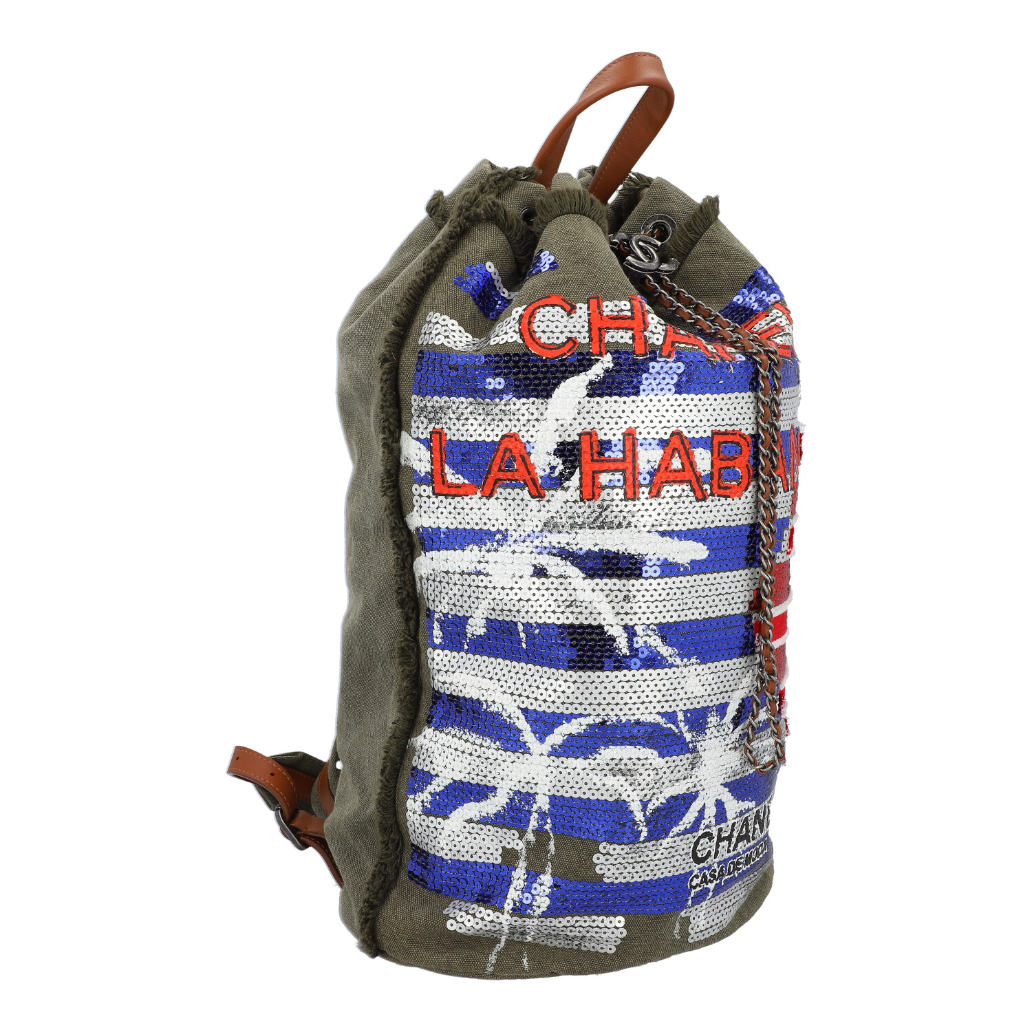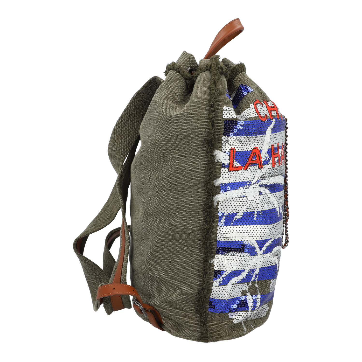 CHANEL backpack 'LA HABANA', coll.: 2016-2017. Green canvas with grey hardware, sequin trim and brown leather details. Chain interwoven with leather as a drawstring, handle and shoulder strap. Pink interior with two zip compartments. ID card. Good condition. 25.5 x 19 x 38 cm.