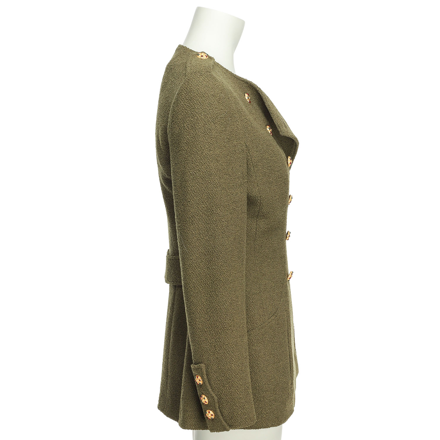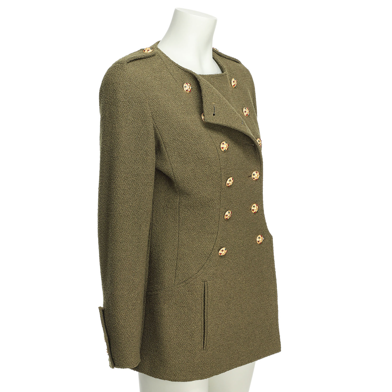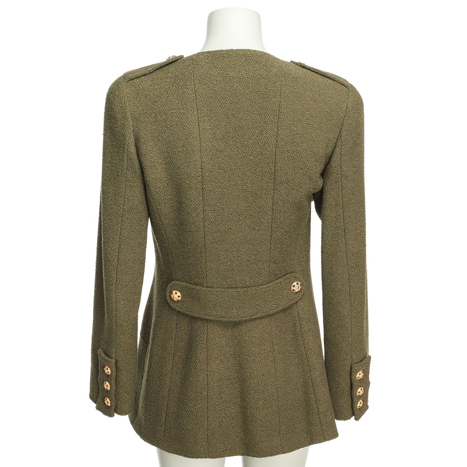 CHANEL BOUTIQUE VINTAGE jacket, size 36, coll: Autumn 1996. Olive green double-breasted model with Gripoix buttons, slit pockets and tabs on the shoulder: labels removed except for the label on the neck. Signs of wear present.