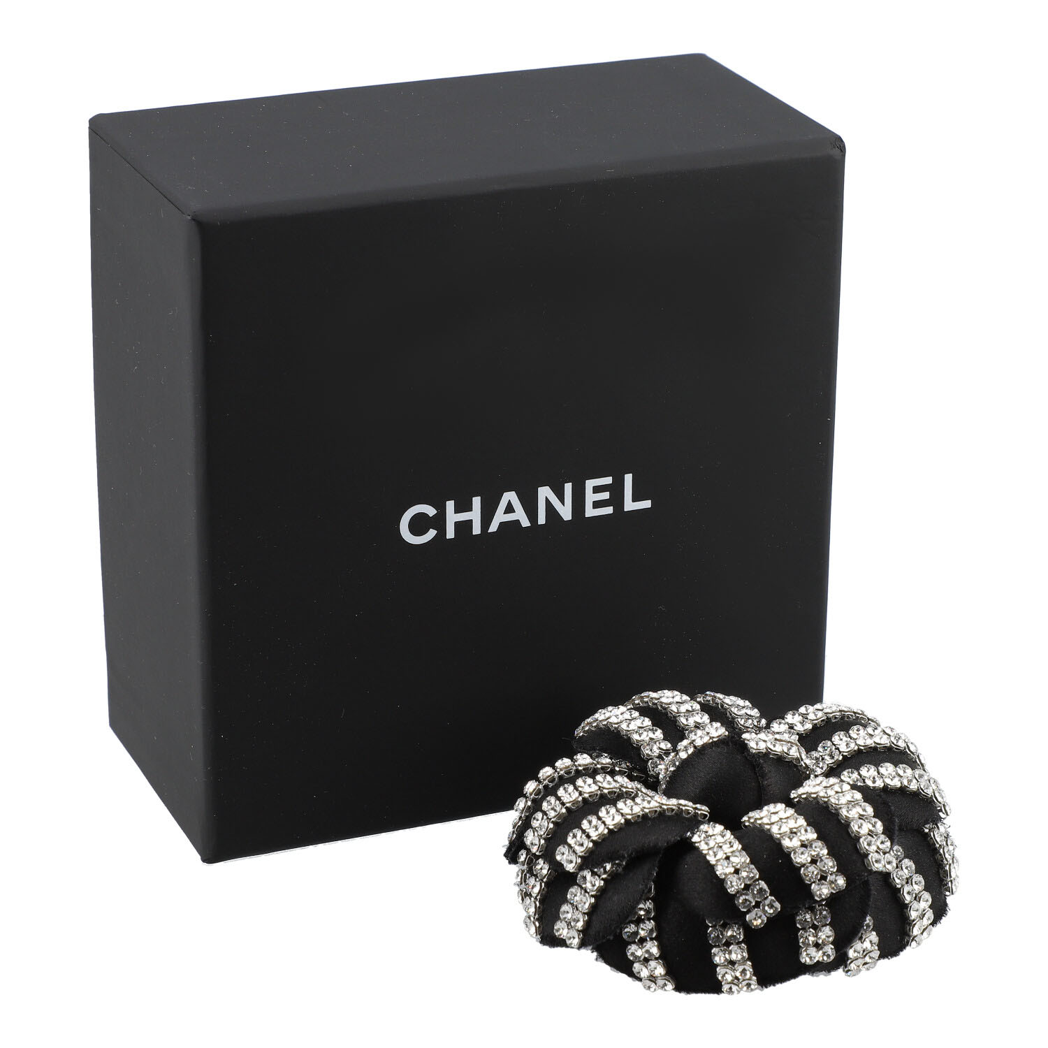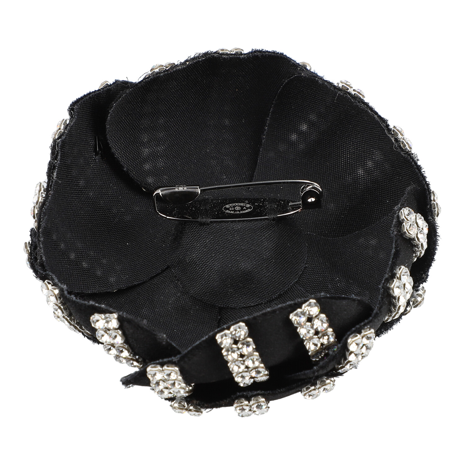 CHANEL brooch 'KAMELIE', coll: autumn 2023. Satin in black with rhinestone trim in silver colours. Box enclosed. Very good condition. 7 cm.