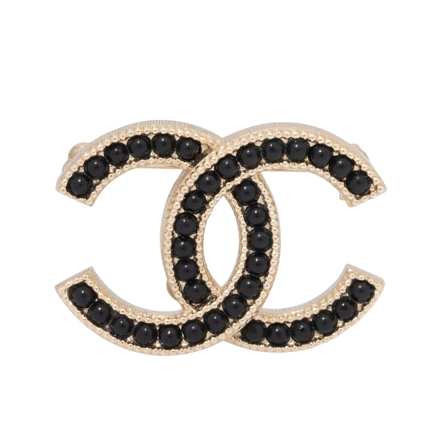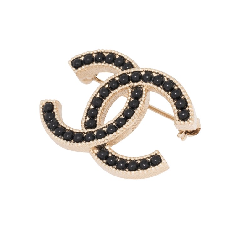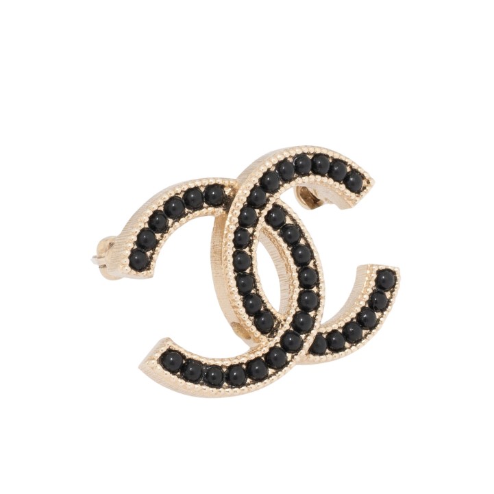 CHANEL brooch, coll.: fall 2016. Gold-coloured CC logo with black pearl decoration. Box and case included. Signs of wear present.