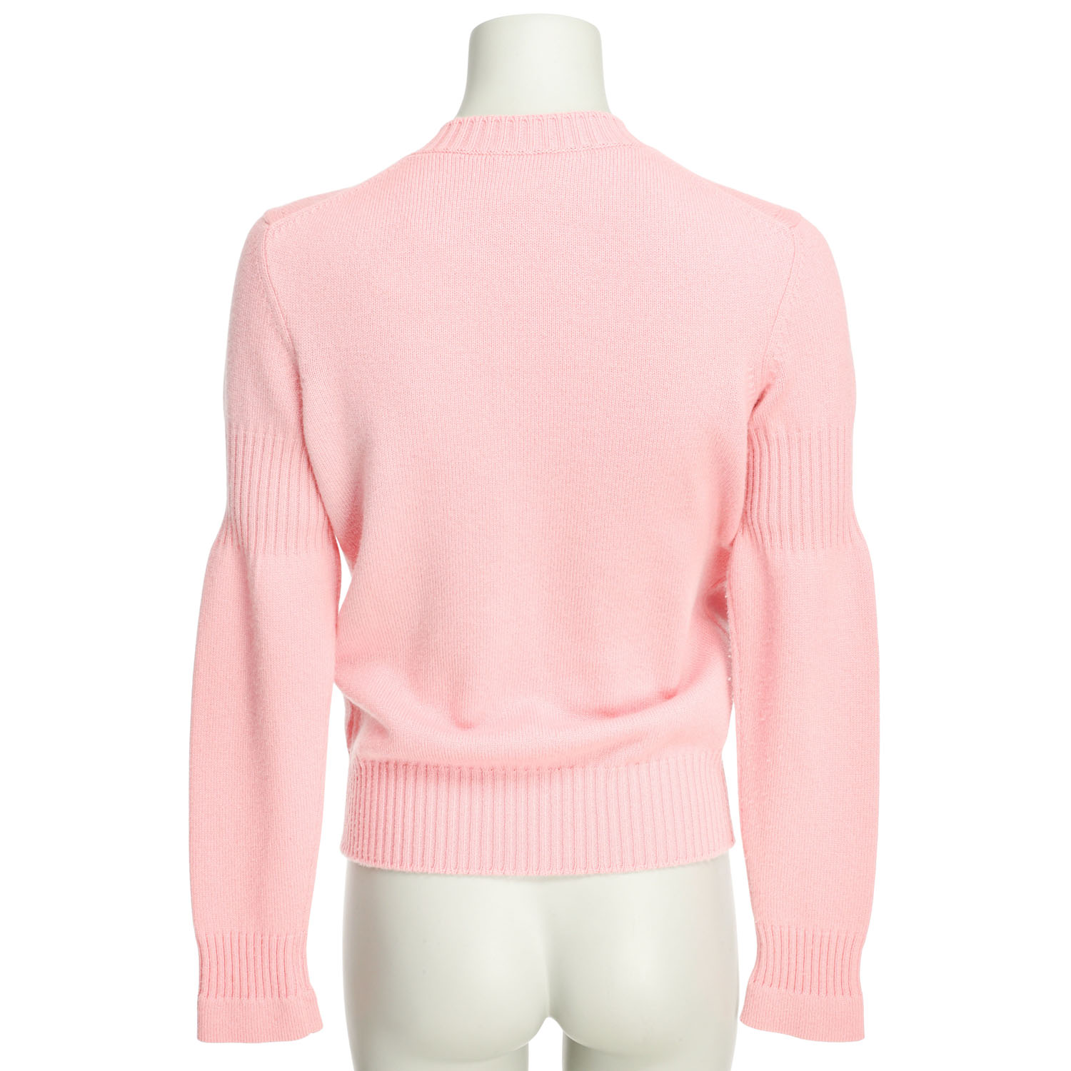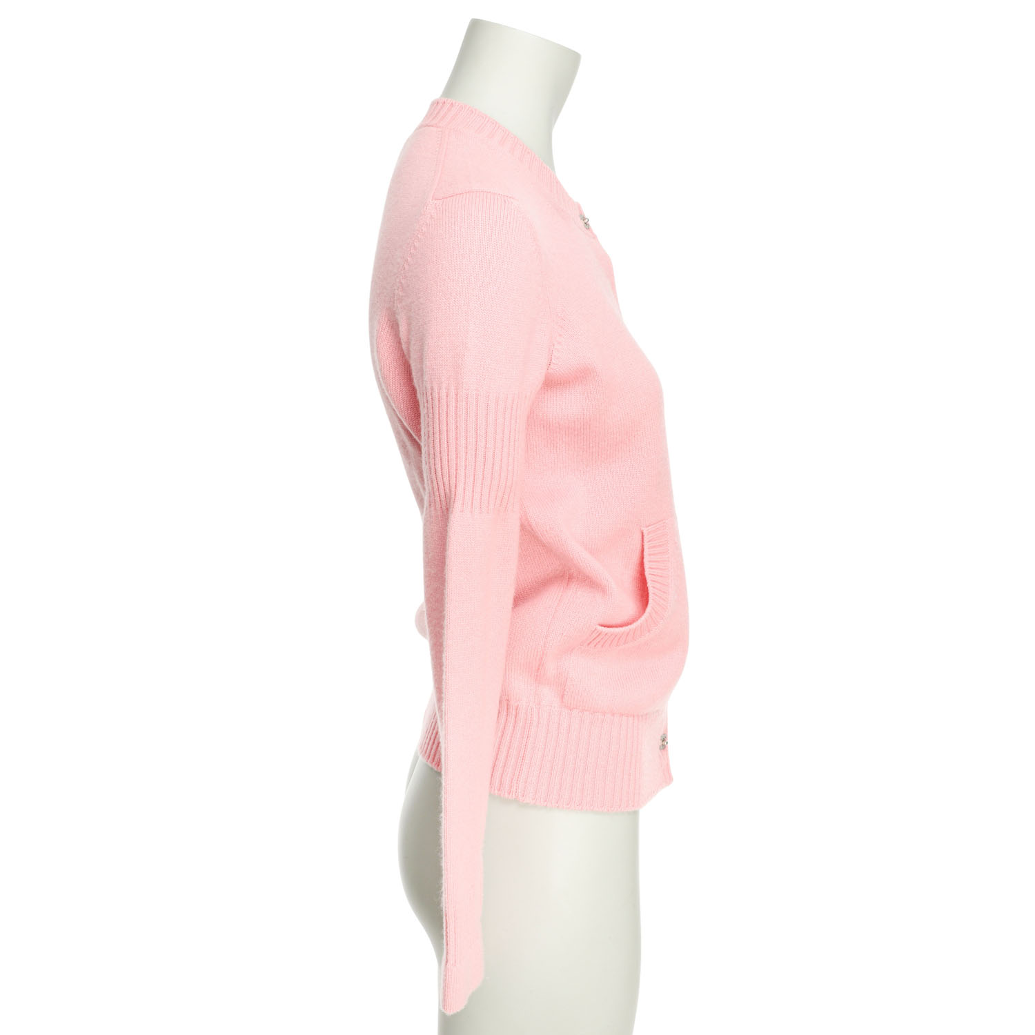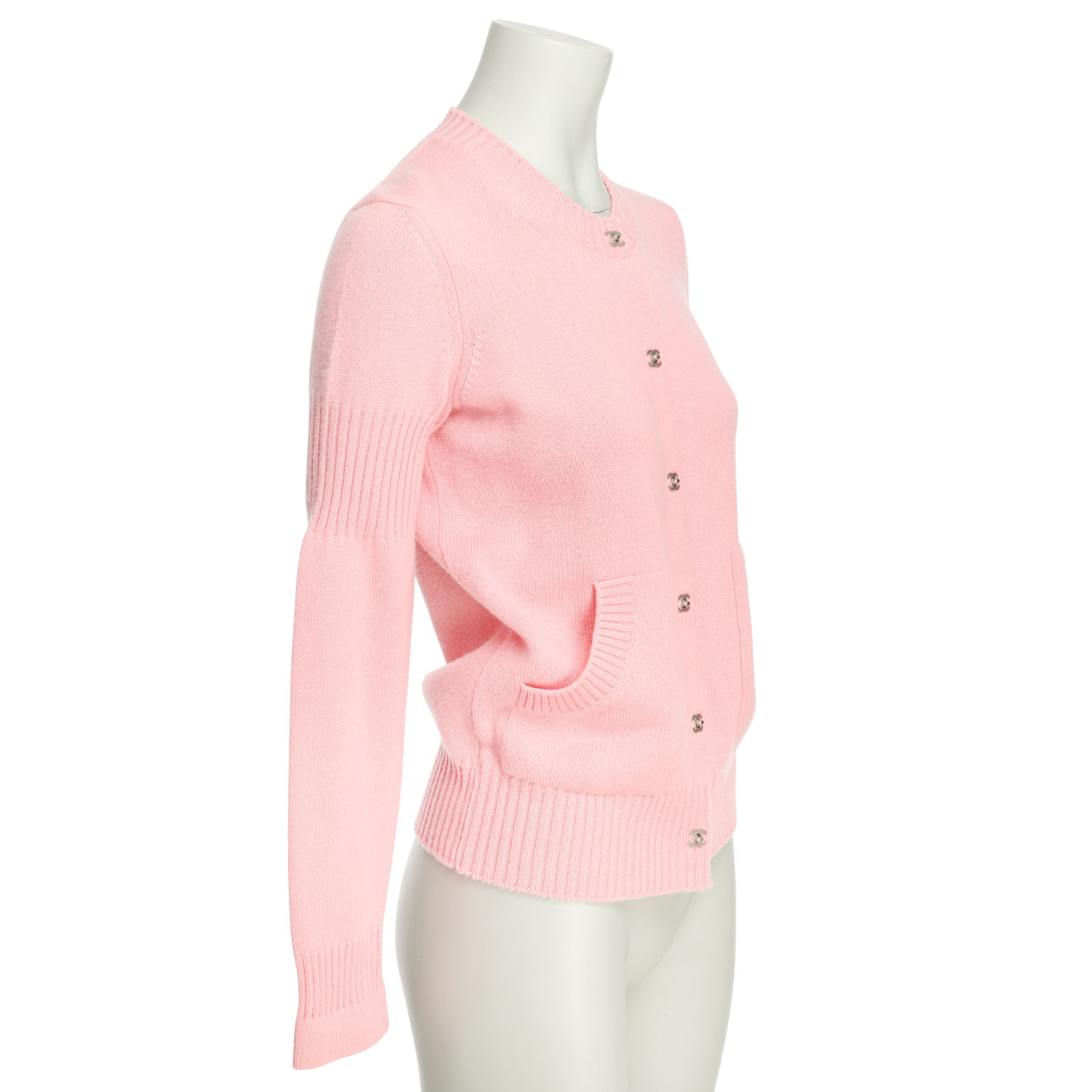 CHANEL cardigan, size 34. 100% cashmere in pink with silver-coloured CC twist fastening button placket. Classic model. Slight pilling, otherwise in good condition.