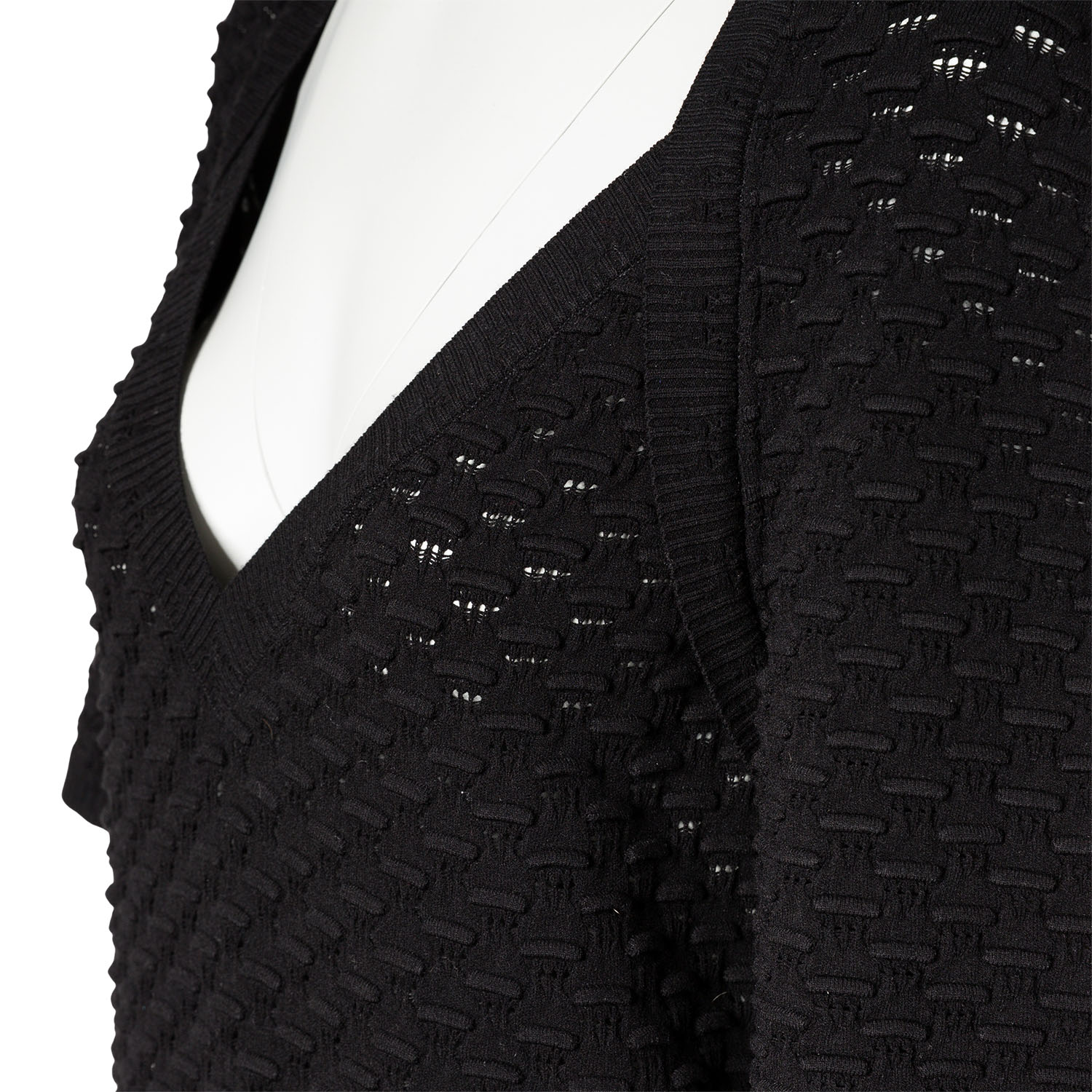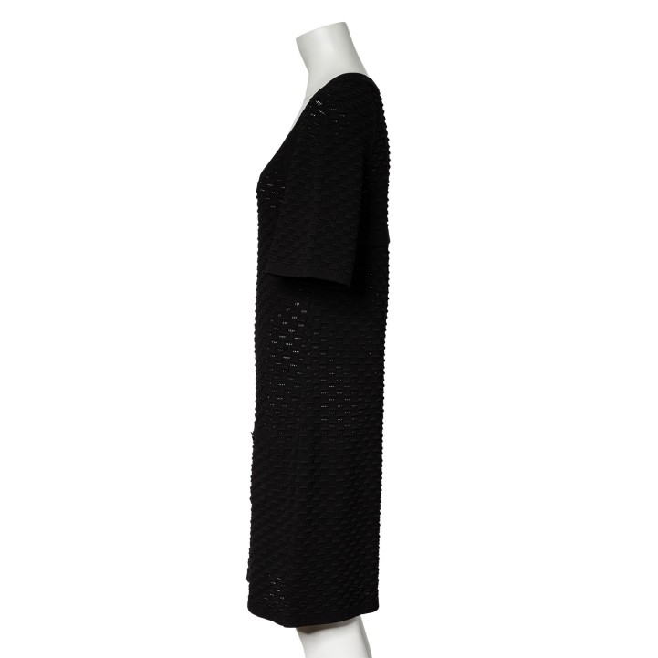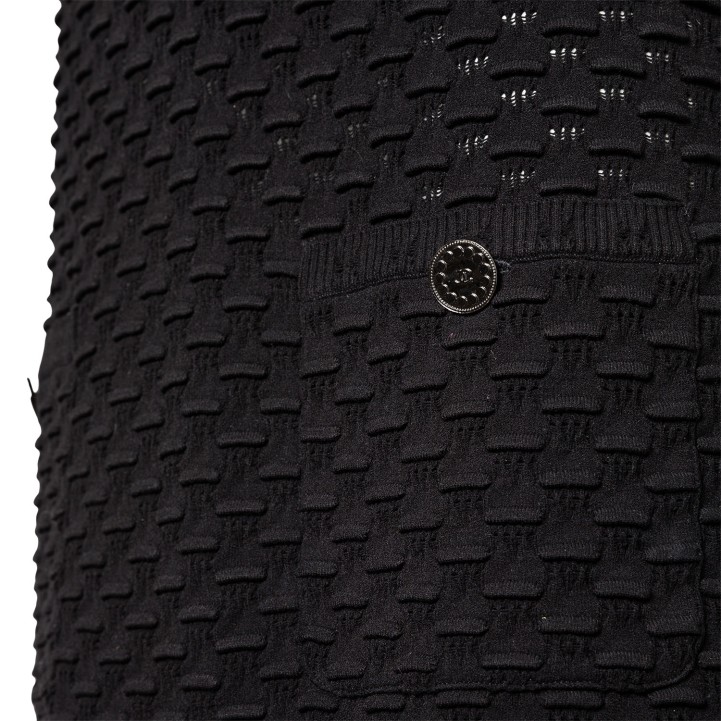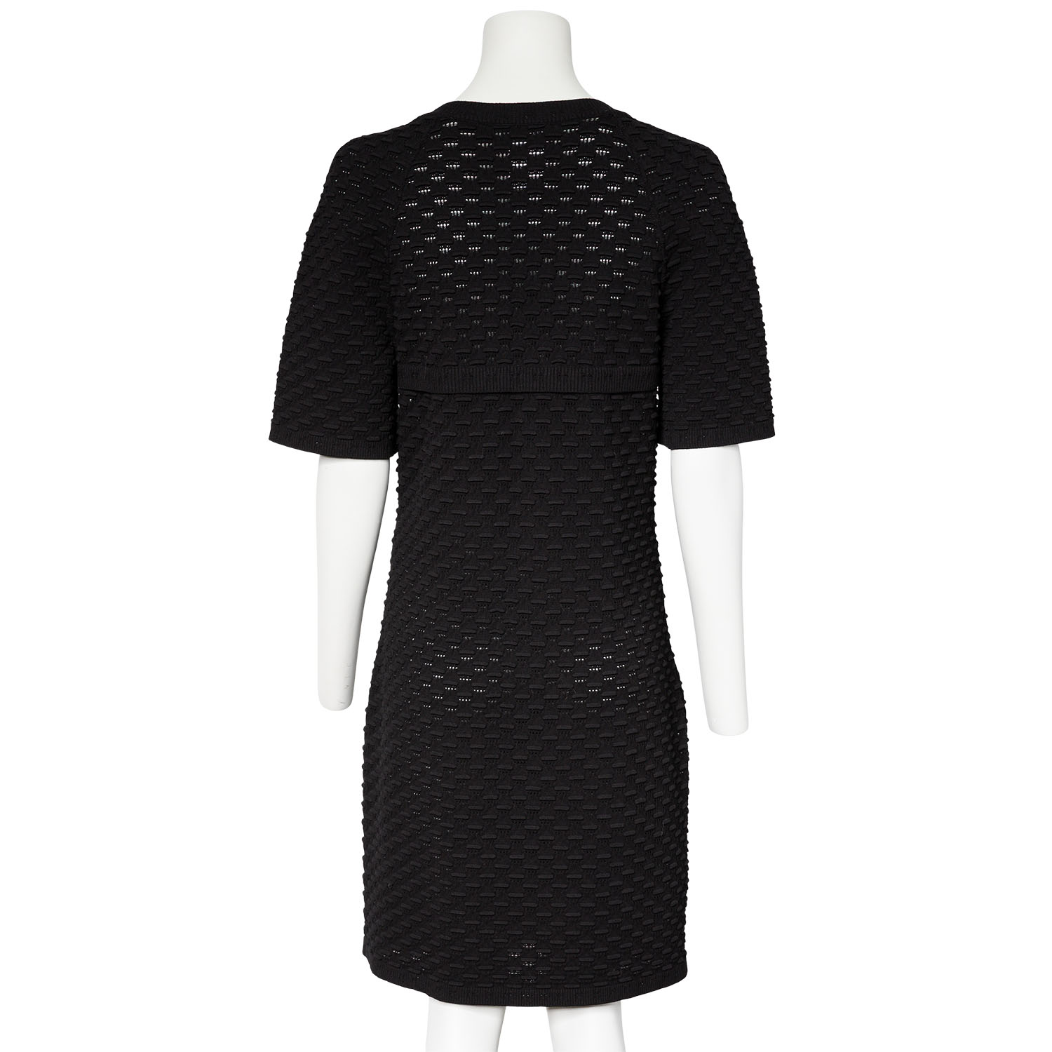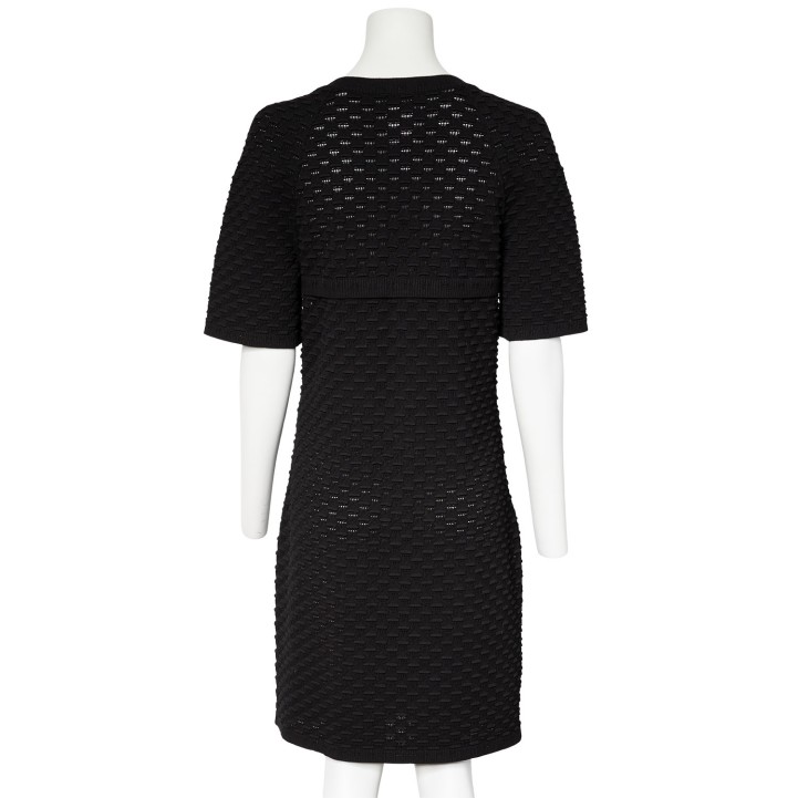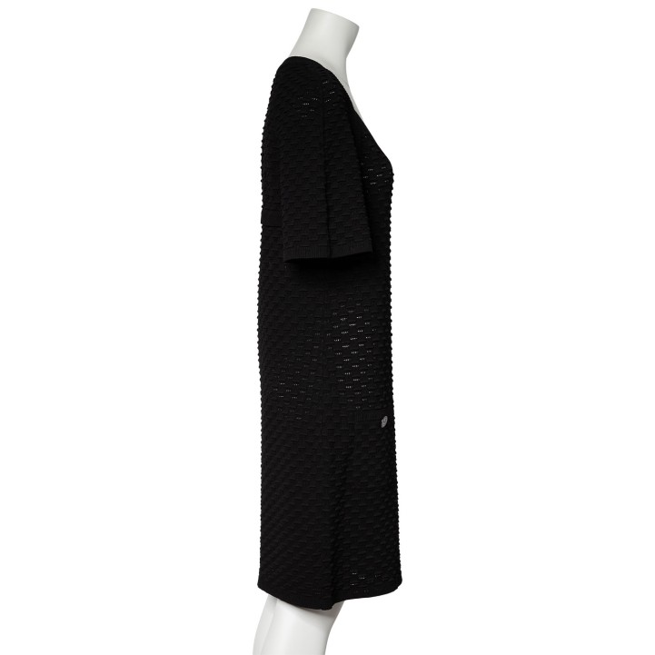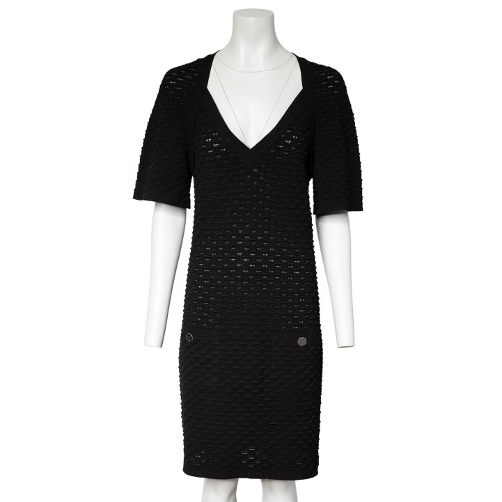 CHANEL dress, size 42 (fr. 44). Black model with decorative eyelet pattern, V-neck, patch pockets and bolero-style top. Signs of wear present.