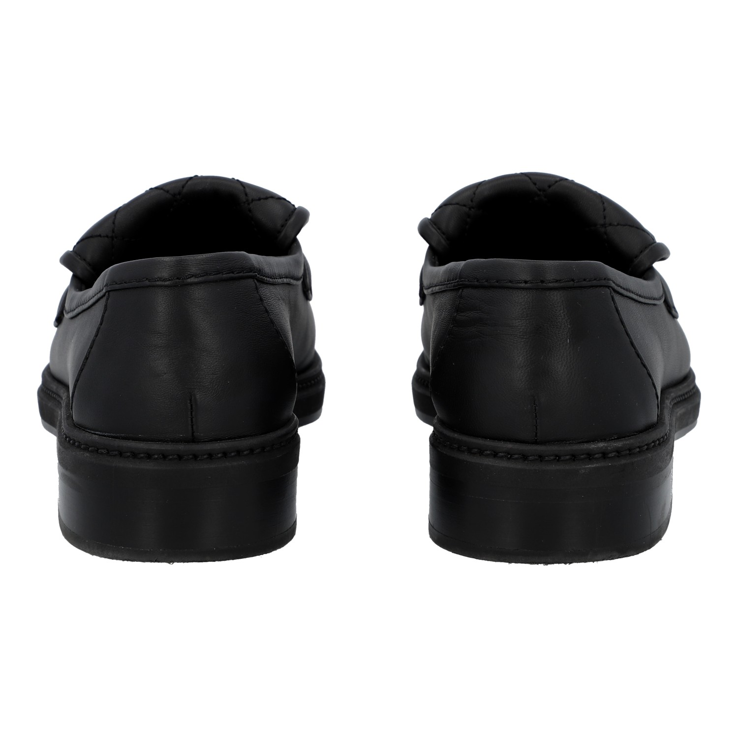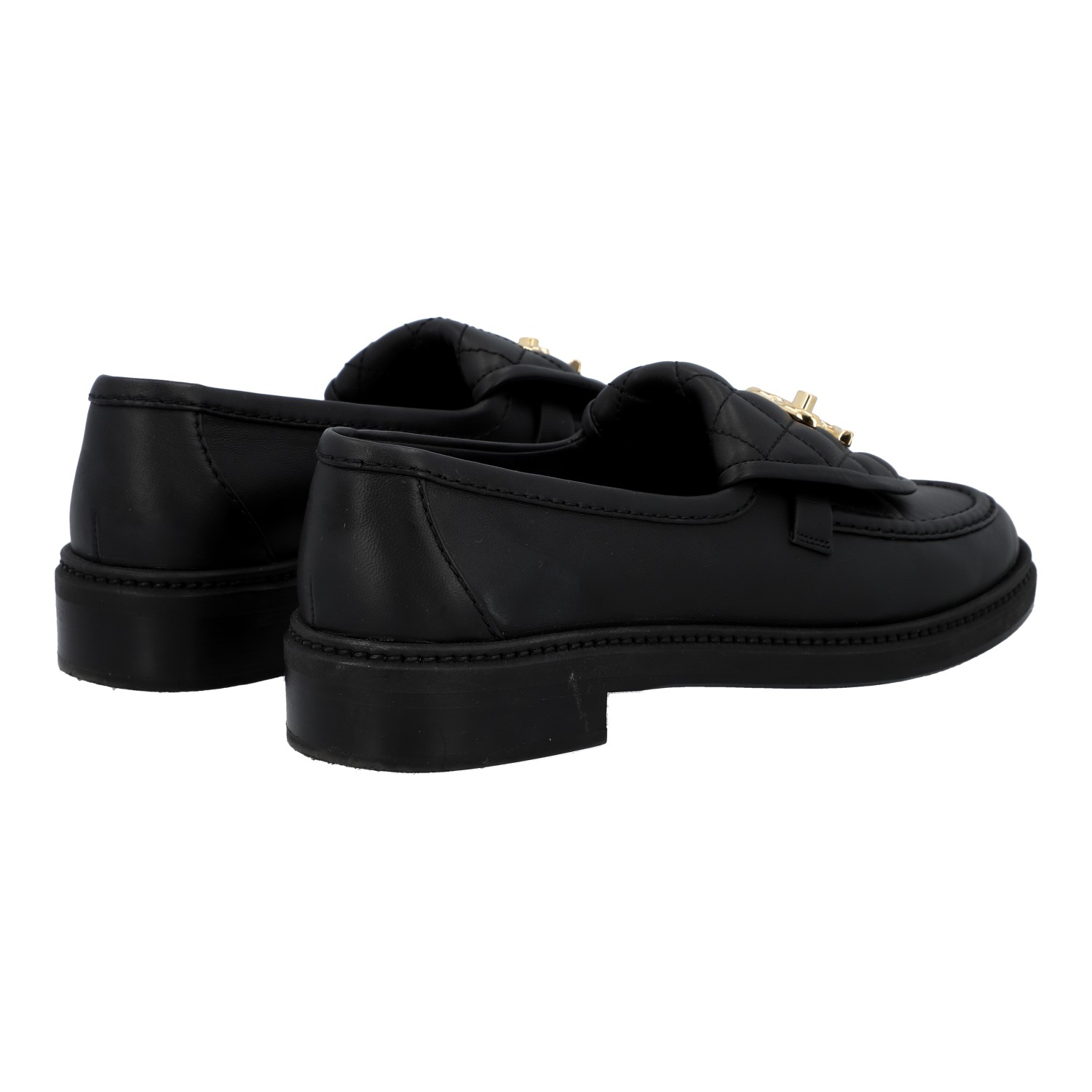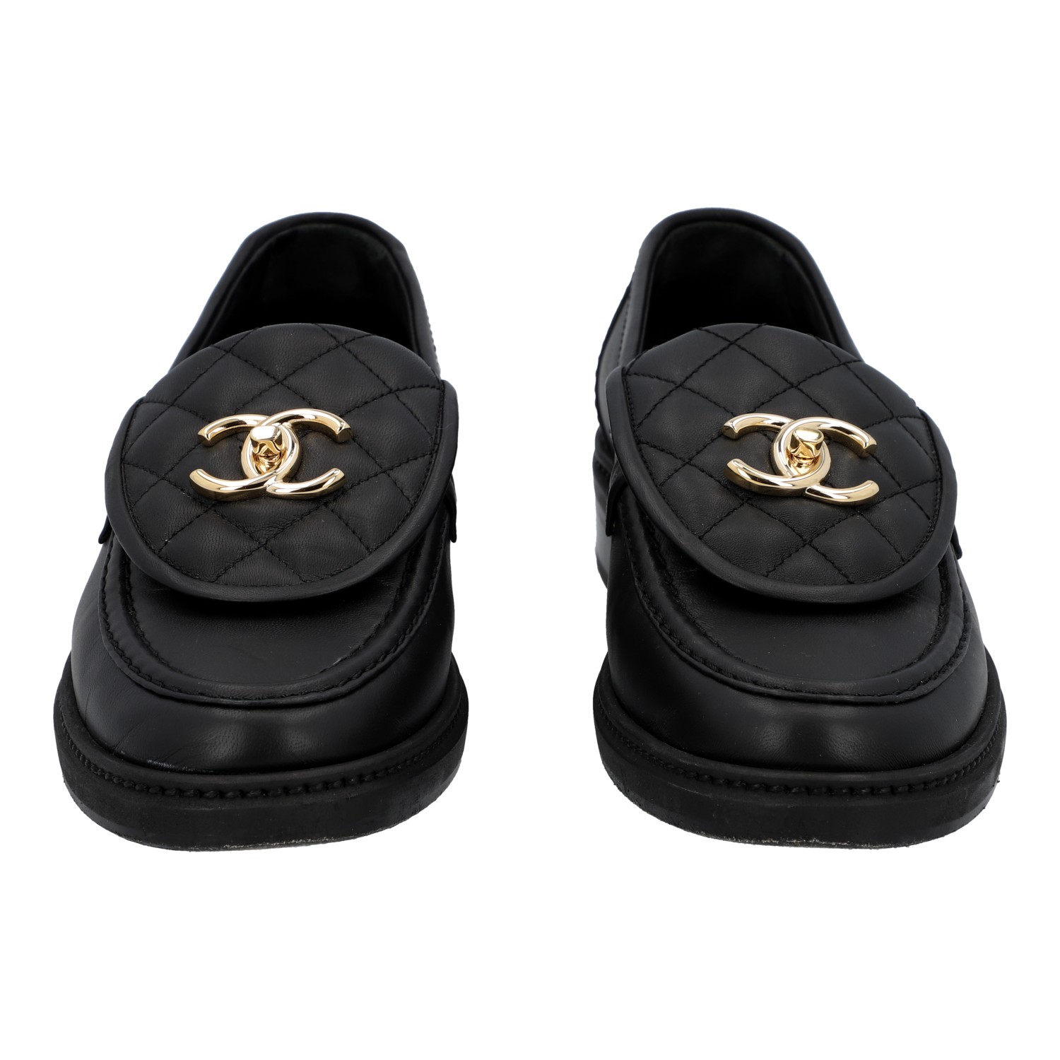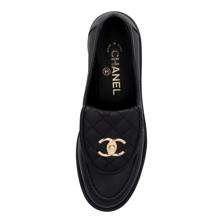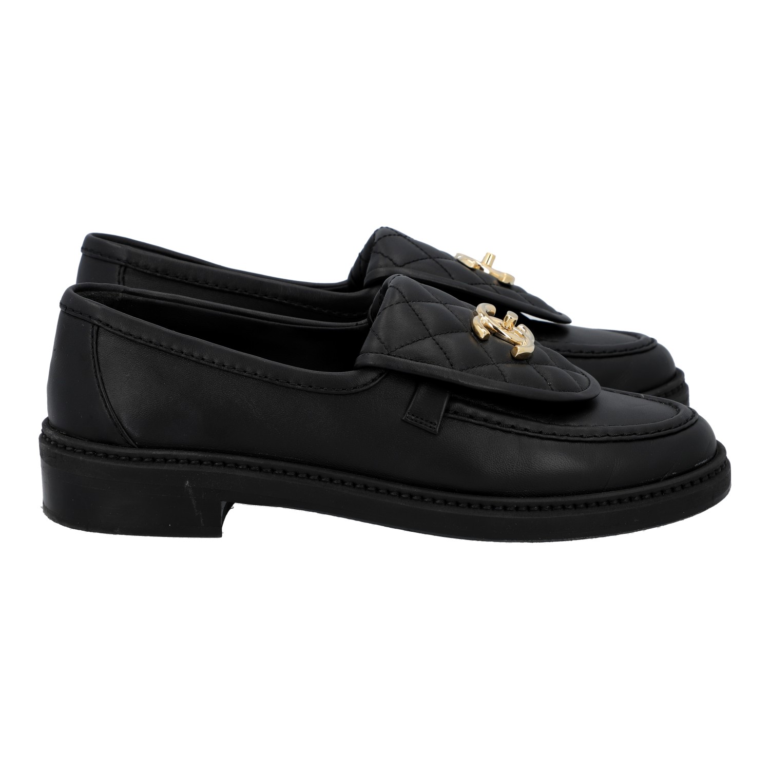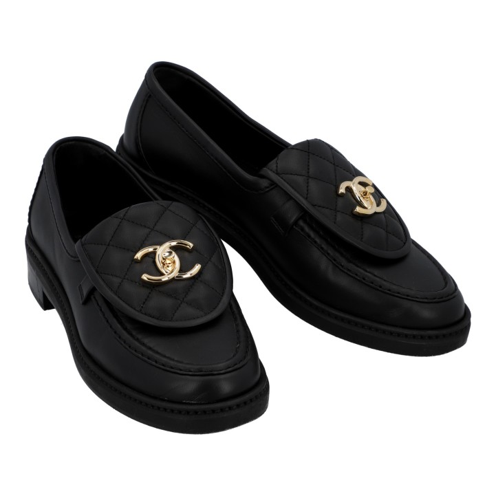 CHANEL moccasins, size 36.5. Black leather, partially with diamond quilting, gold-coloured hardware and CC logo decoration. Box, dust bag and receipt included. Signs of wear present.