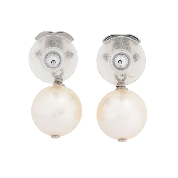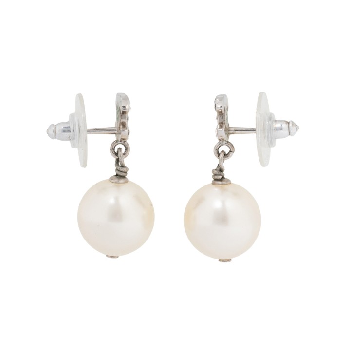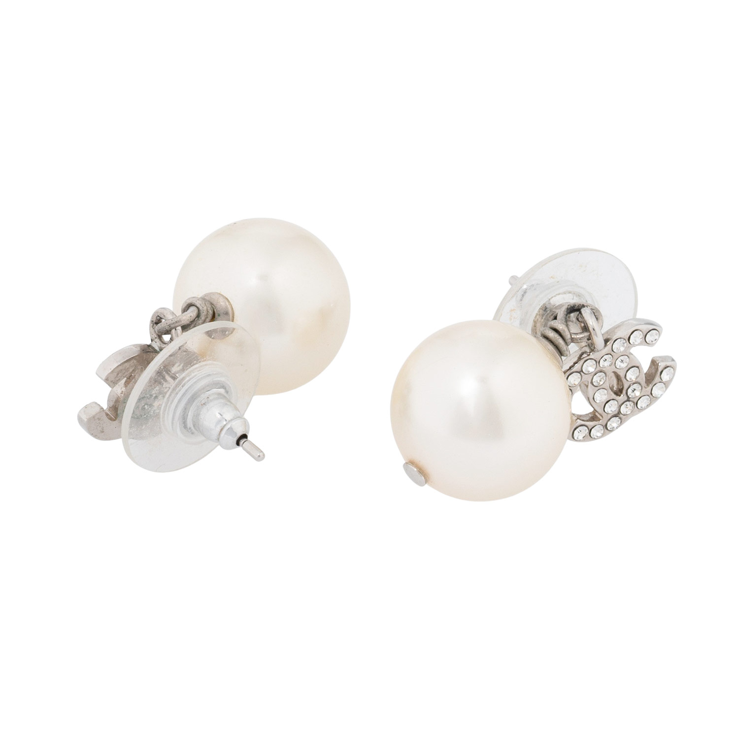 CHANEL ear rings coll.: 2016. Silver-coloured model with CC logo, rhinestone trim and artificial pearl pendant. Box and case included. Signs of wear present.