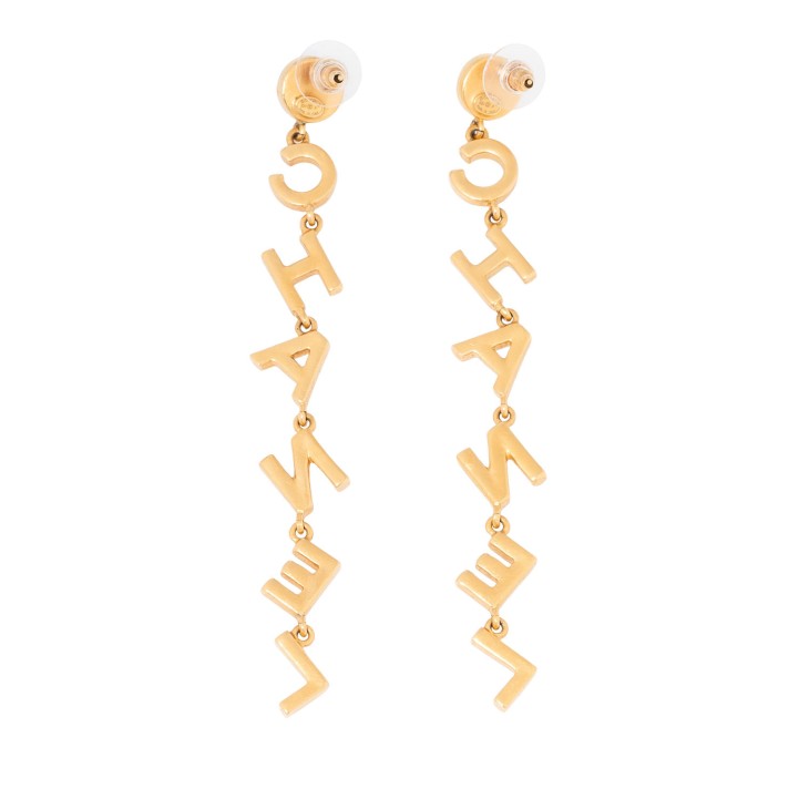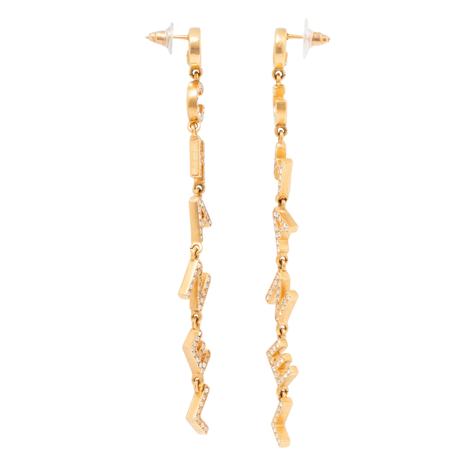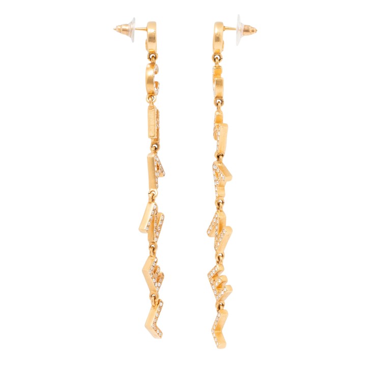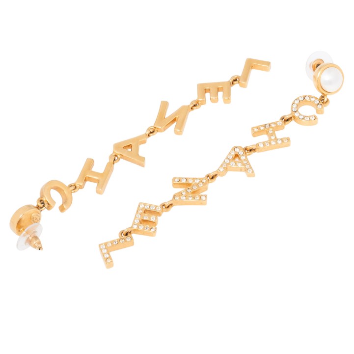 CHANEL ear rings, coll.: S/S2020. Gold-coloured model with rhinestone trim and artificial pearl. Box and case included. Signs of wear present. Length: 11 cm.
