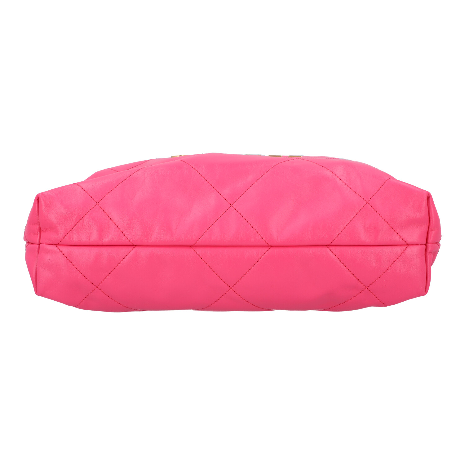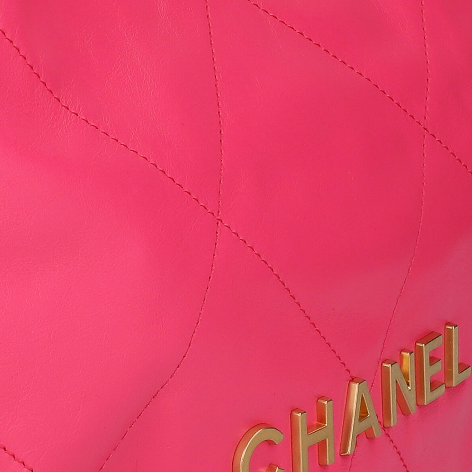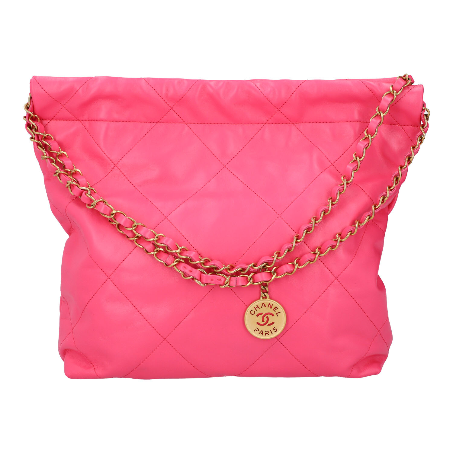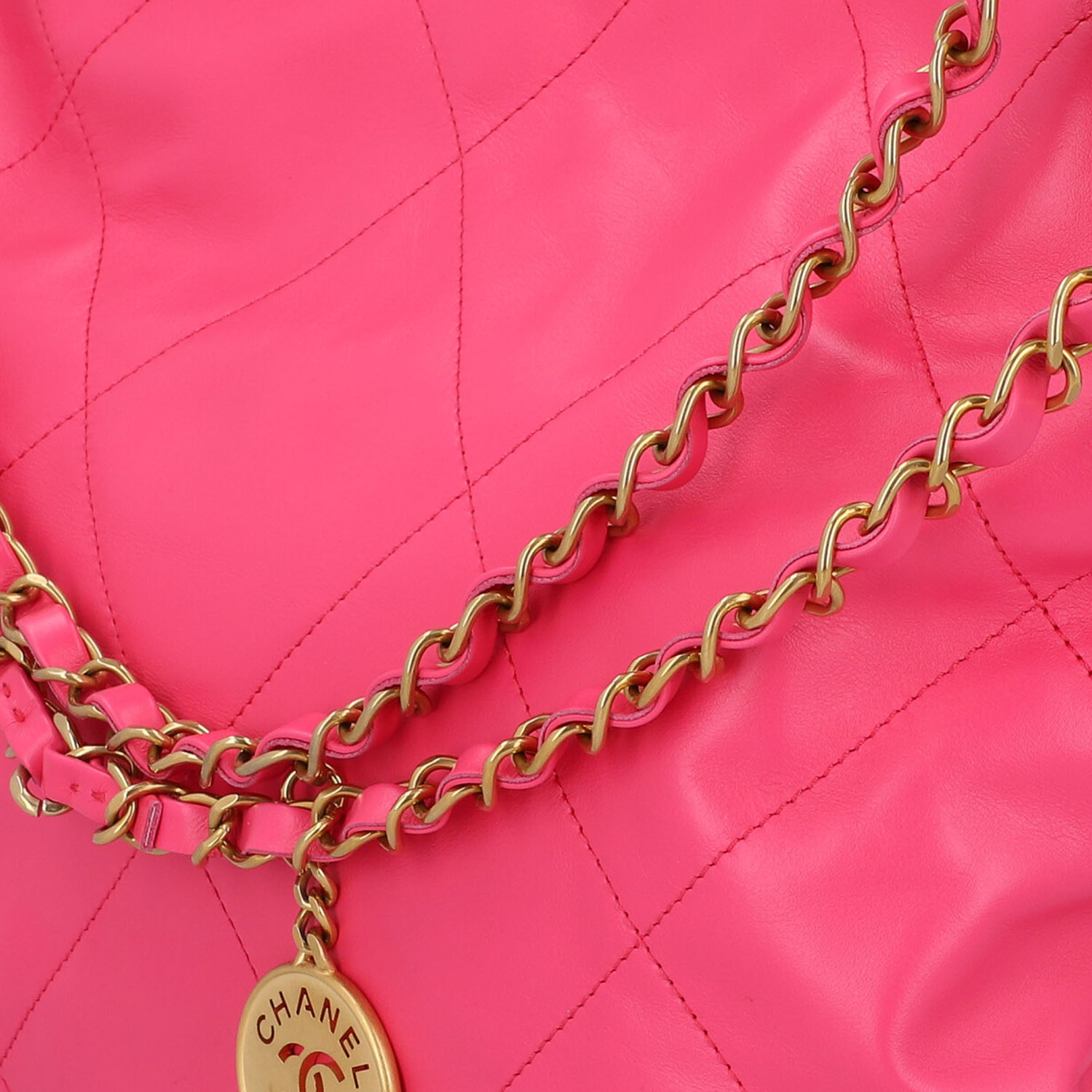 CHANEL bucket bag '22'. Coll. 2024. Slightly shiny pink leather with gold-coloured hardware and diamond stitching. Link chain strap interwoven with leather. Front with logo appliqué. Pochette, box, invoice and dust bag enclosed. Very good condition/as new. 30x8x30cm.