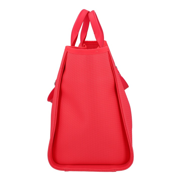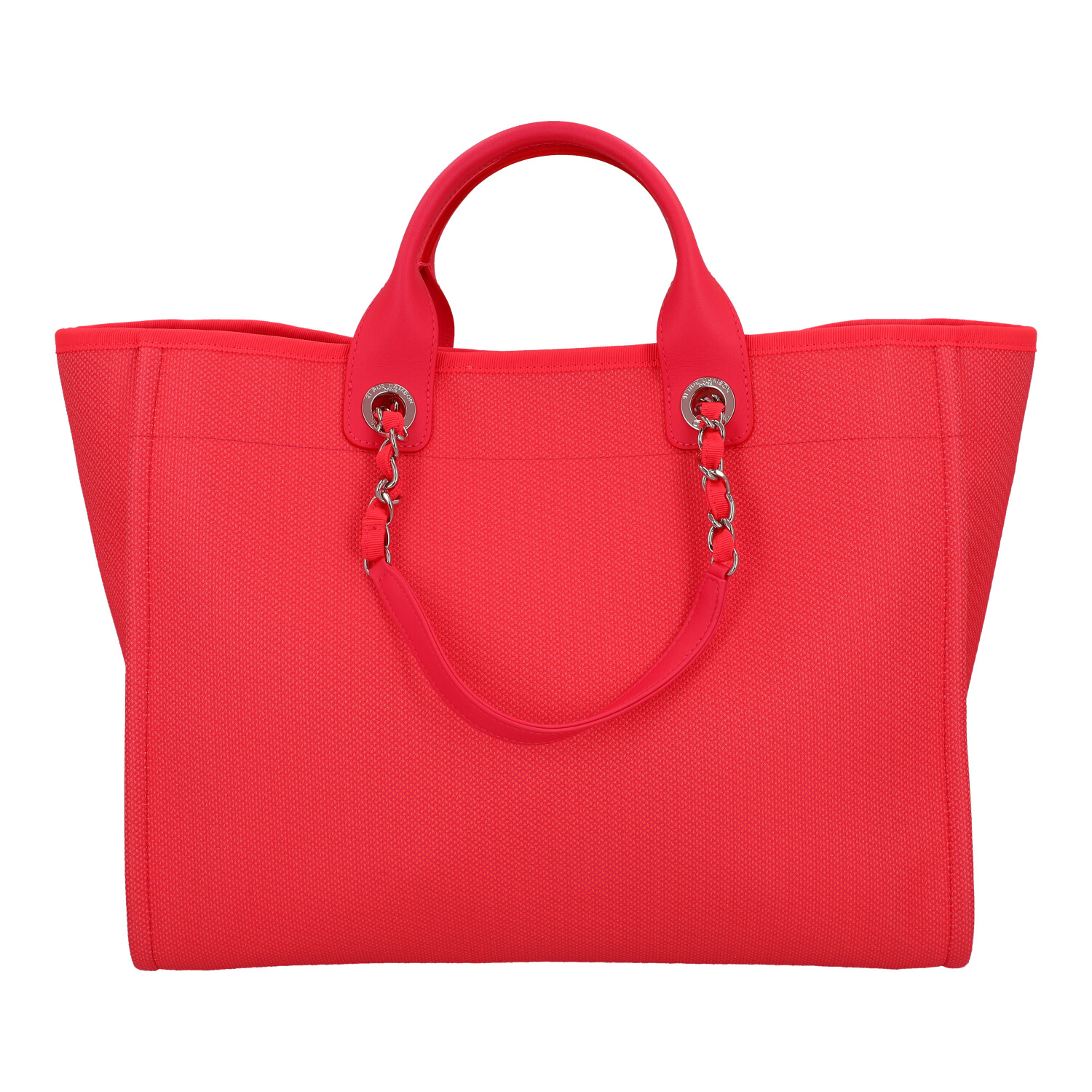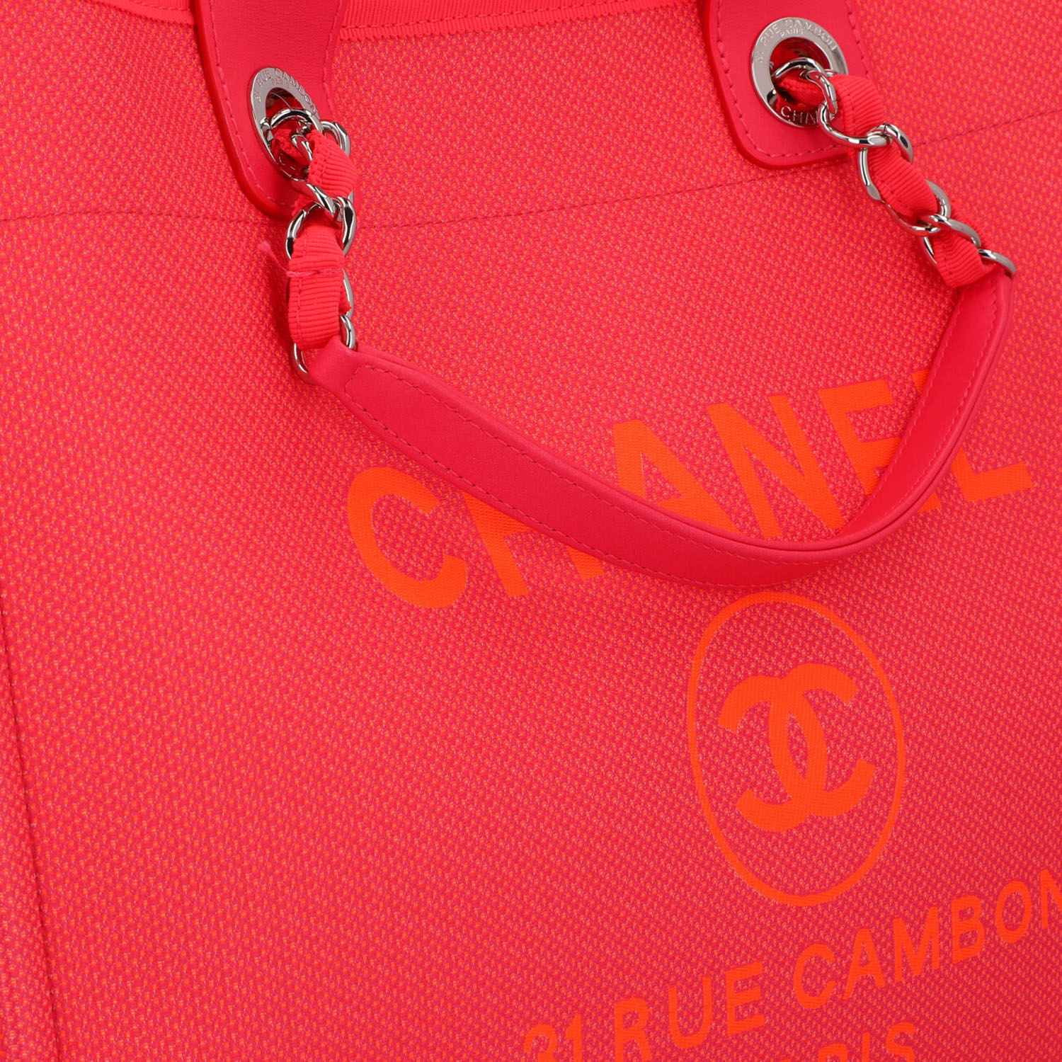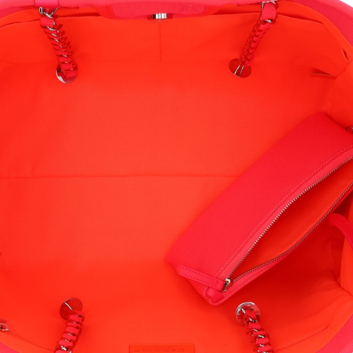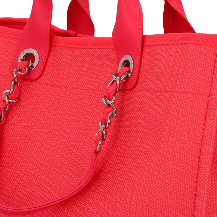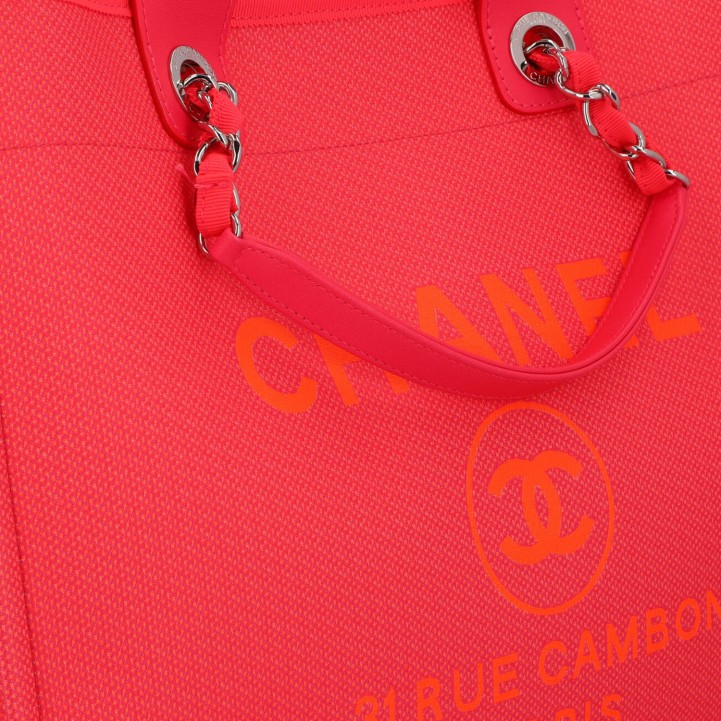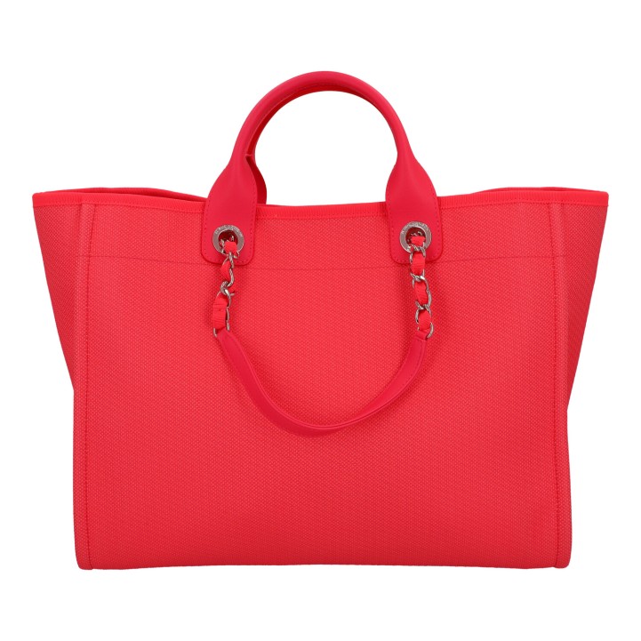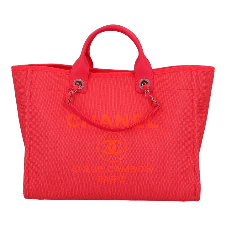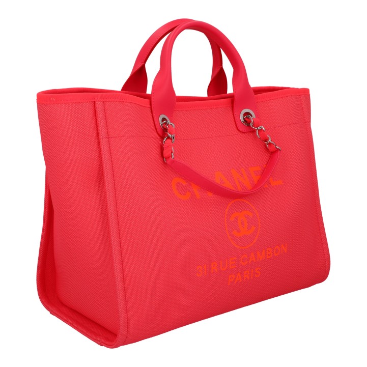 CHANEL Shopper 'DEAUVILLE', coll.: 2021. Model in pink with silver-coloured hardware, smooth leather details, logo print on the front, short and long double handles. Orange interior with three compartments, one with zip. Box and ID card enclosed. Very good condition.