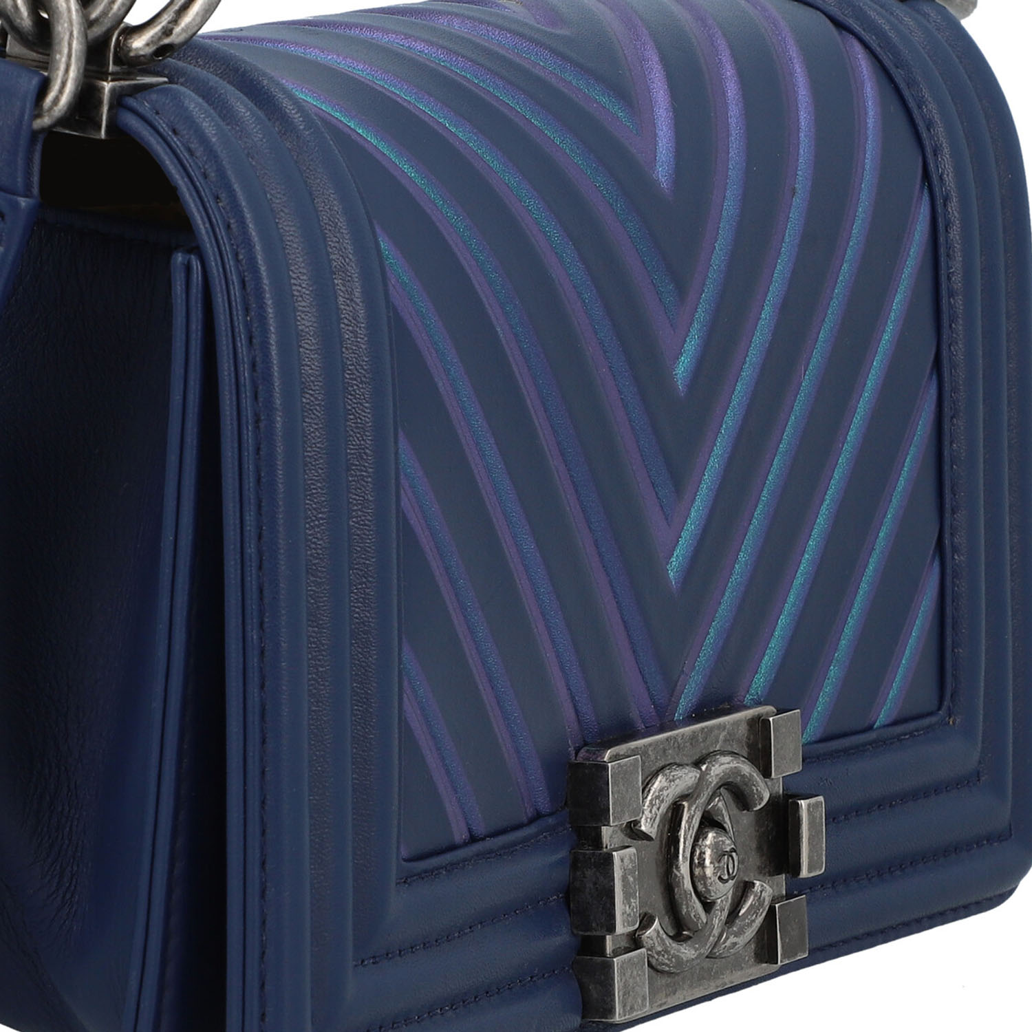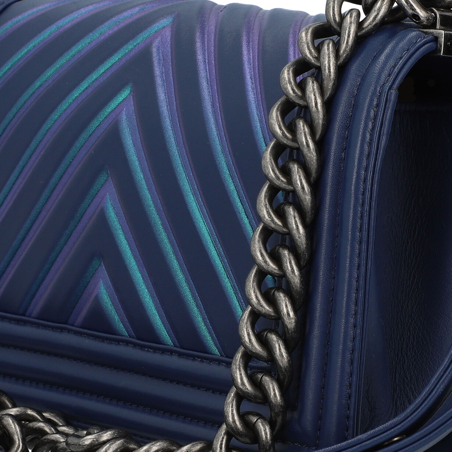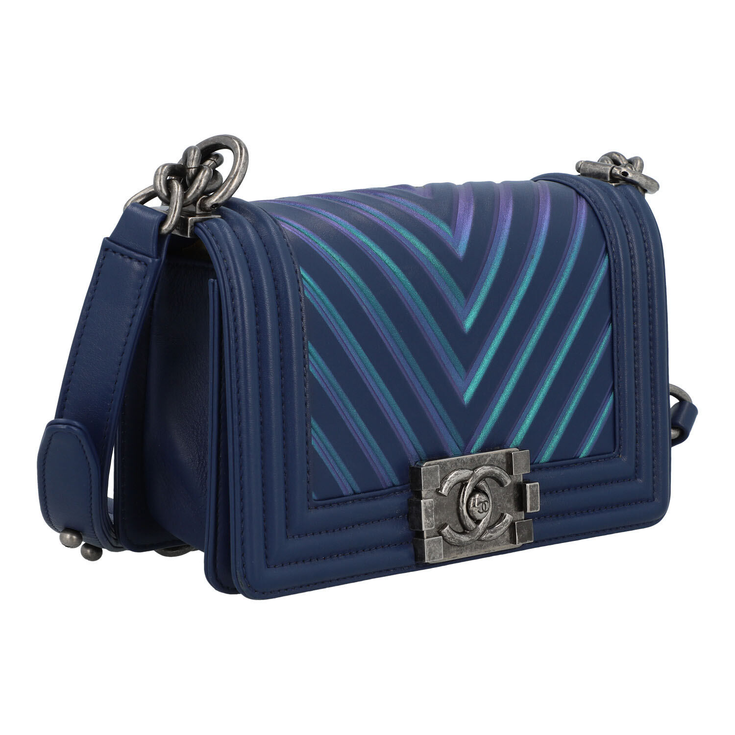 CHANEL shoulder bag ‘BOY SMALL BAG’, coll.: 2017-2018. Retail price: €6,100. Calfskin in blue with iridescent decoration in the Chevor quilting, metal with ruthenium finish, flap with boy buckle and chain strap. Textile interior with one compartment. ID card attached. Signs of wear present. 20.5 x 8.5 x 12 cm.