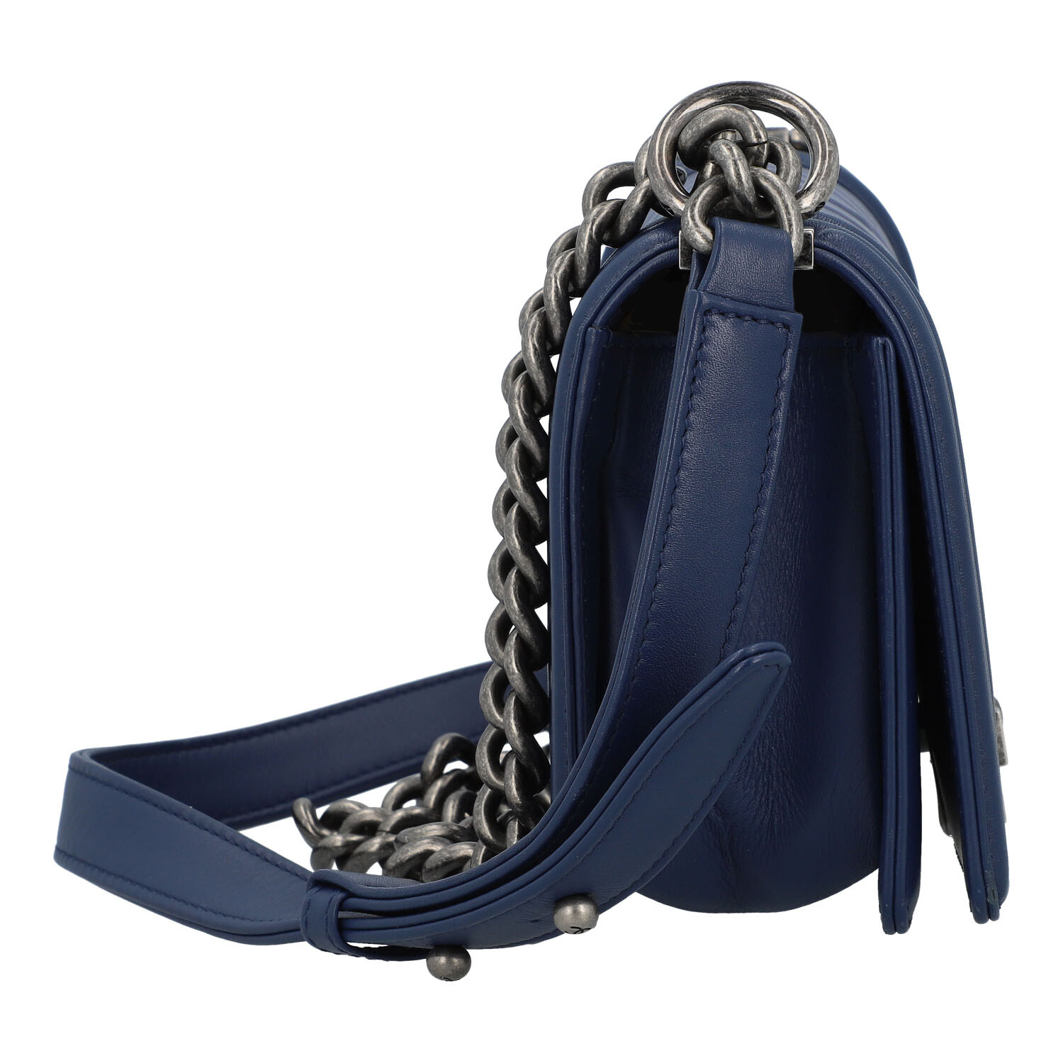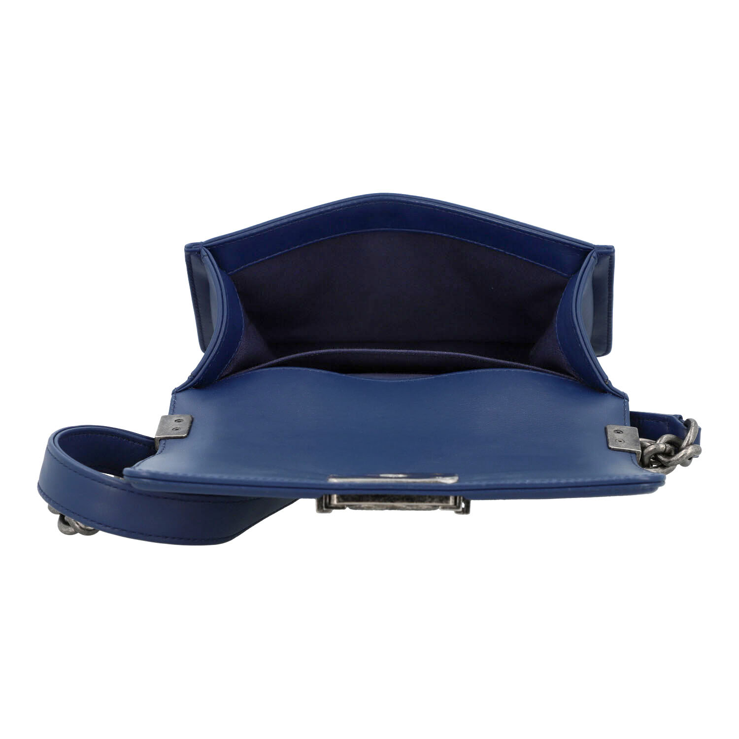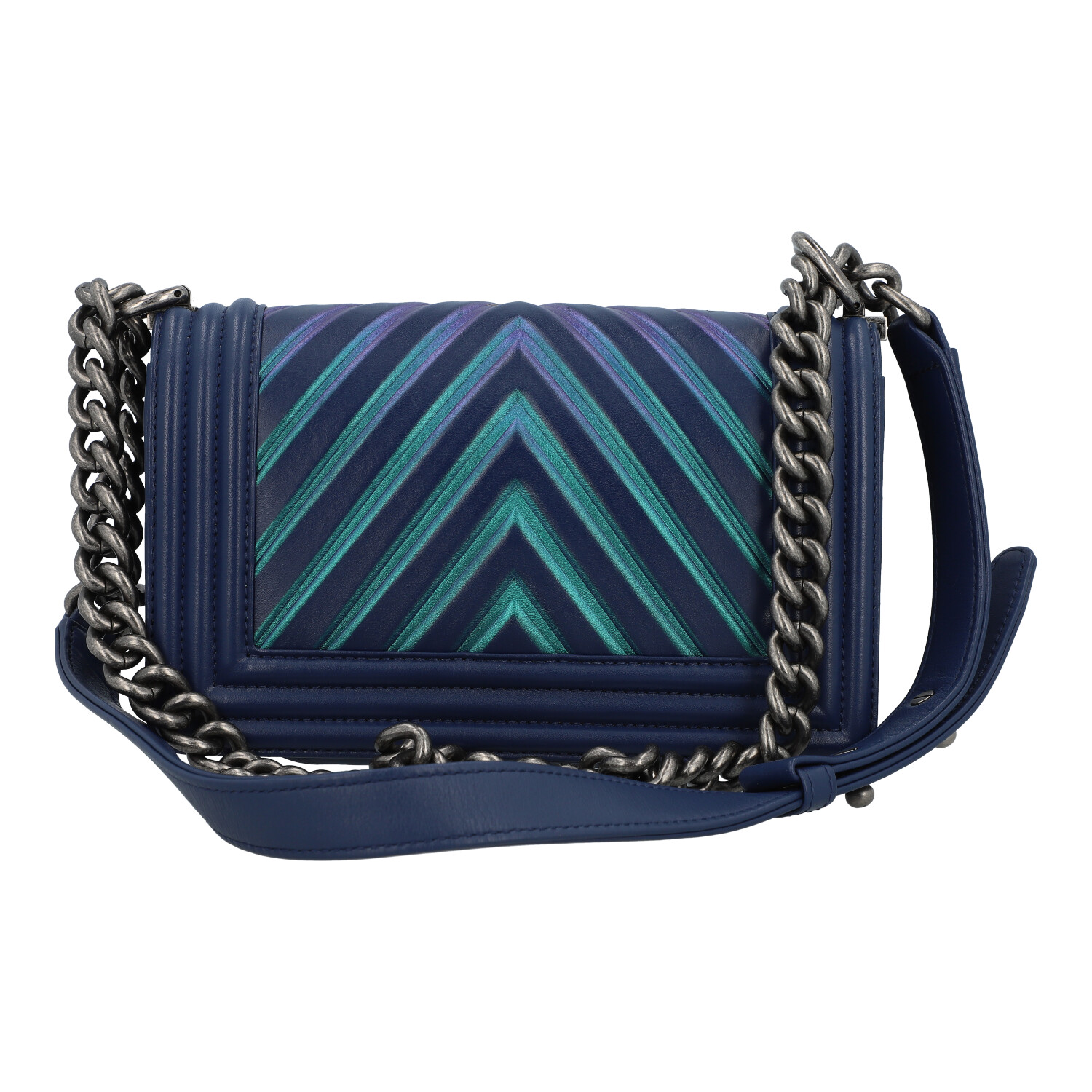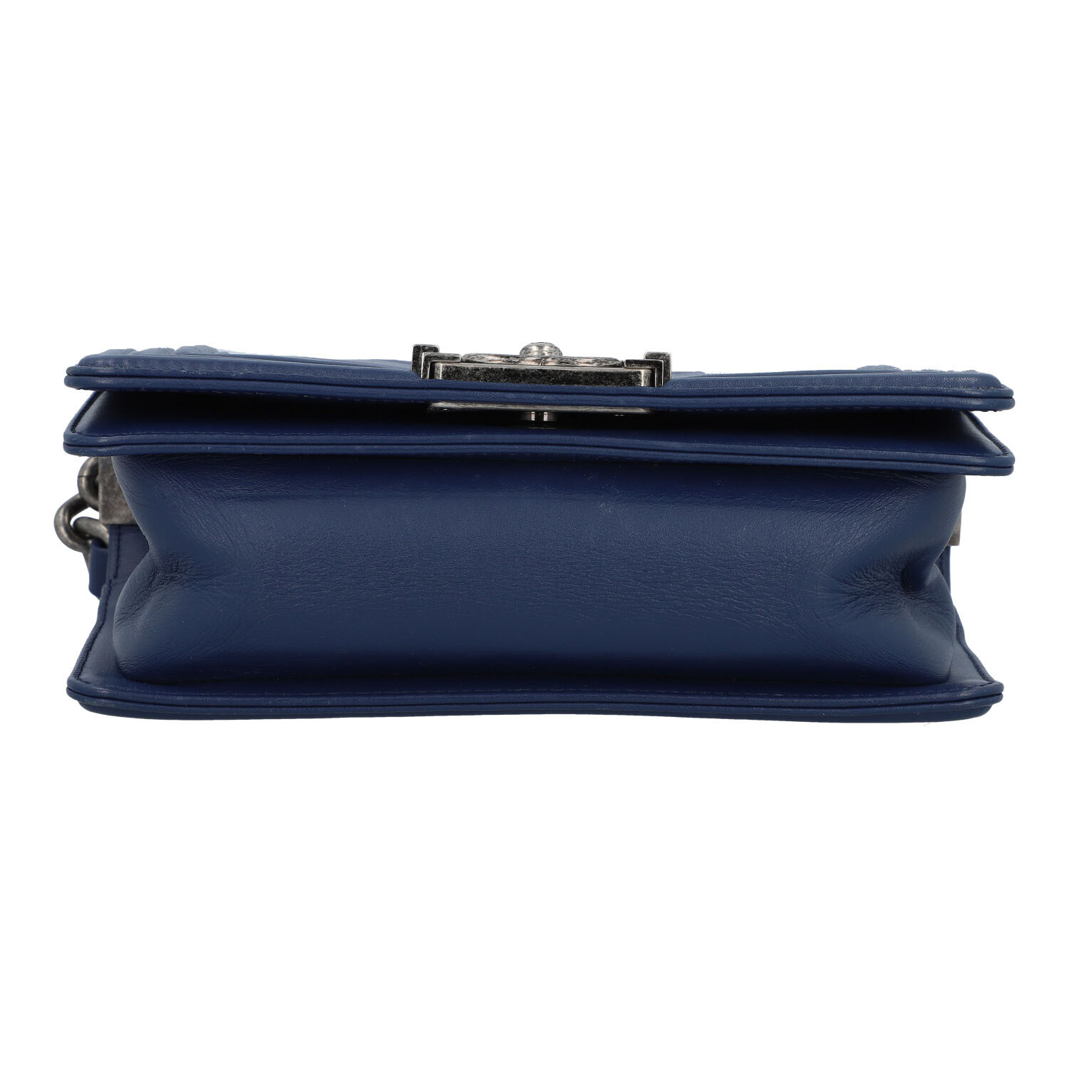 CHANEL shoulder bag ‘BOY SMALL BAG’, coll.: 2017-2018. Retail price: €6,100. Calfskin in blue with iridescent decoration in the Chevor quilting, metal with ruthenium finish, flap with boy buckle and chain strap. Textile interior with one compartment. ID card attached. Signs of wear present. 20.5 x 8.5 x 12 cm.