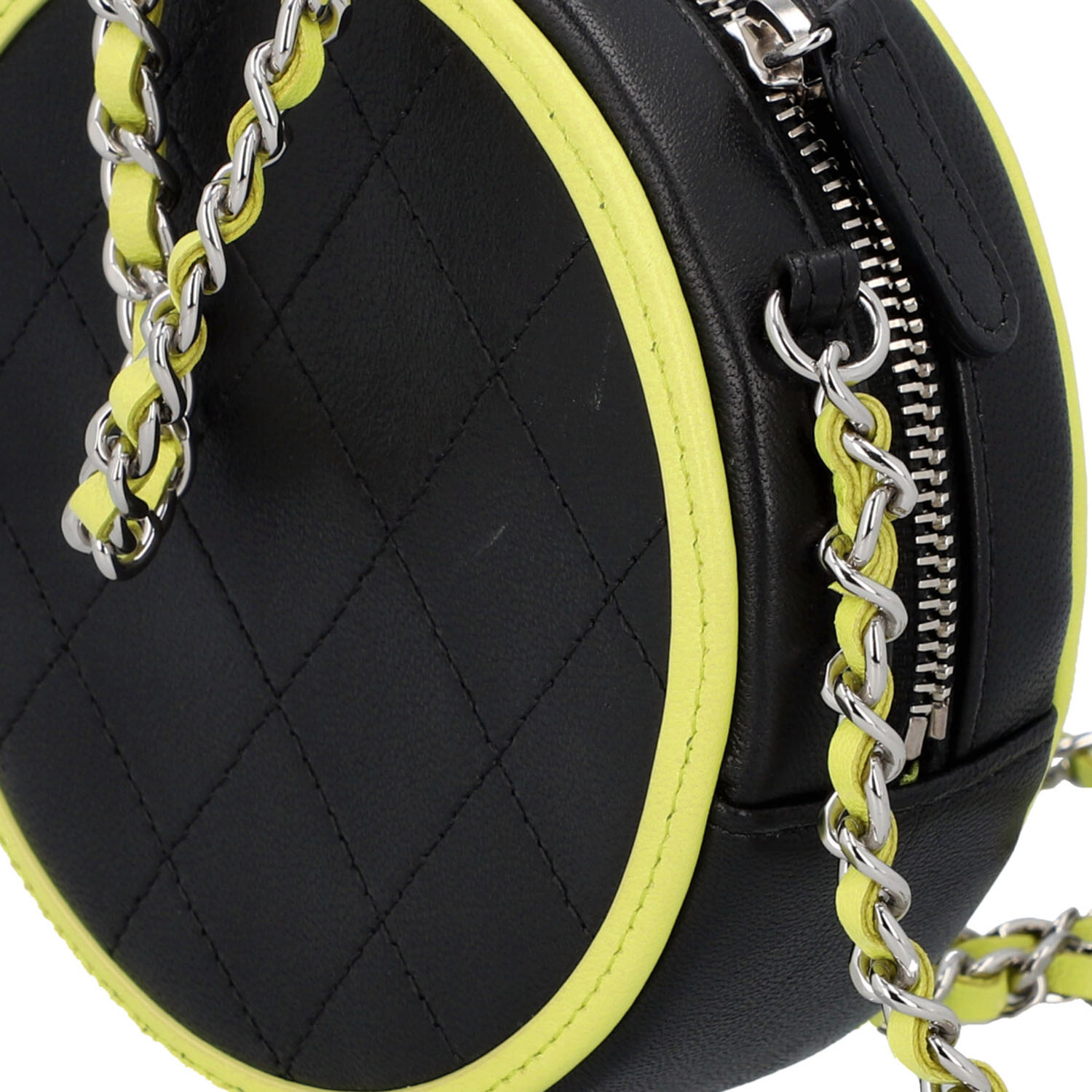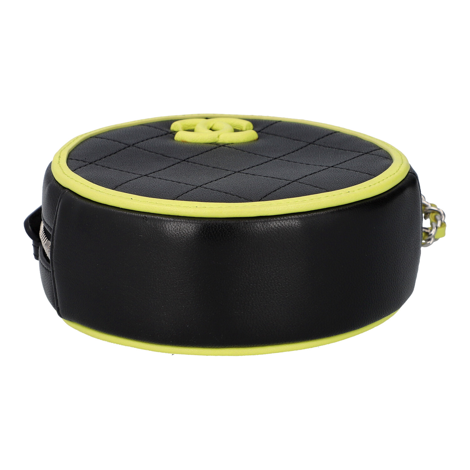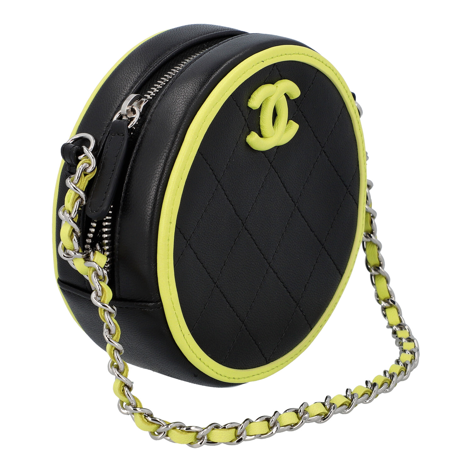 CHANEL crossbody bag 'CC ROUND'. Coll. 2019/2020. fine grained leather in black with neon details (yellow). Front with CC logo and diamond quilting. All-around zipper closure. Small interior compartment, textile lining in neon yellow. Silver tone hardware, fine link chain interwoven with leather. Dust bag, box and invoice enclosed. Very good condition. 12x5x12cm.