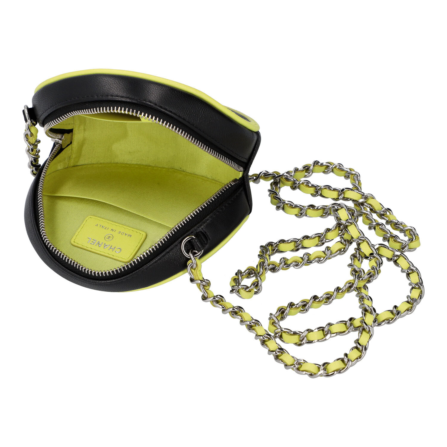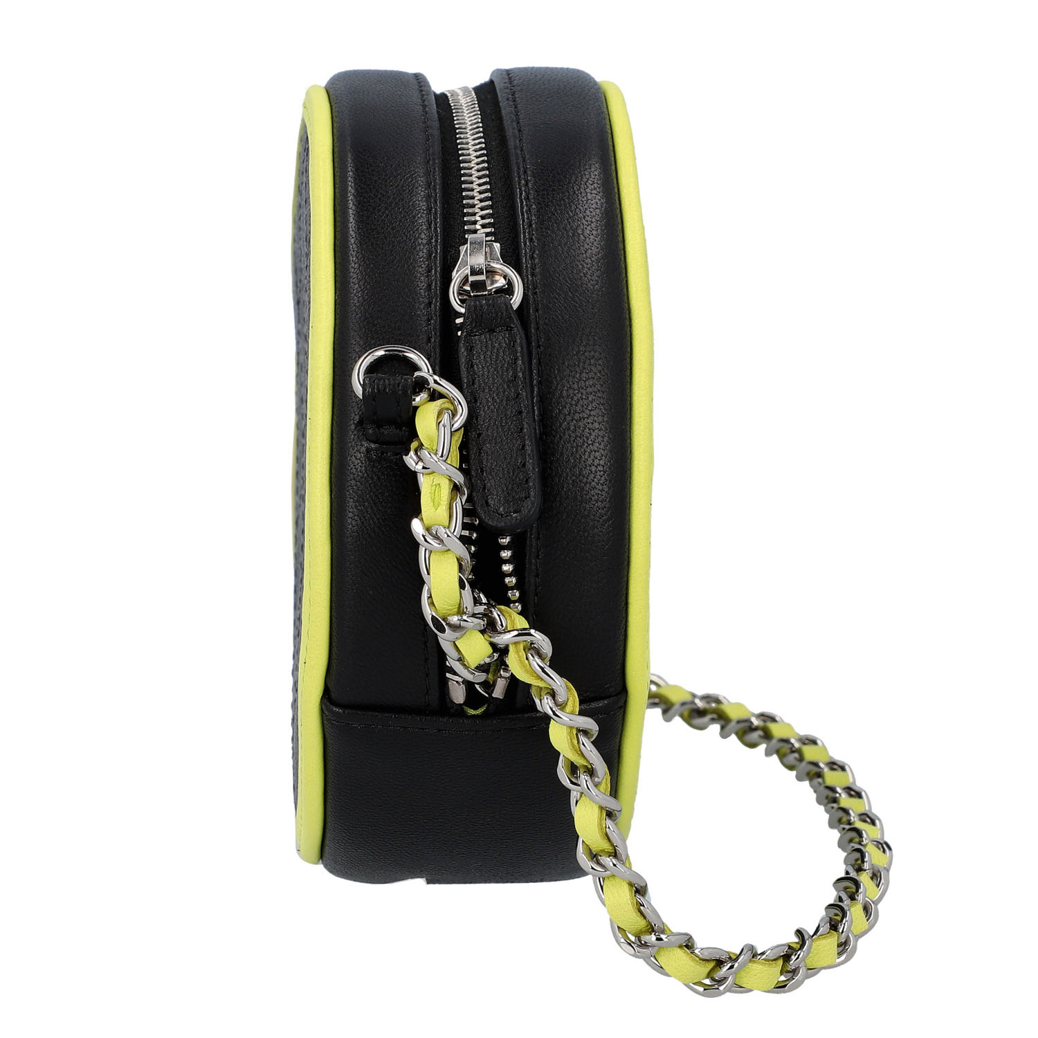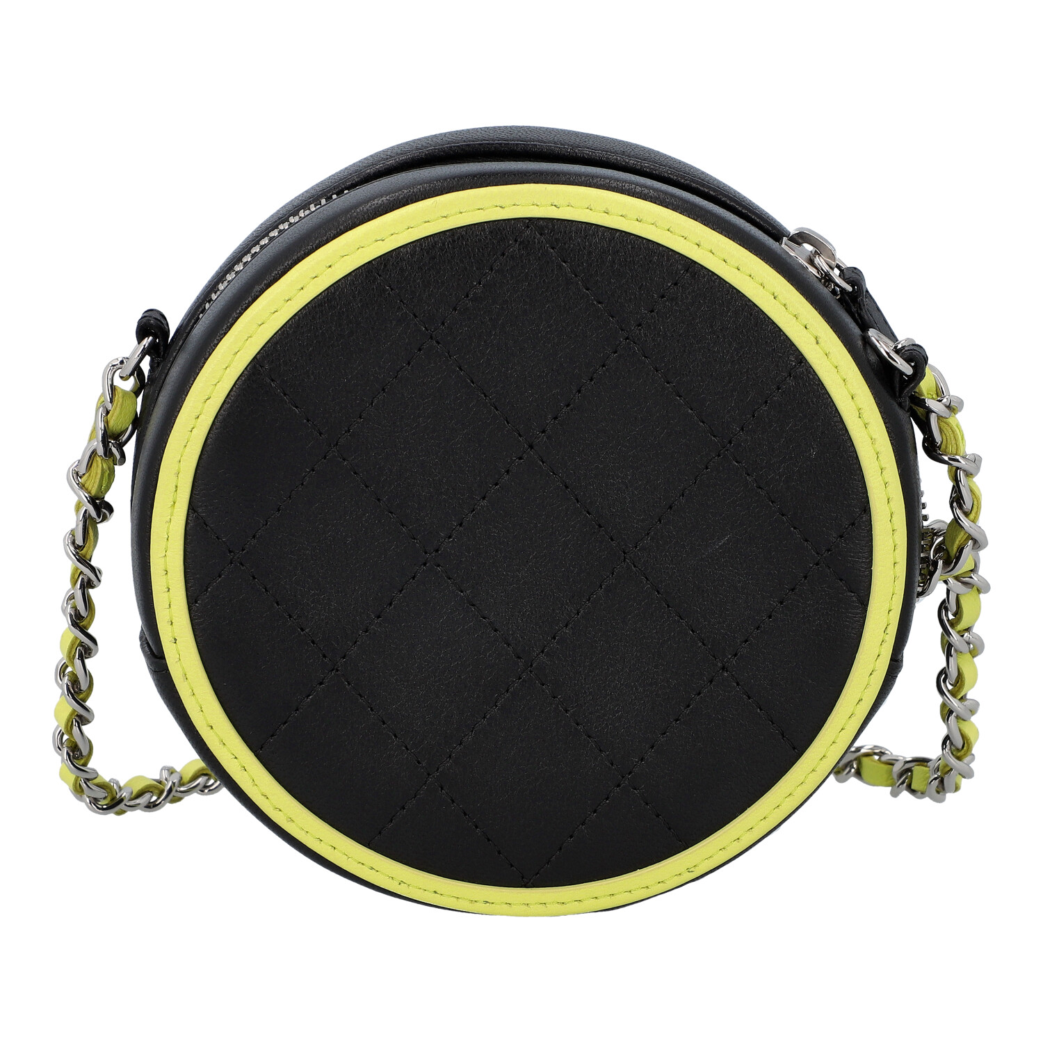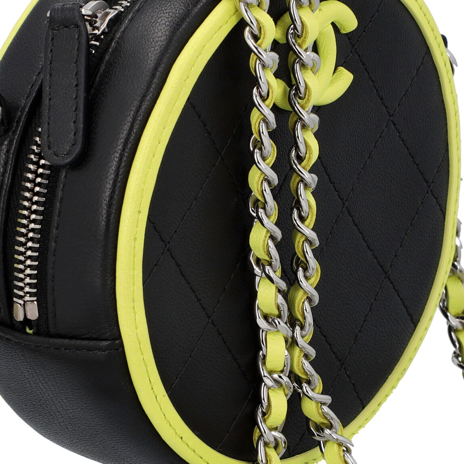 CHANEL crossbody bag 'CC ROUND'. Coll. 2019/2020. fine grained leather in black with neon details (yellow). Front with CC logo and diamond quilting. All-around zipper closure. Small interior compartment, textile lining in neon yellow. Silver tone hardware, fine link chain interwoven with leather. Dust bag, box and invoice enclosed. Very good condition. 12x5x12cm.