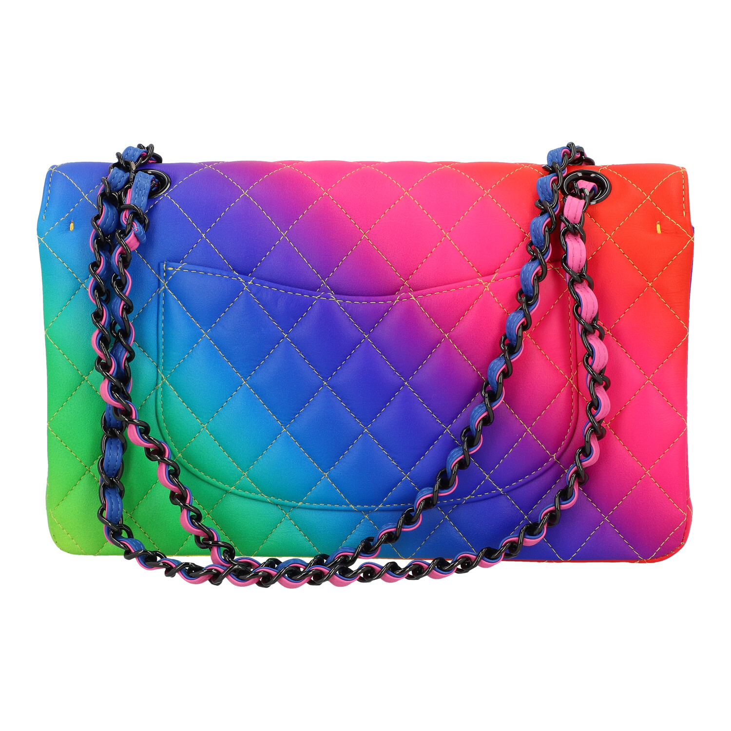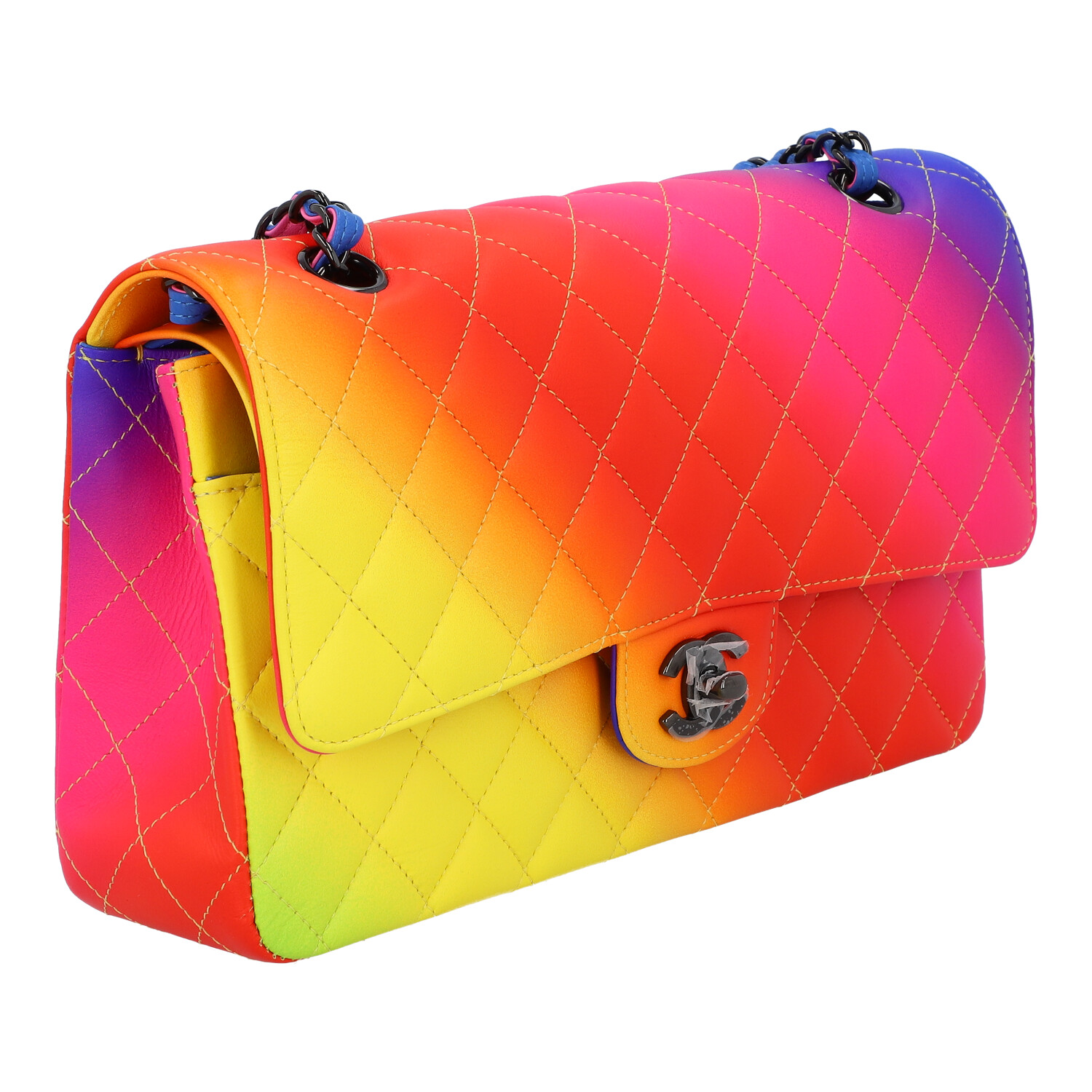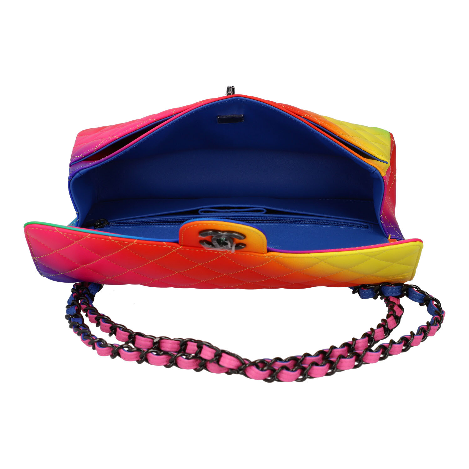 CHANEL shoulder bag 'CLASSIC FLAP BAG MEDIUM'. Limited edition - collector's item. Cruise collection 2023. smooth leather in rainbow colors with black colored hardware. Classic model. Box and dust bag enclosed. Hardware still partially glued, very good condition. Slight creases present. 25x6x14.5cm.