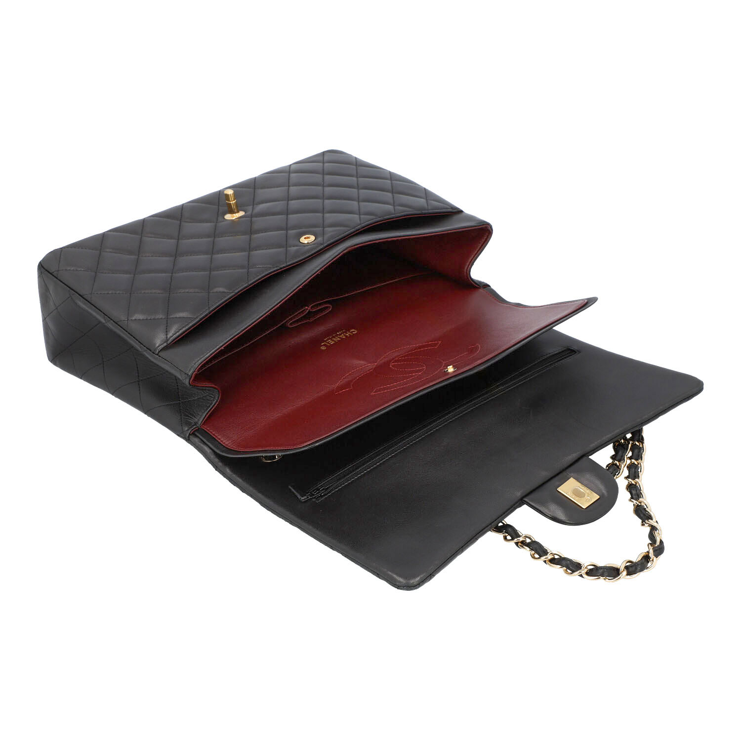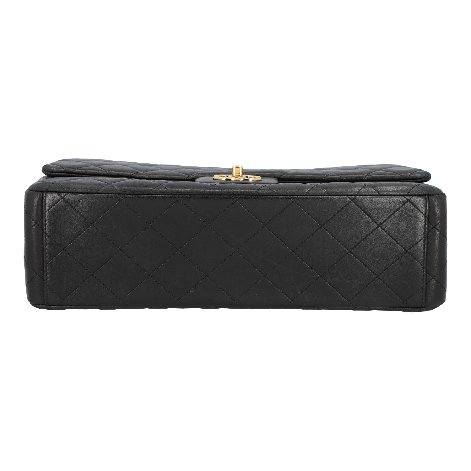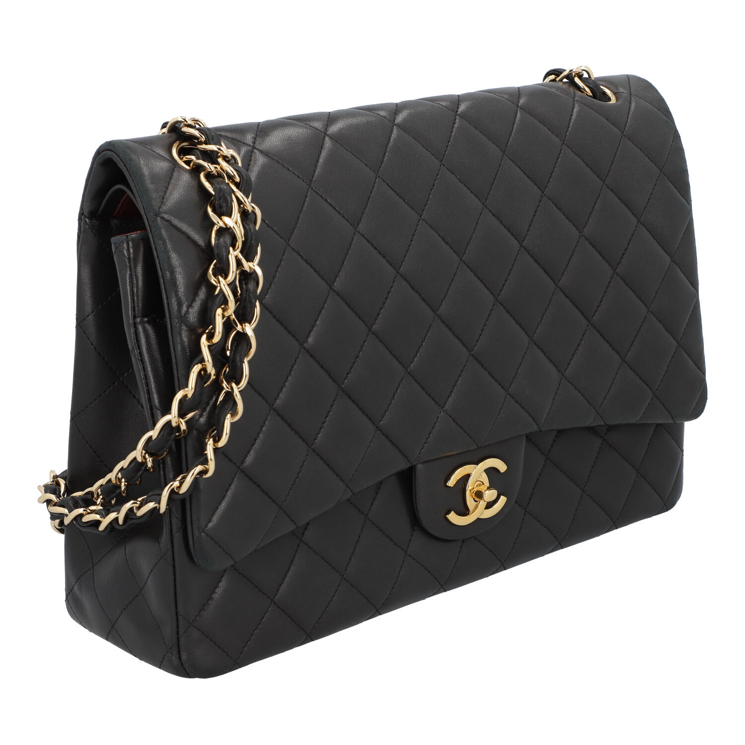 CHANEL shoulder bag ‘DOUBLE FLAP BAG MAXI’, coll. 2014. Lambskin leather in black with gold-coloured hardware. Classic model with double flap and CC twist fastening. Signs of heavy wear, abrasion and scratches. Box, dust bag, ID card and invoice enclosed. 33x10x23cm.