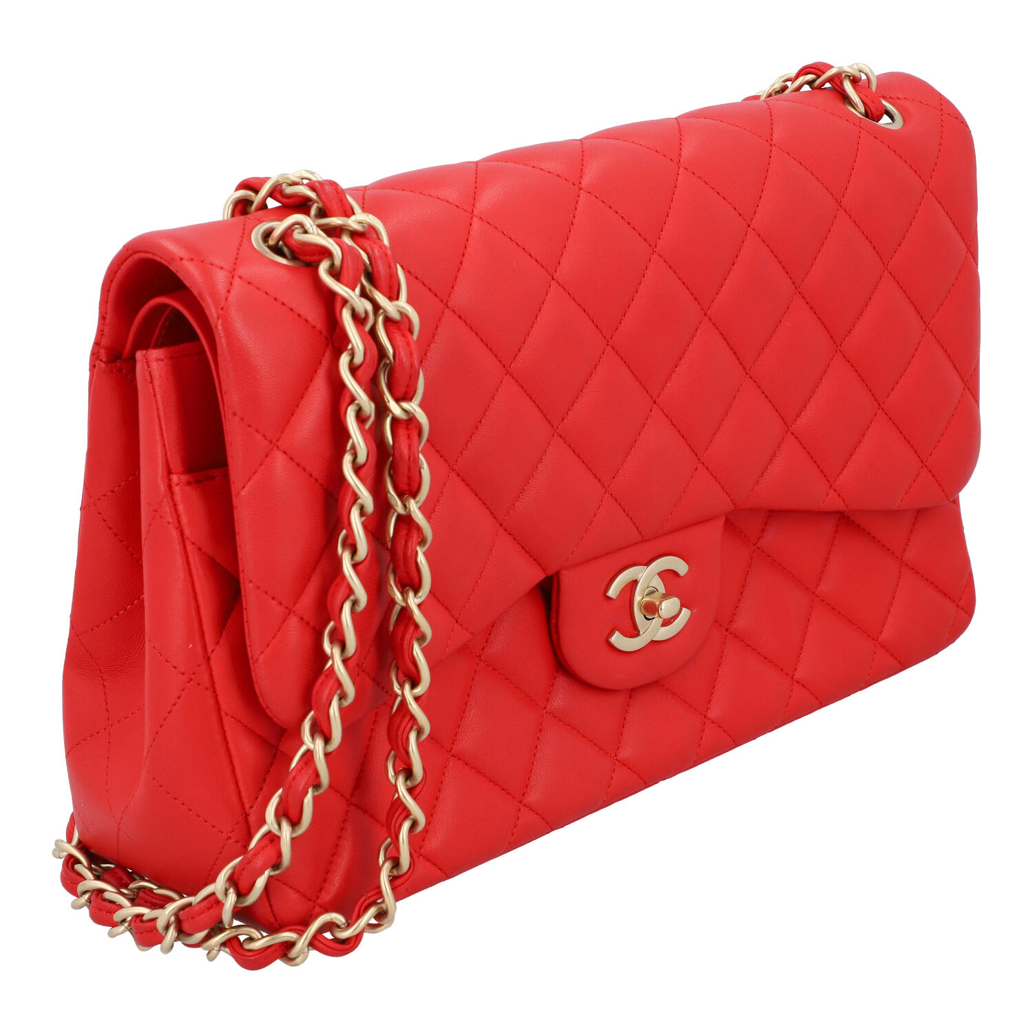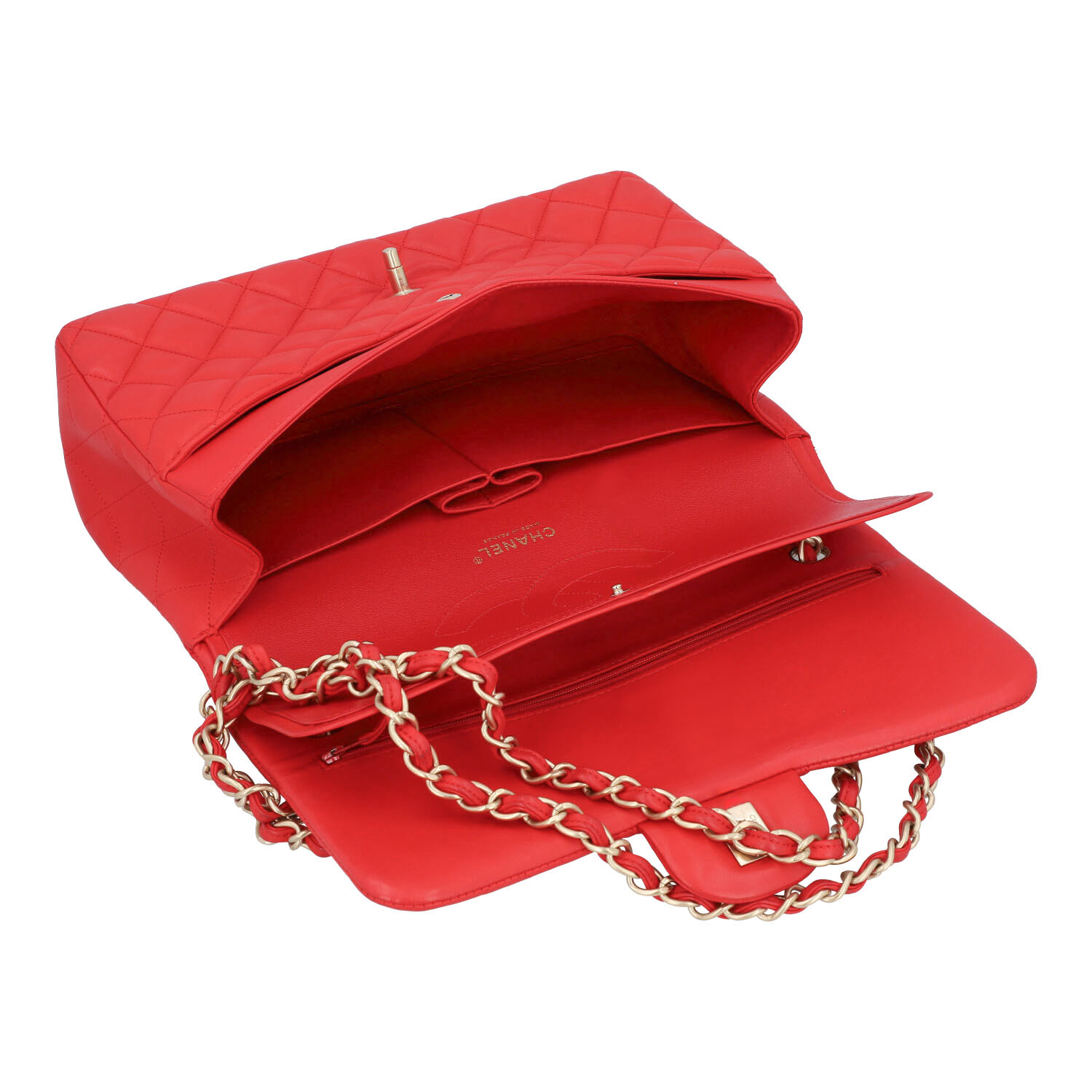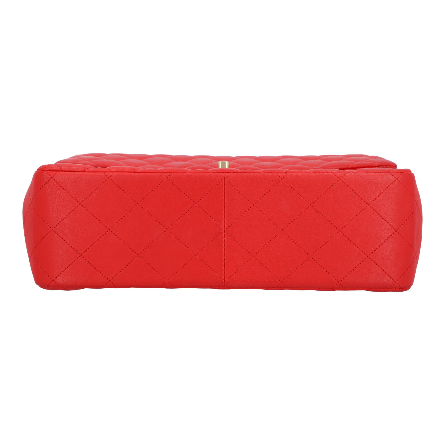 CHANEL shoulder bag ‘LARGE CLASSIC BAG’, coll.: 2013. Retail price: 11.100,-€. Lambskin in red with brushed gold-coloured hardware, double flap with CC logo twist lock, outer compartment and chain strap interwoven with leather. Interior with six compartments. Box, dust bag, proof of purchase and copy of invoice enclosed, 30 x 10 x 19.5 cm.