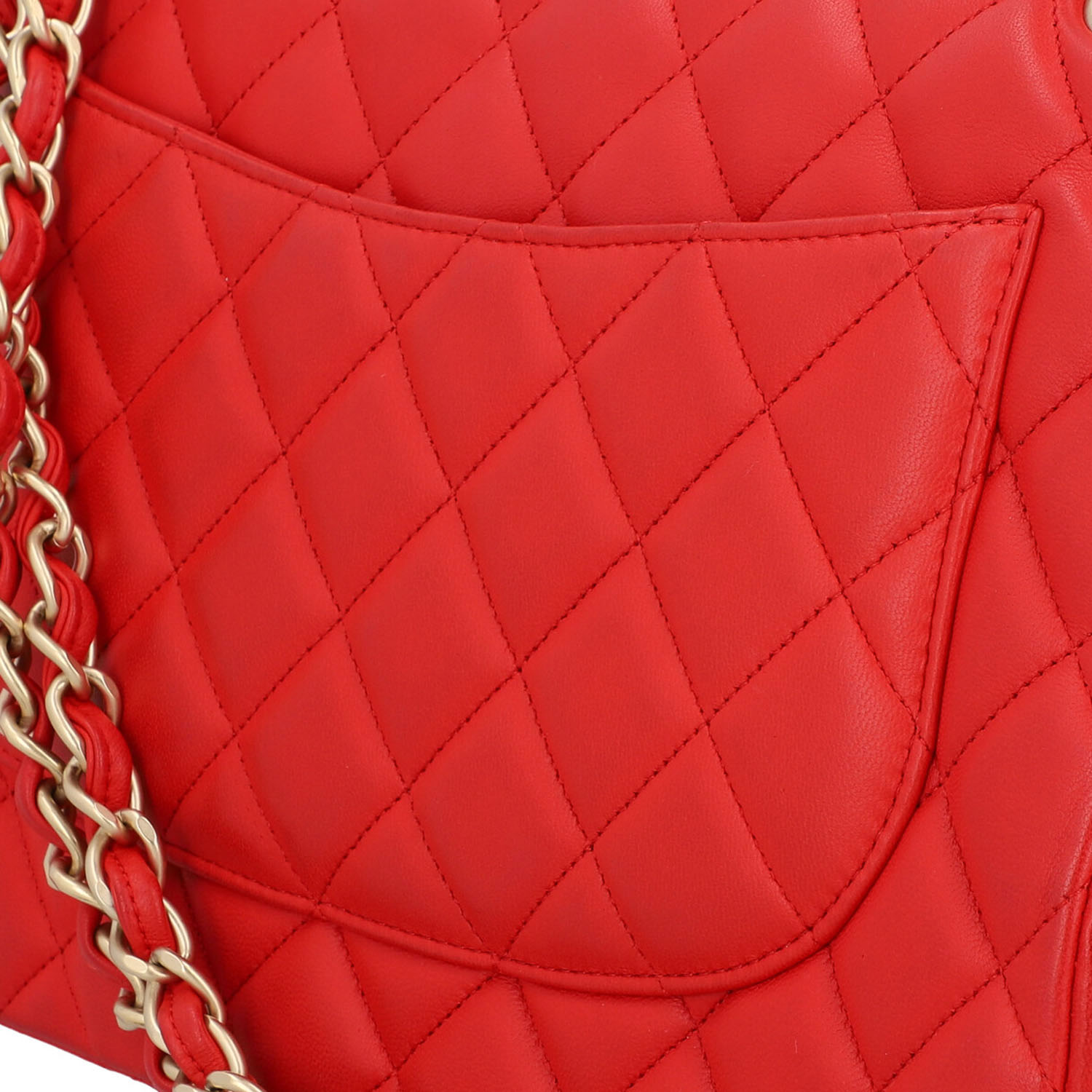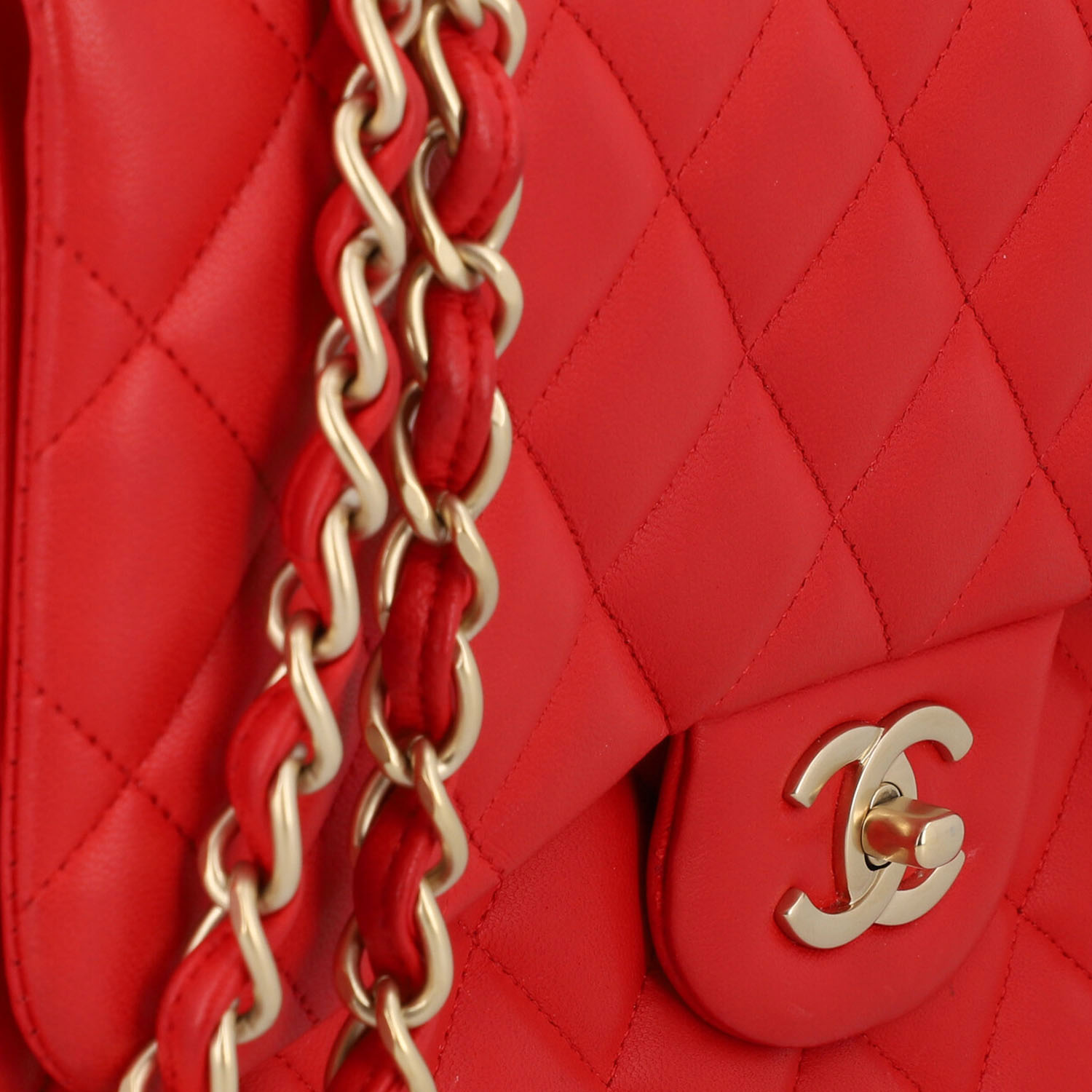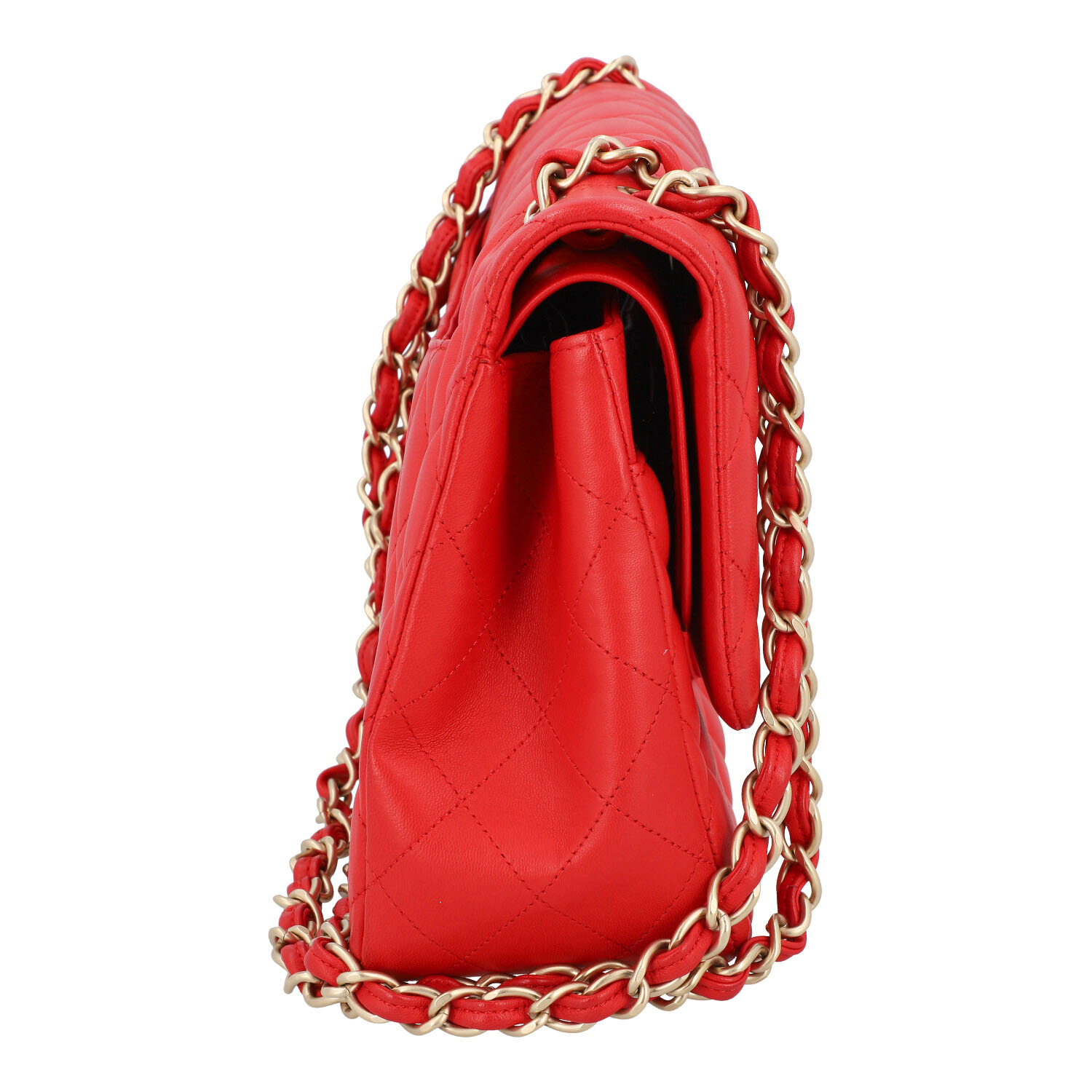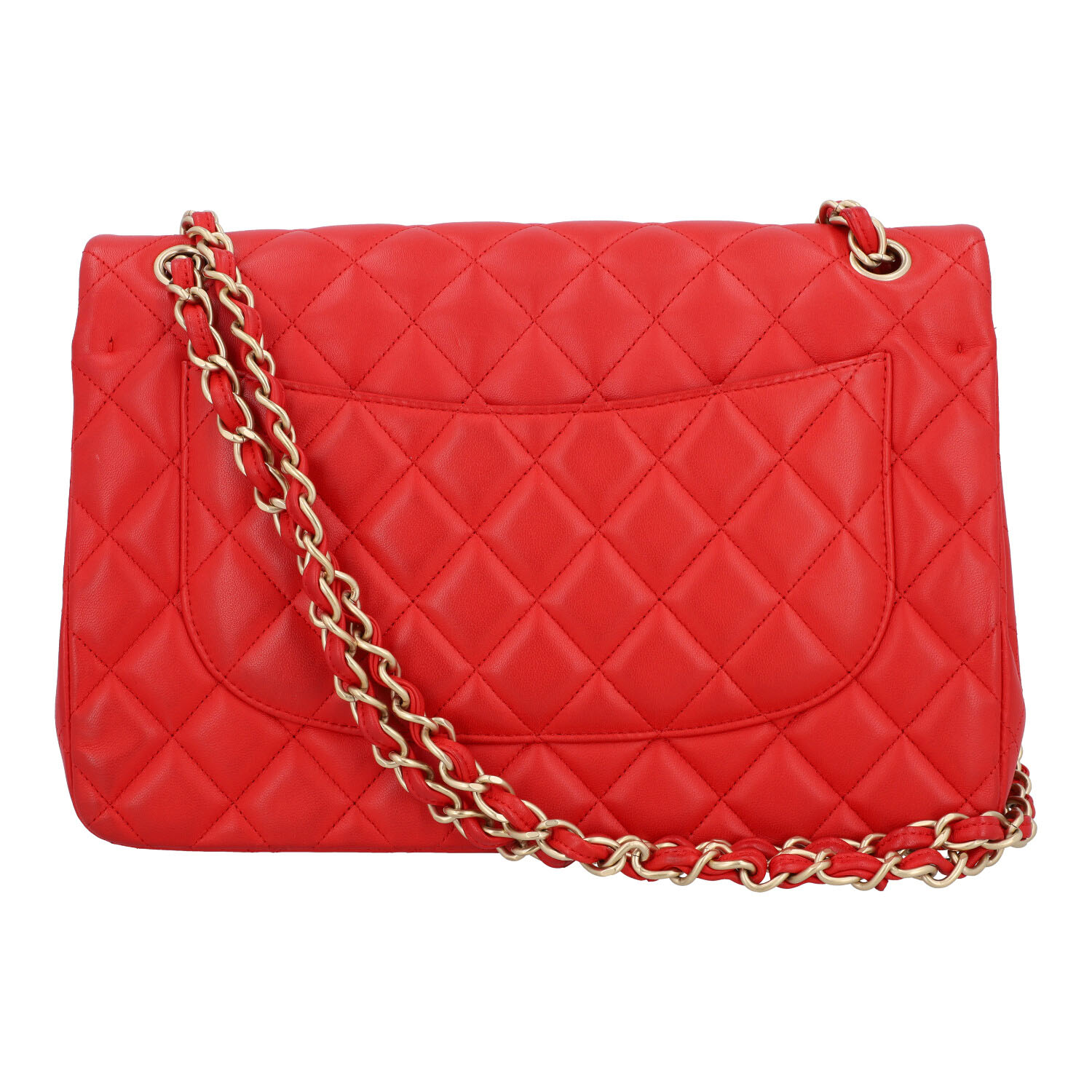 CHANEL shoulder bag ‘LARGE CLASSIC BAG’, coll.: 2013. Retail price: 11.100,-€. Lambskin in red with brushed gold-coloured hardware, double flap with CC logo twist lock, outer compartment and chain strap interwoven with leather. Interior with six compartments. Box, dust bag, proof of purchase and copy of invoice enclosed, 30 x 10 x 19.5 cm.