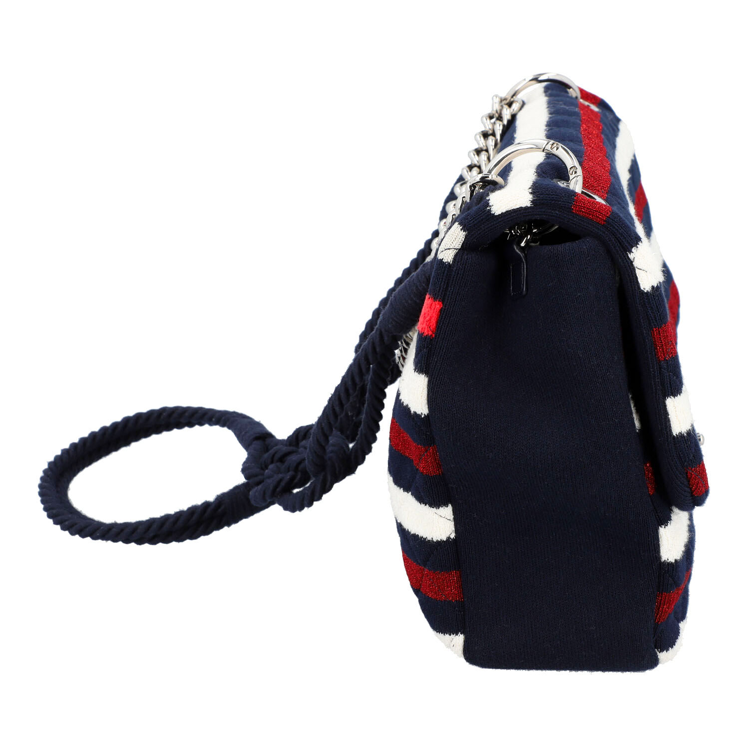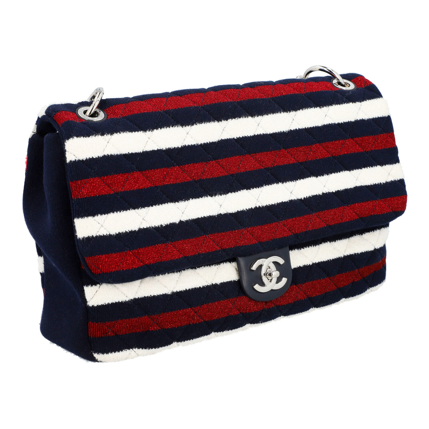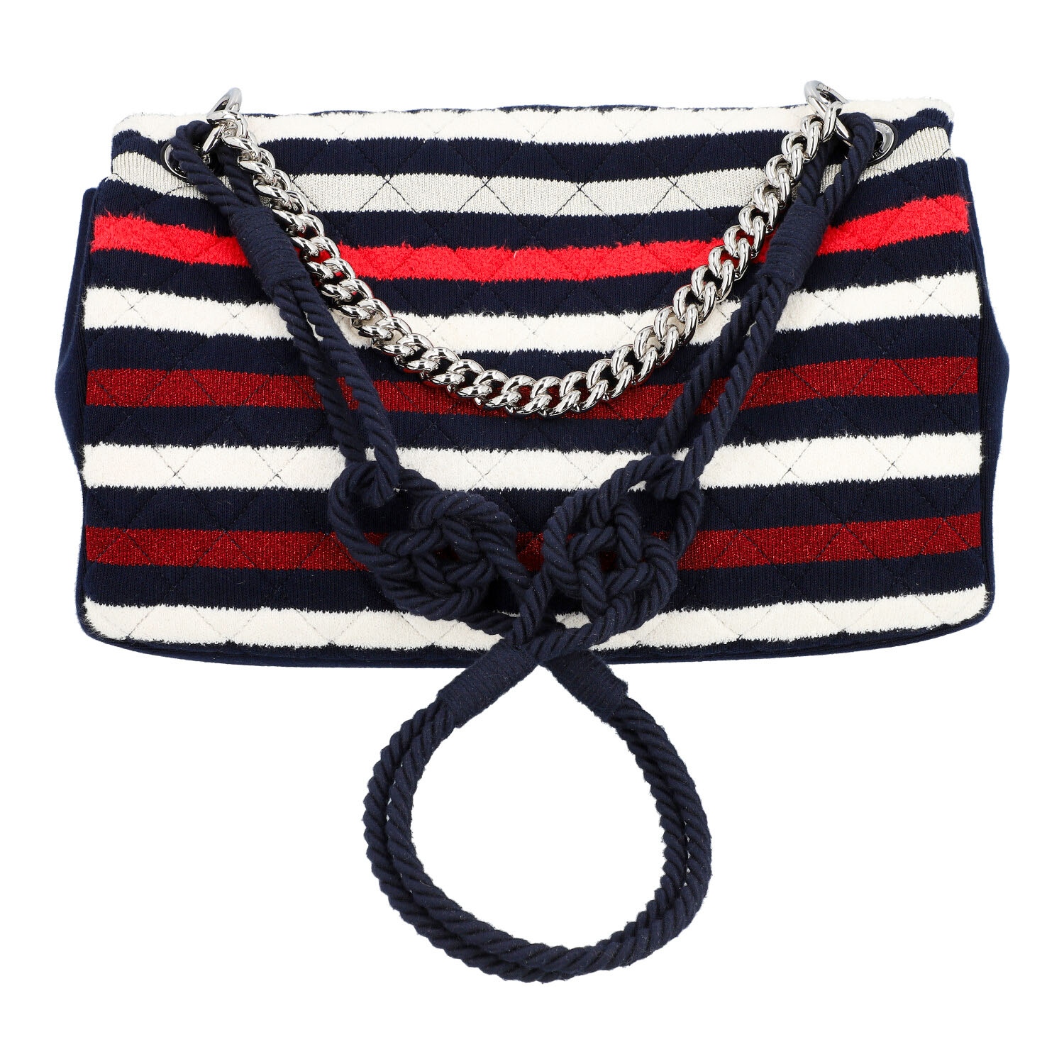 CHANEL shoulder bag 'SINGLE FLAP BAG MAXI'. CHANEL BY THE SEA SPRING-SUMMER 2019. Navy blue jersey body with classic diamond quilting and striped decoration in white and red (shiny). Silver-coloured hardware, flap with CC fastening. Short link chain strap and long cord strap with sailor's knot. Back with slight abrasion and discolouration. Box and copy of invoice enclosed. 35x8x21cm.