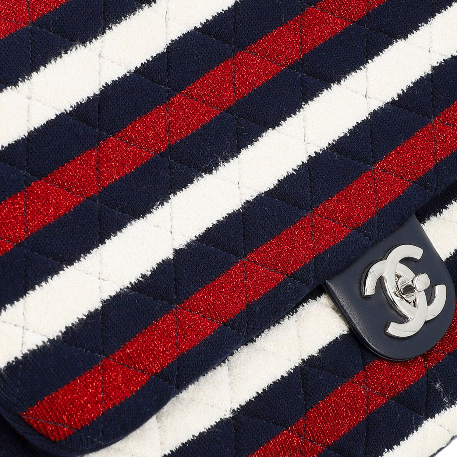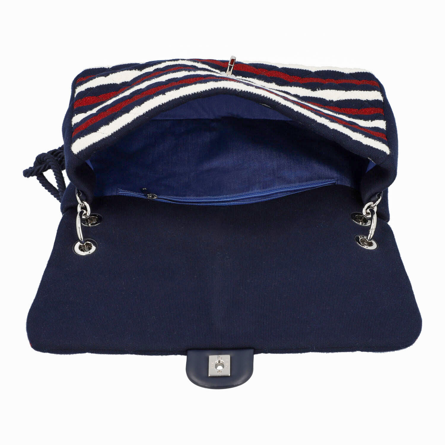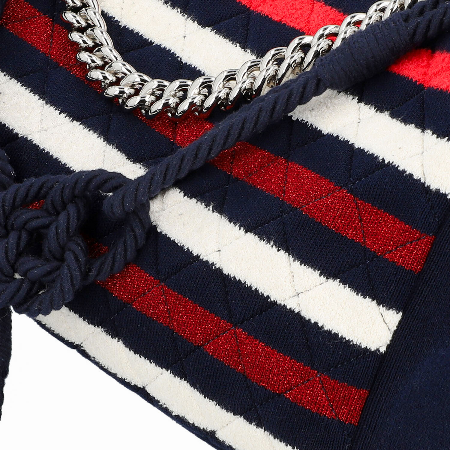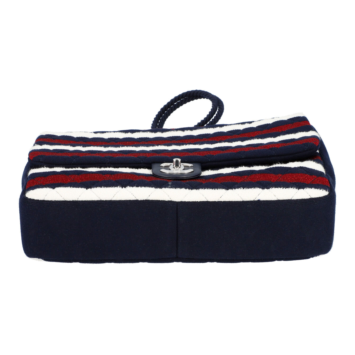 CHANEL shoulder bag 'SINGLE FLAP BAG MAXI'. CHANEL BY THE SEA SPRING-SUMMER 2019. Navy blue jersey body with classic diamond quilting and striped decoration in white and red (shiny). Silver-coloured hardware, flap with CC fastening. Short link chain strap and long cord strap with sailor's knot. Back with slight abrasion and discolouration. Box and copy of invoice enclosed. 35x8x21cm.