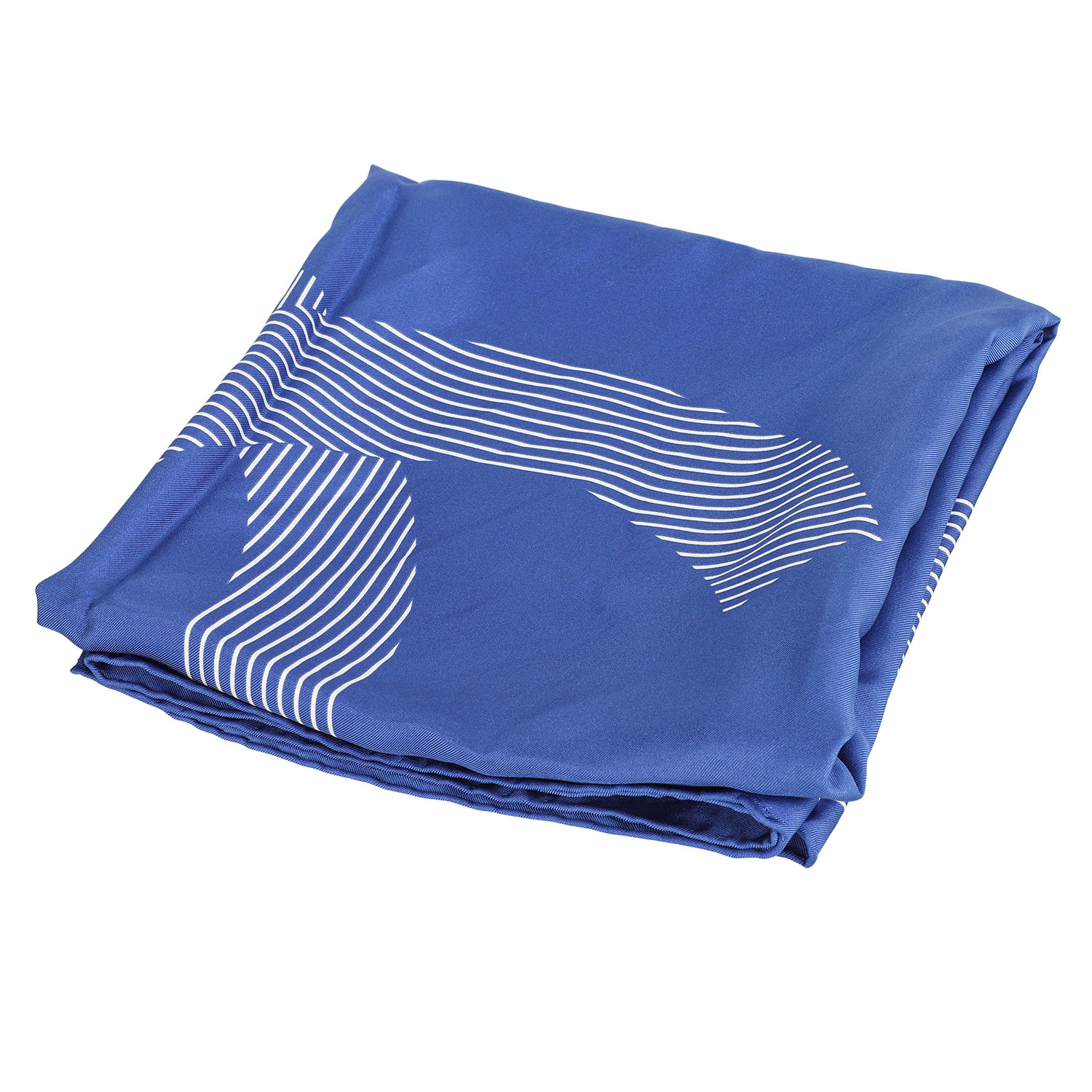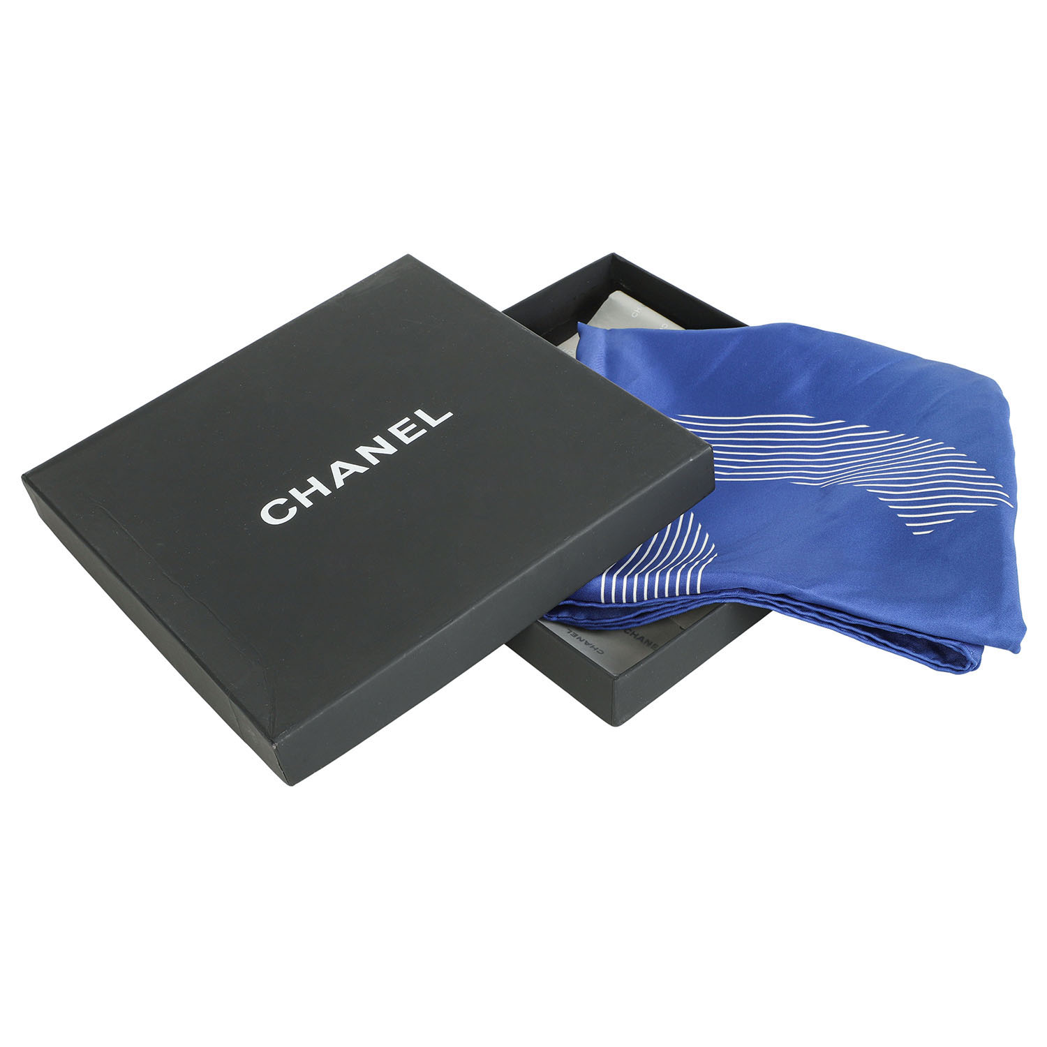 CHANEL silk carré, retail price: €530. 100% silk. Logo motif in blue and white. Hand-rolled hems. 90 x 90 cm. Signs of wear present, one hole, pulled thread present..