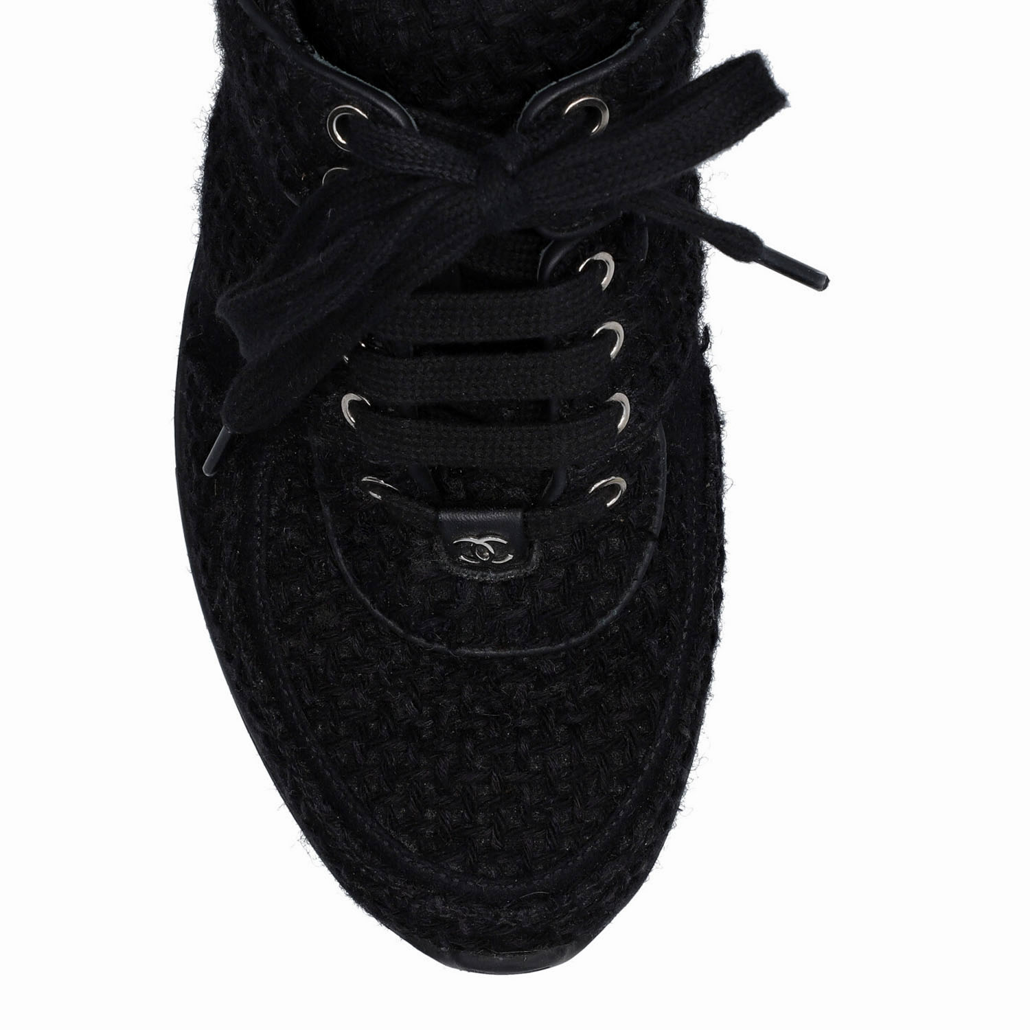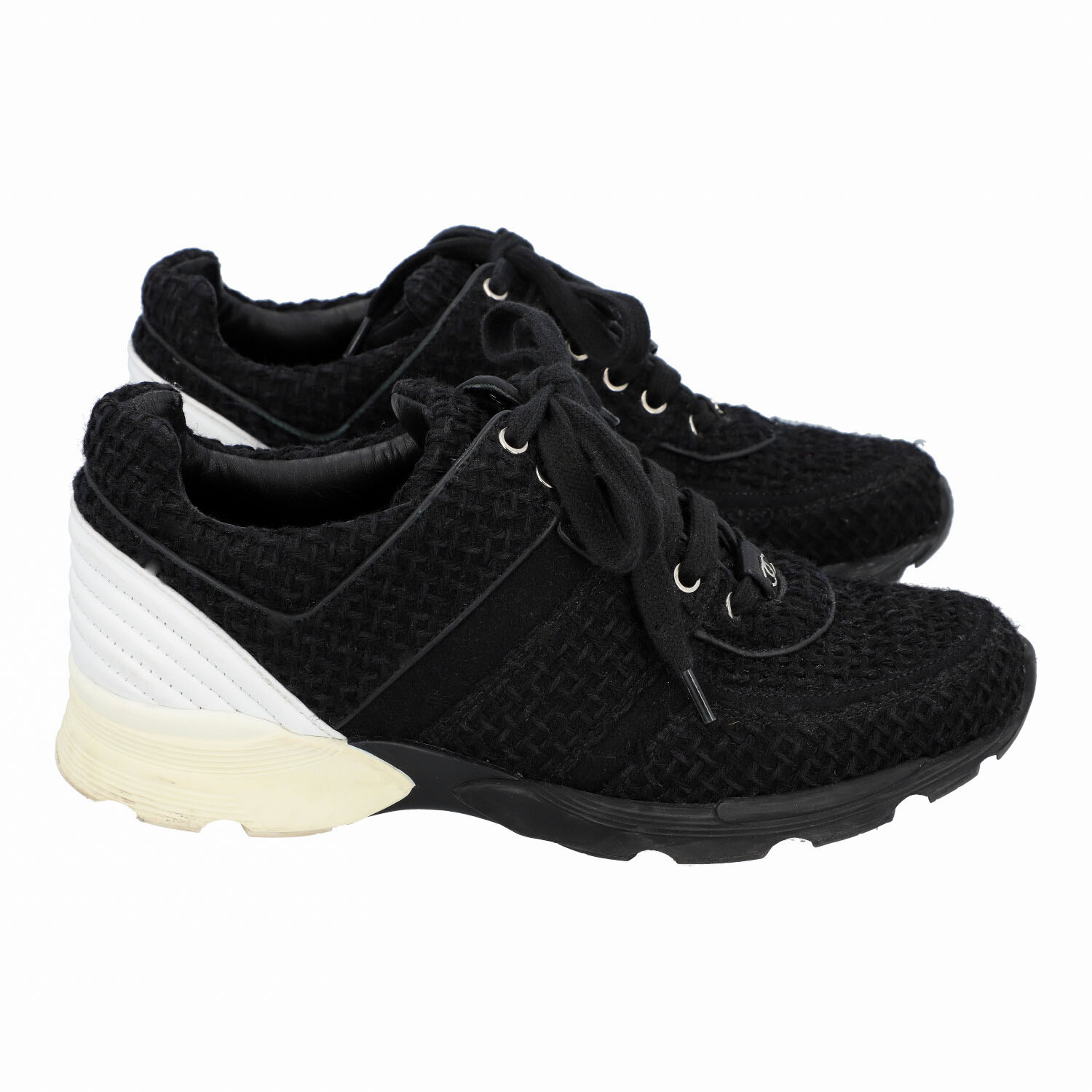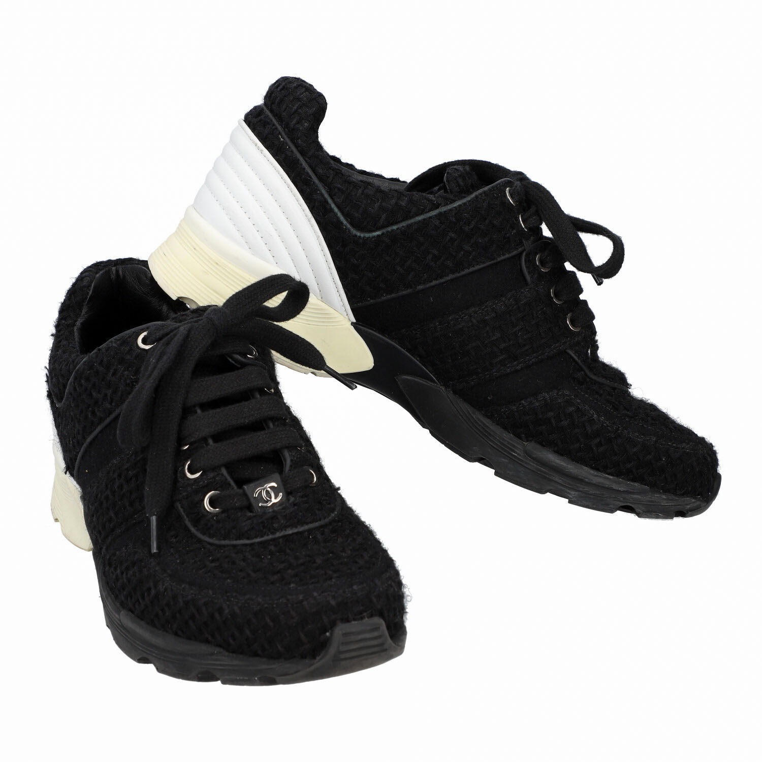 CHANEL sneaker, size 39,5, coll.: 2017. Black tweed model with lacing, silver-tone hardware, white leather decoration on the heel. Box, dust bag and invoice enclosed. Traces of wear present.