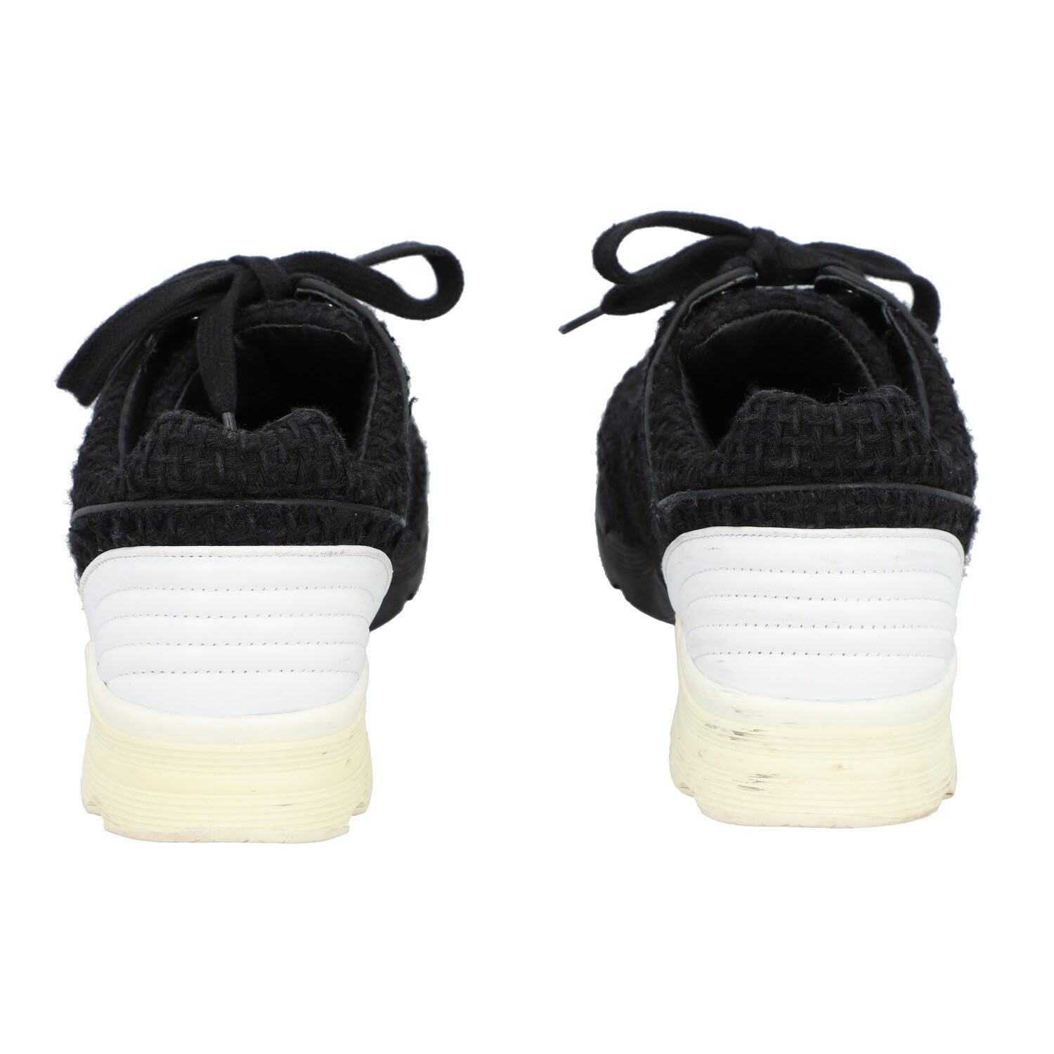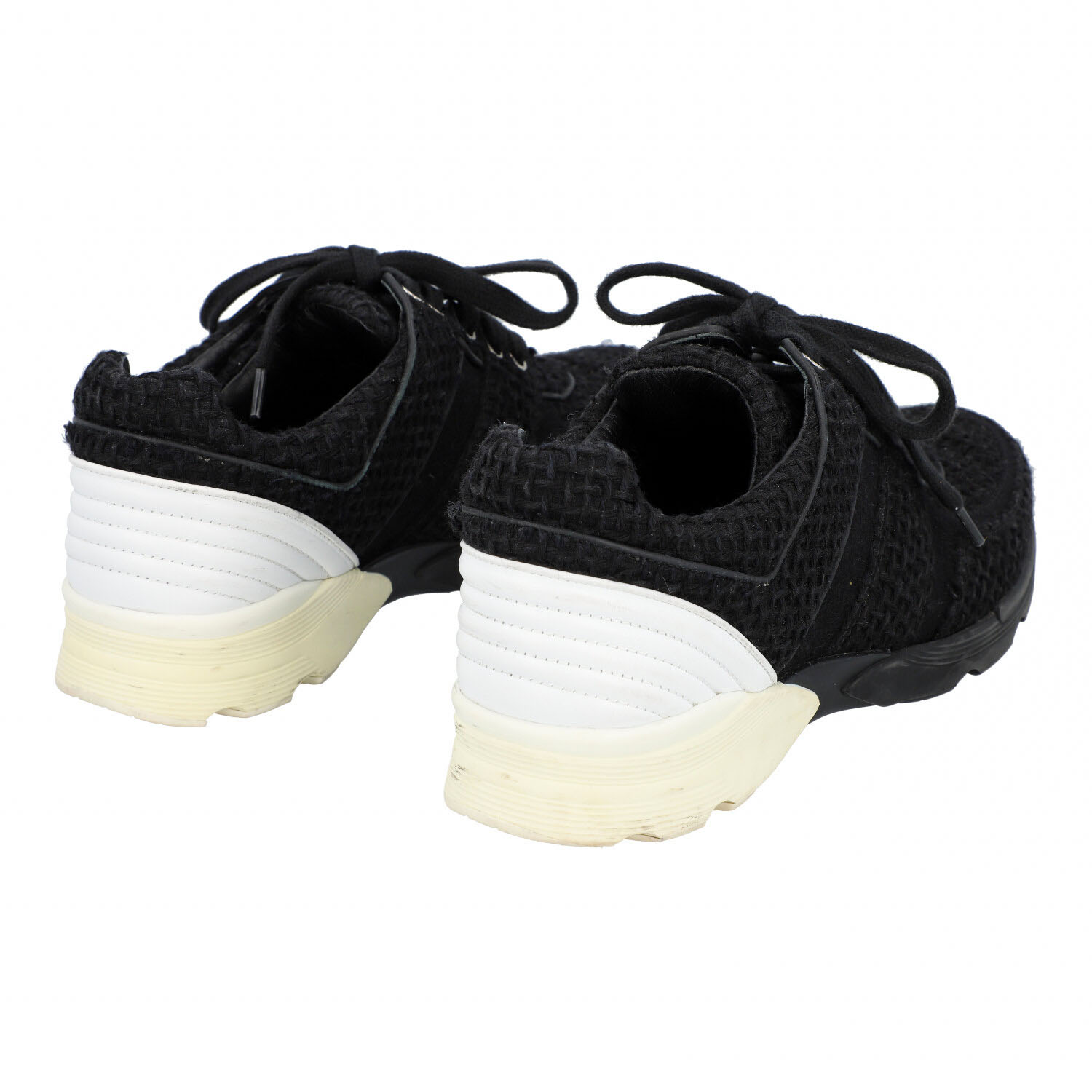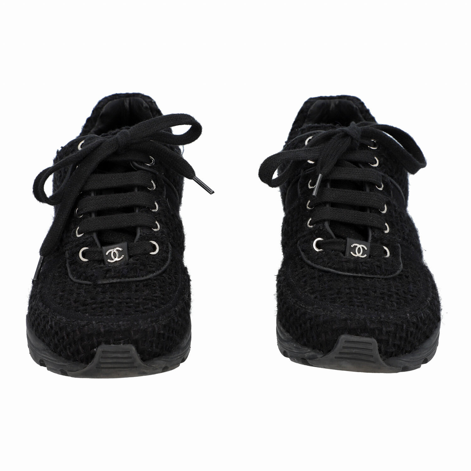 CHANEL sneaker, size 39,5, coll.: 2017. Black tweed model with lacing, silver-tone hardware, white leather decoration on the heel. Box, dust bag and invoice enclosed. Traces of wear present.