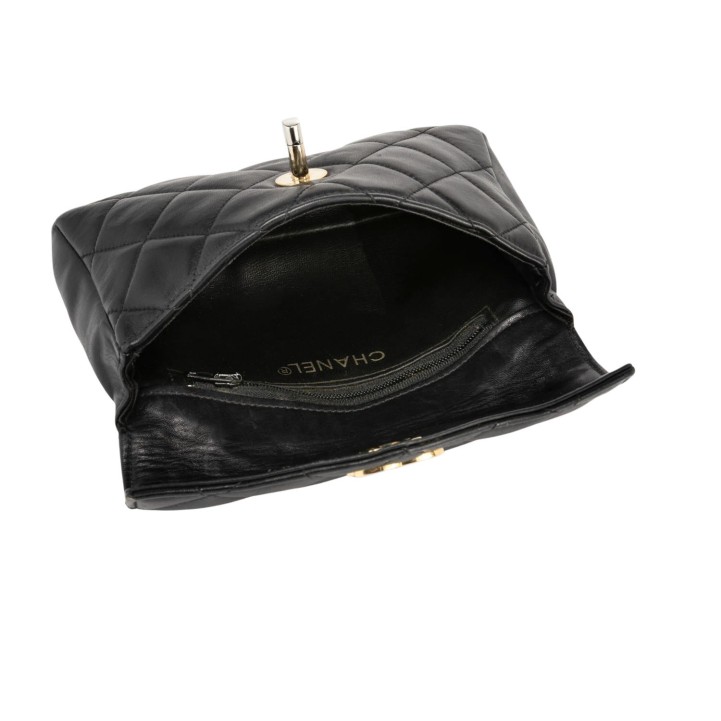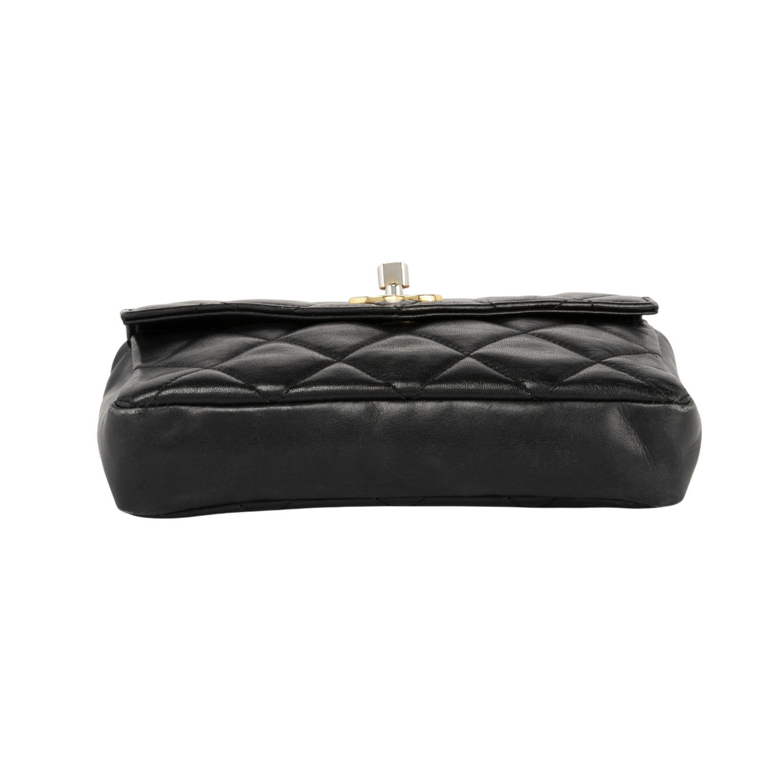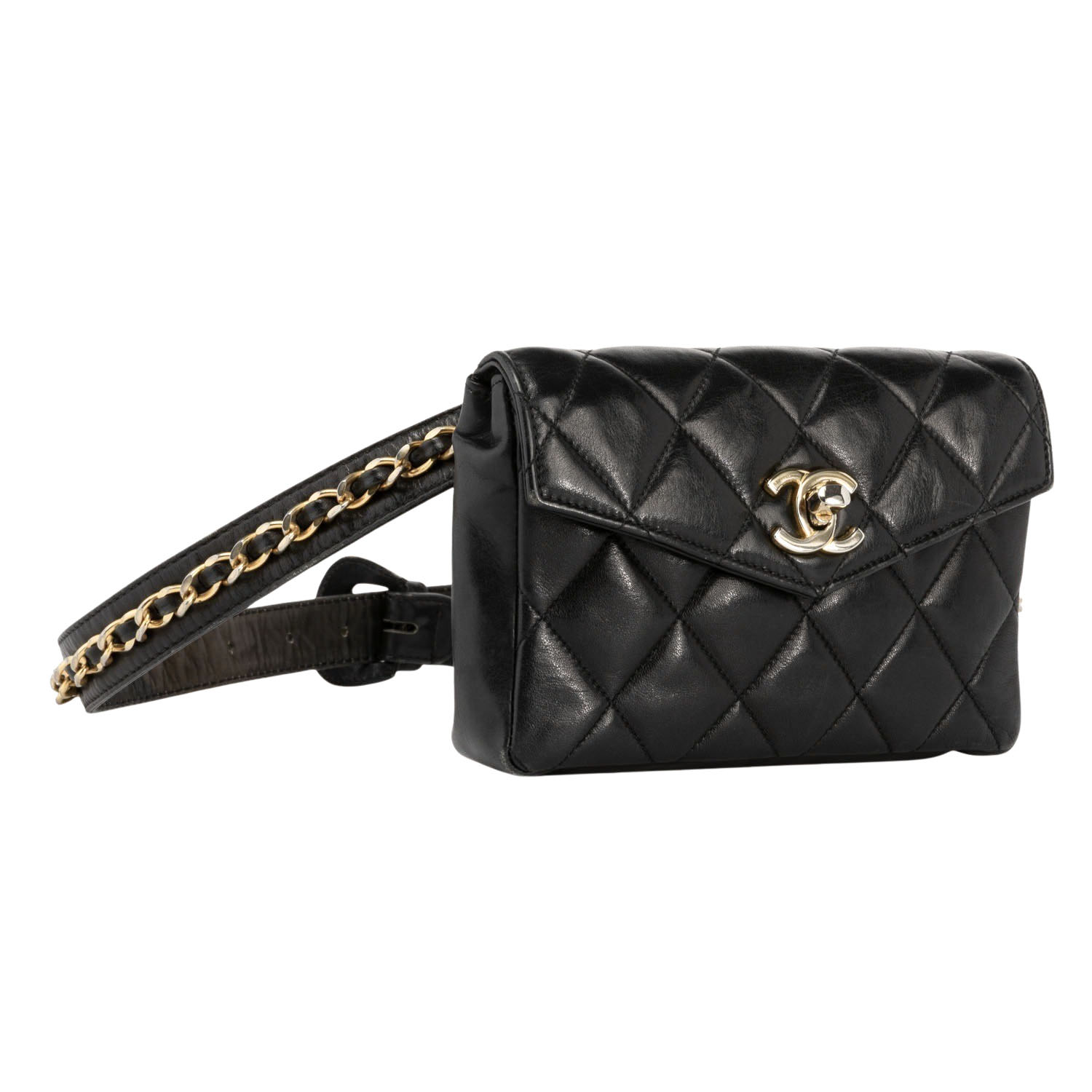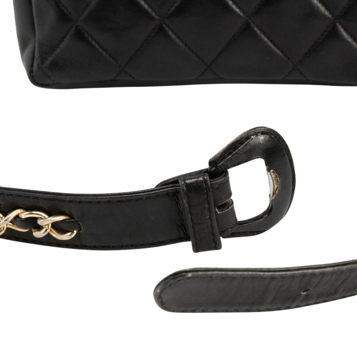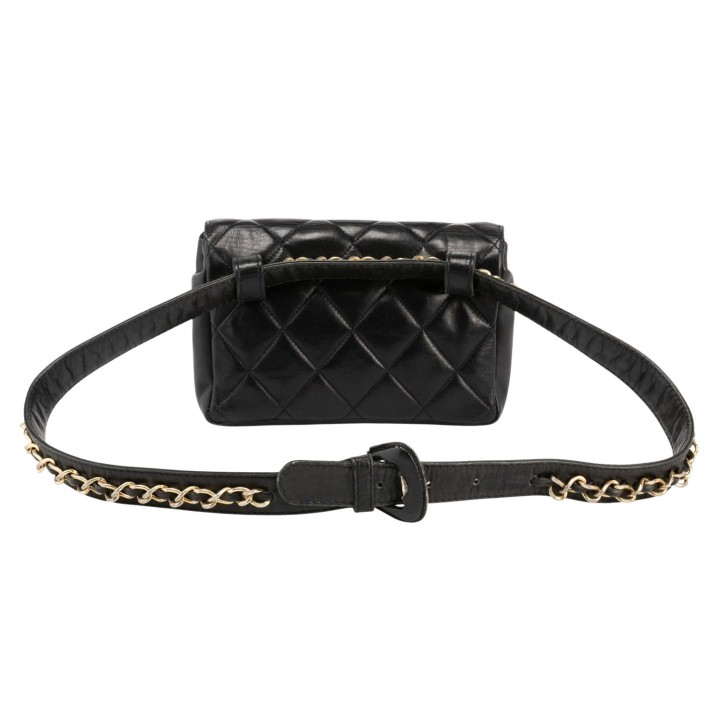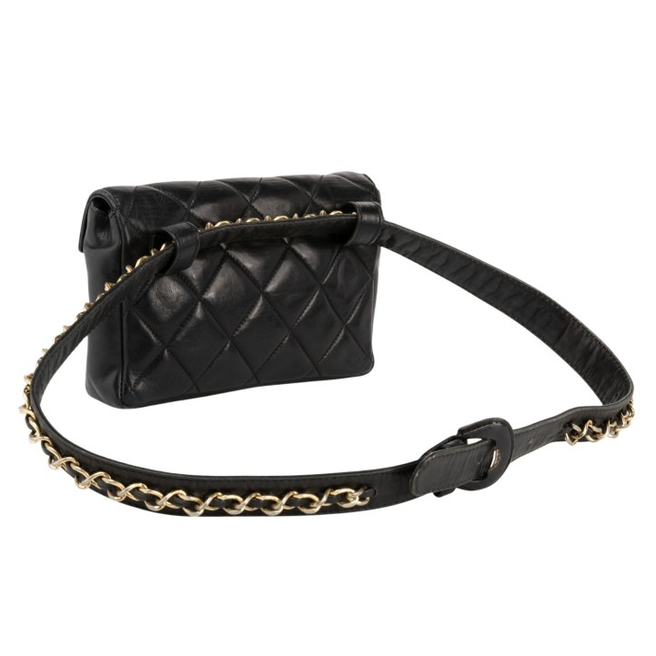 PRE-LOVED ITEM BY @JENNIFERKATHE - CHANEL VINTAGE belt bag. Made of black lambskin leather with classic diamond quilting and gold-colored hardware. Flap with CC twist lock. Leather strap with broken buckle (broken) and applied link chain interwoven with leather. Leather lining with small zippered interior compartment. Significant signs of age, no date code. 16.5x3.5x11cm. Belt lenght 85cm. With dustbag.