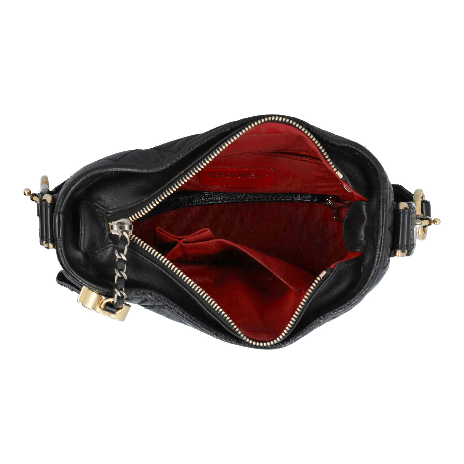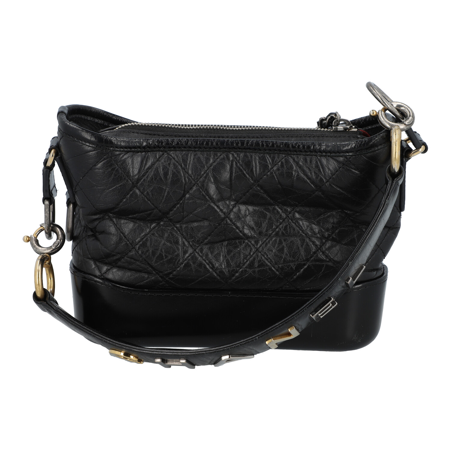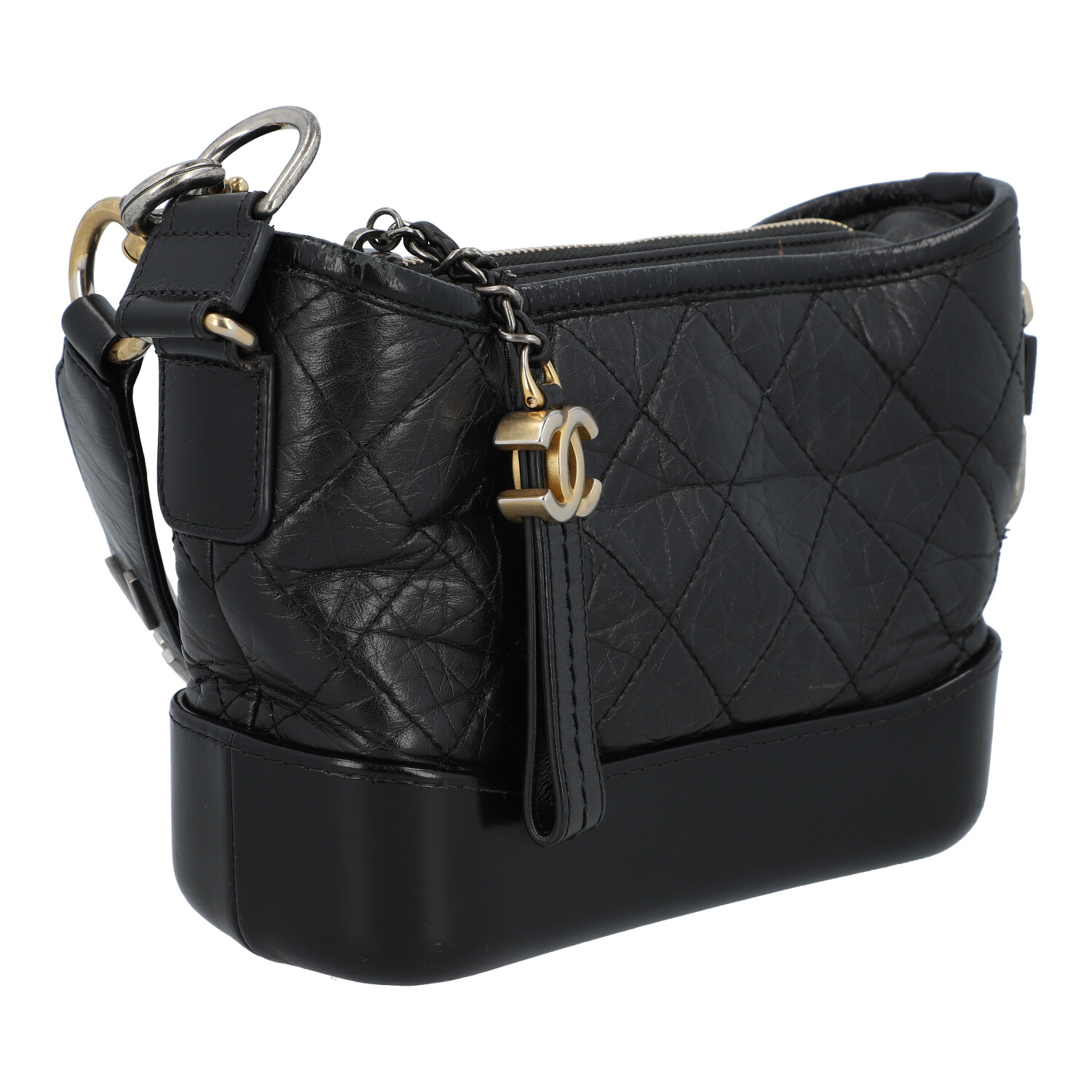 PRE-LOVED ITEM BY @TSCHARY - CHANEL shoulder bag ‘SMALL GABRIELLE’, coll.: 2019. Vintage-look black calfskin with diamond quilting, gold, silver and ruthenium-coloured hardware, zip fastening, short handle with logo decoration, long chain strap interwoven with leather. Interior in red with three compartments, one with zip. Box, ID card and invoice enclosed. Signs of wear, abrasion on the hardware, edges, scratches on the leather, stains. 20 x 7 x 14 cm.