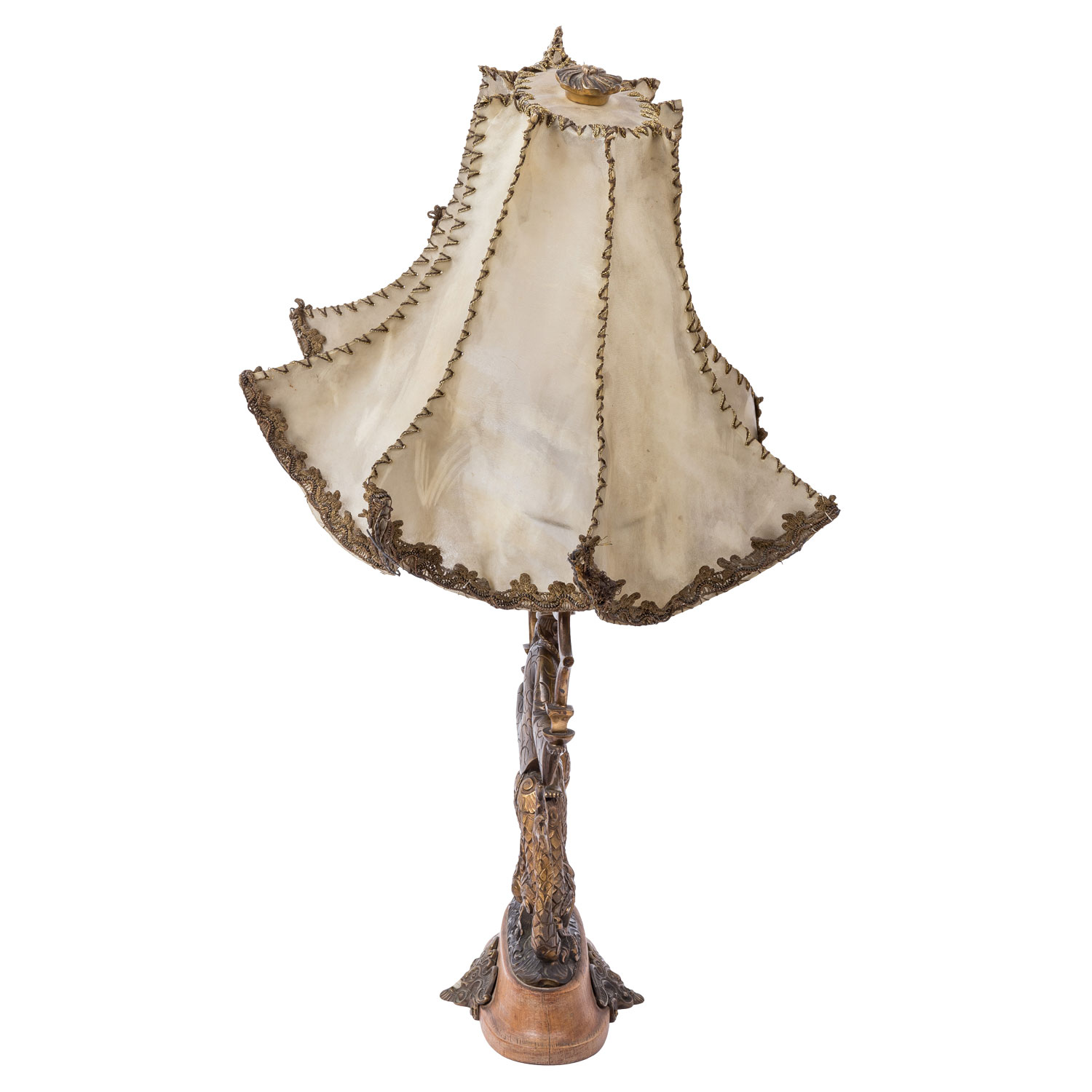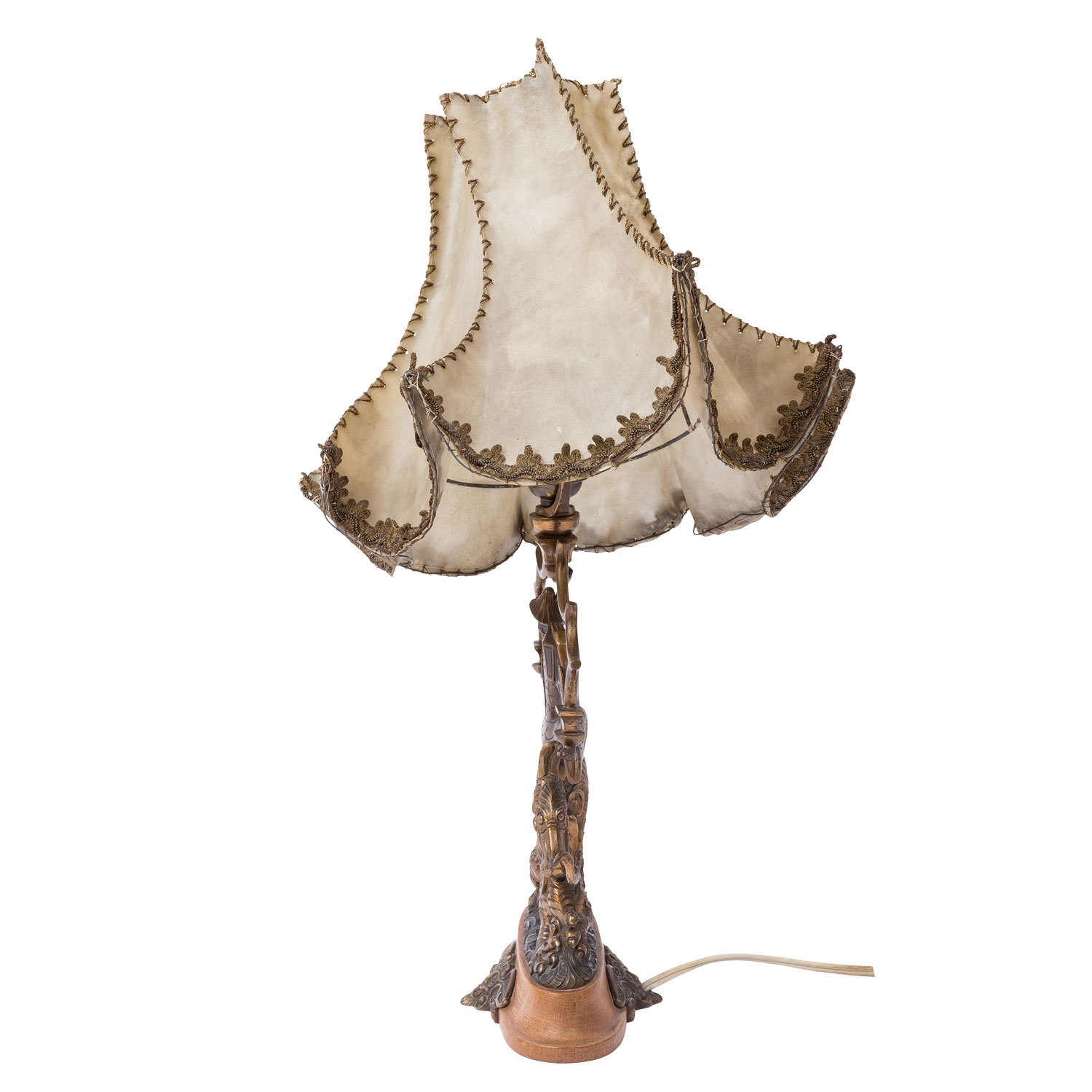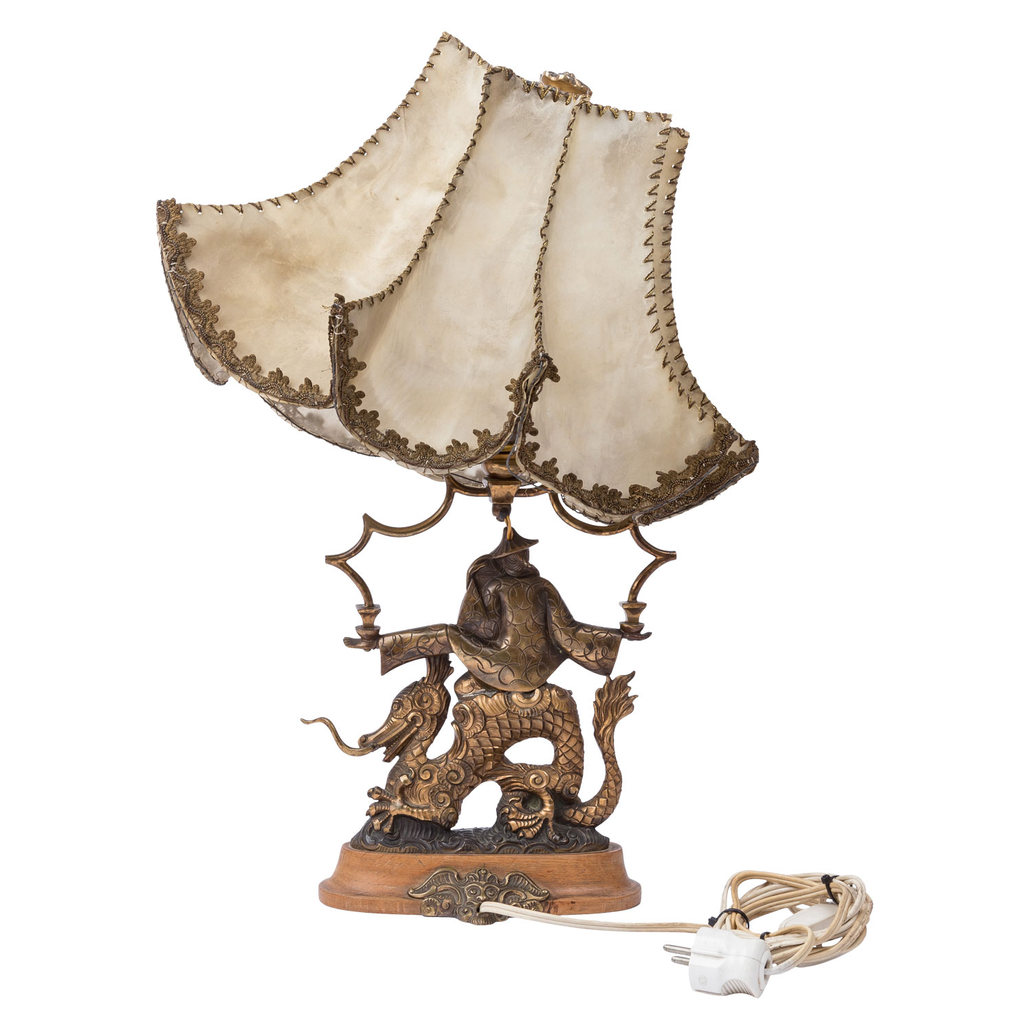 Chinoiserie table lamp, around 1920. Figural bronze lamp base in the shape of a scholar riding the waves on the back of a dragon. The lampshade is made of parchment leather and attached to a solid bronze arm in such a way that it allows the lampshade to tilt backwards at an angle, which is intended to depict the movement and dynamics of riding waves in the wind. The seal on the underside reads “Hans Zametzer-Bronce-Kunstwerkstätten München Obermenzing”. Height with lampshade and oval wooden base: approx. 54 cm. Signs of age and use, dam.