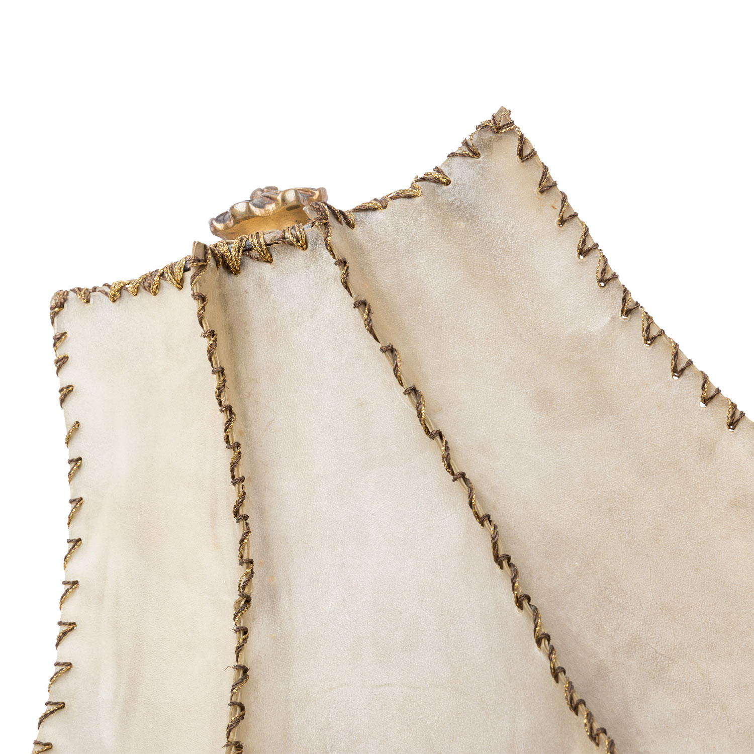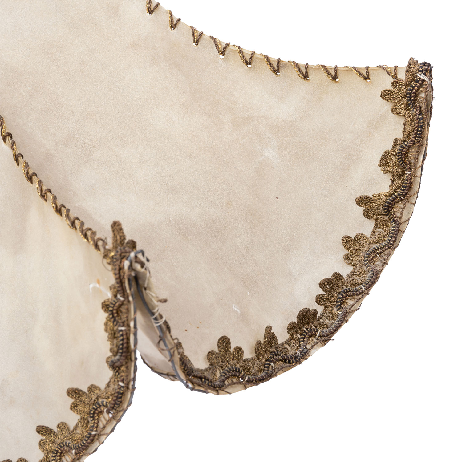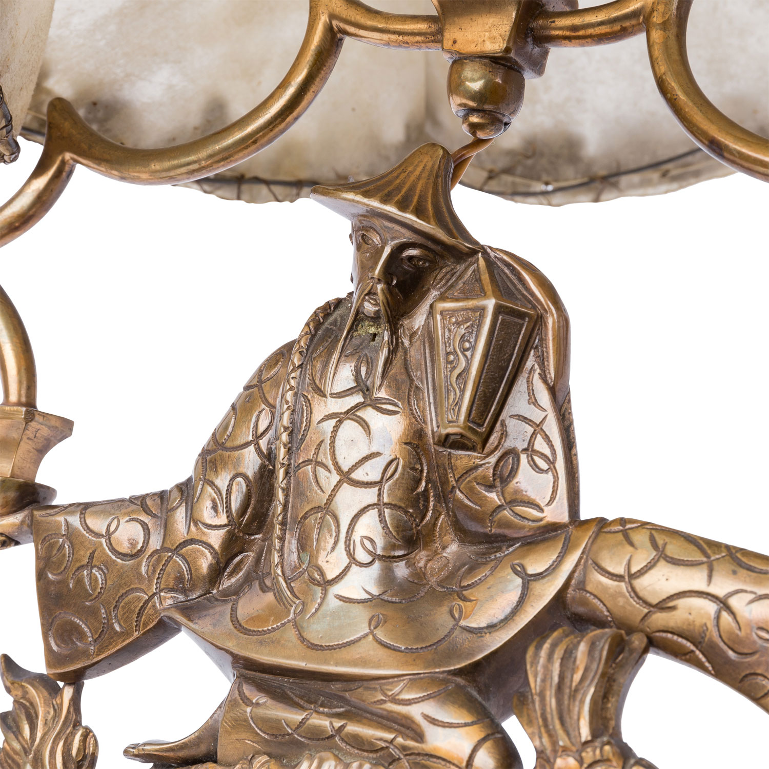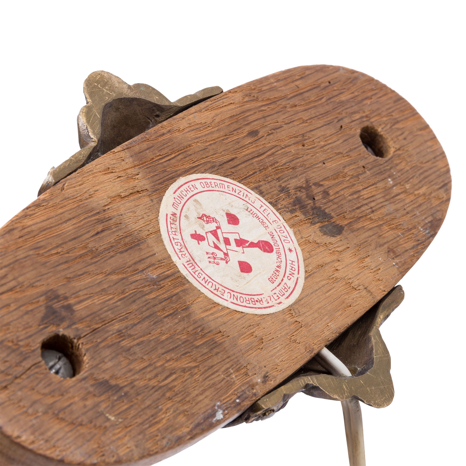 Chinoiserie table lamp, around 1920. Figural bronze lamp base in the shape of a scholar riding the waves on the back of a dragon. The lampshade is made of parchment leather and attached to a solid bronze arm in such a way that it allows the lampshade to tilt backwards at an angle, which is intended to depict the movement and dynamics of riding waves in the wind. The seal on the underside reads “Hans Zametzer-Bronce-Kunstwerkstätten München Obermenzing”. Height with lampshade and oval wooden base: approx. 54 cm. Signs of age and use, dam.