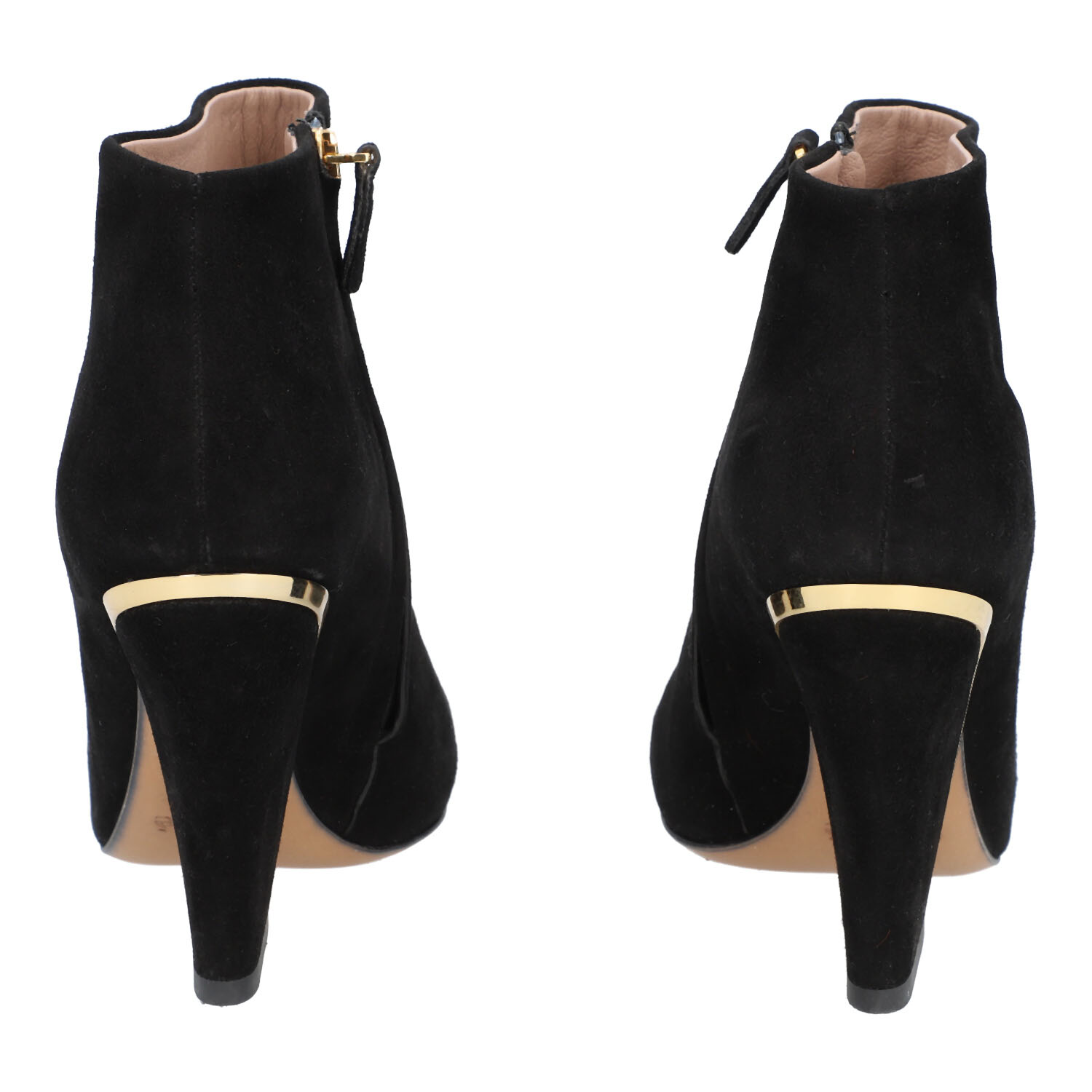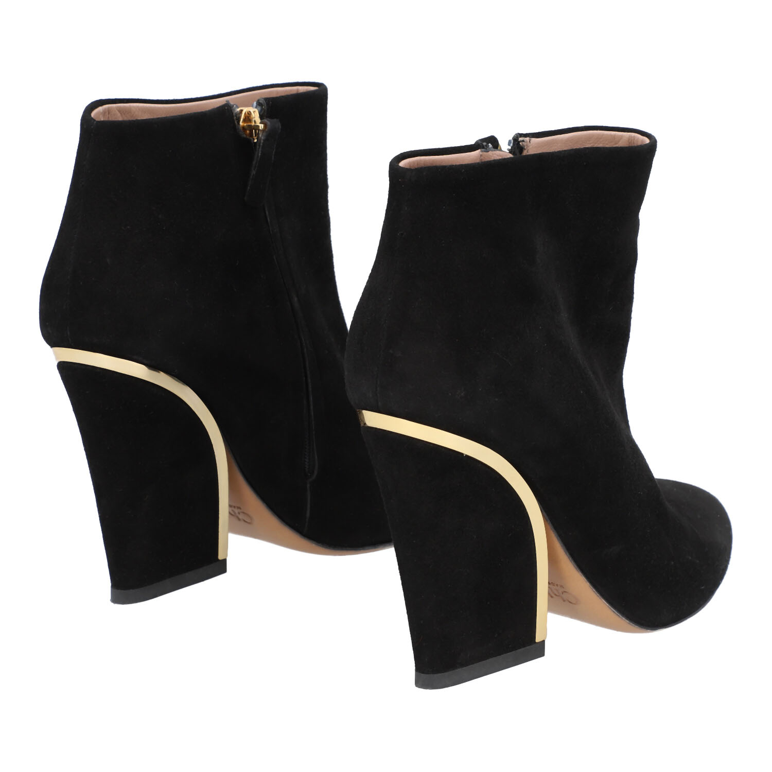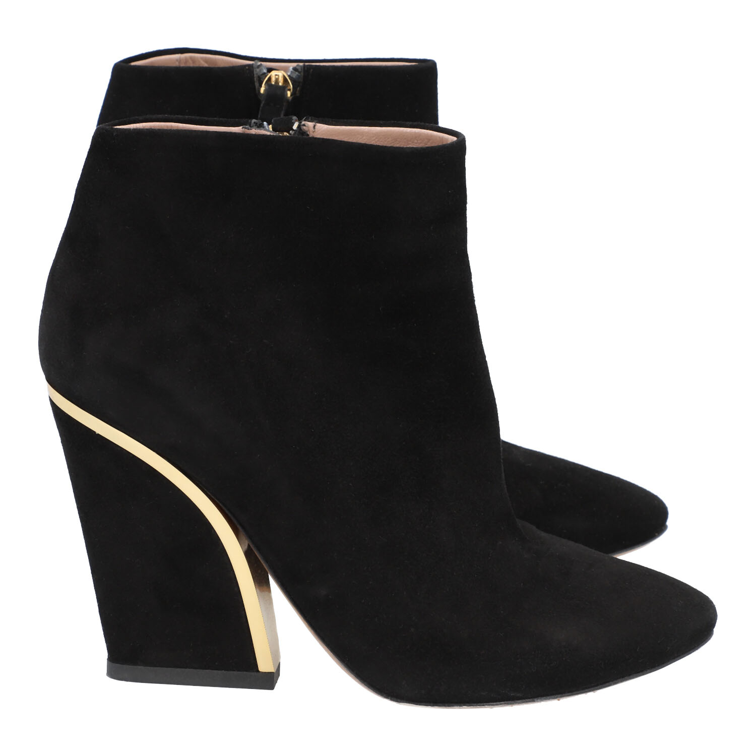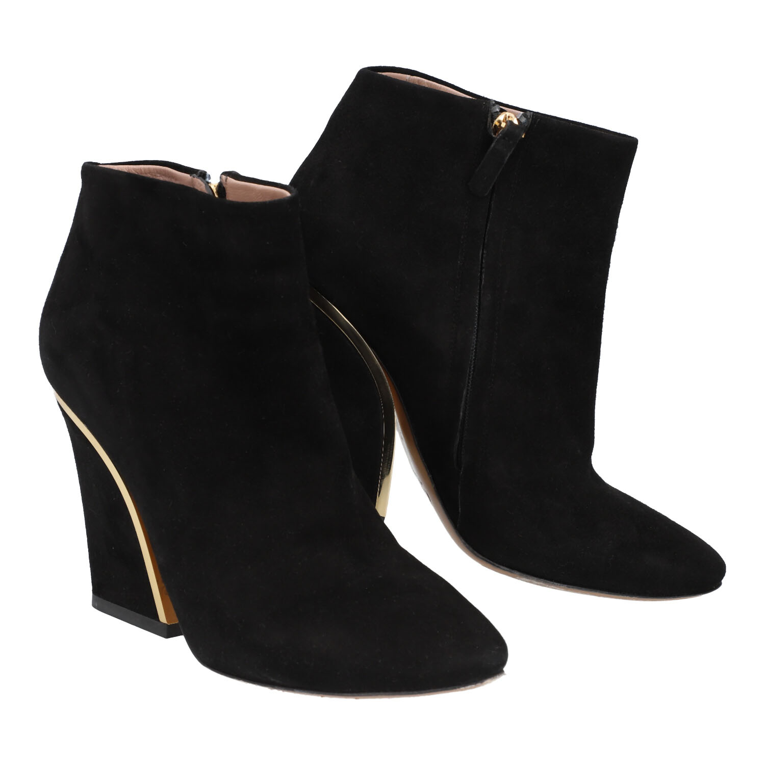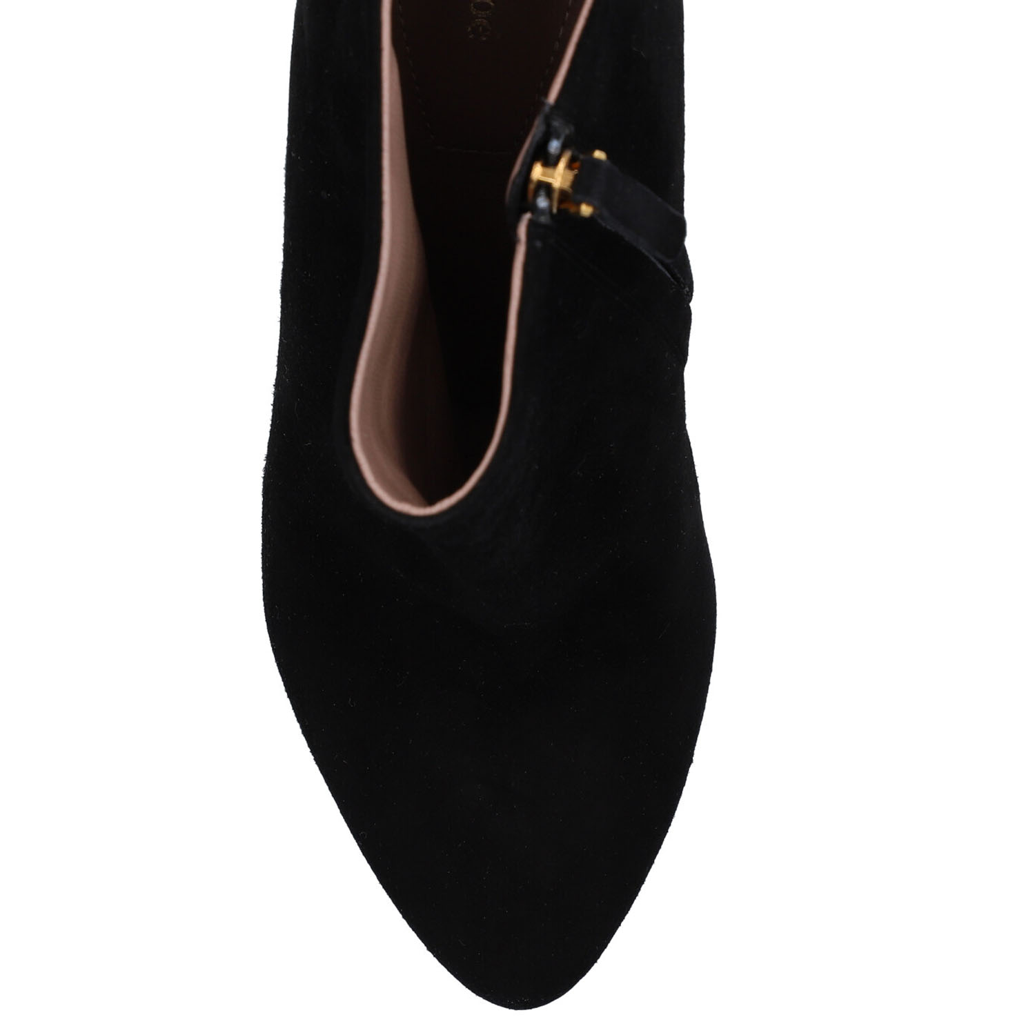 CHLOÉ ankle boots, size 37, suede in black with side zipper and pointed toe. Heel (height approx. 9 cm) with gold-colored decoration. Slight signs of wear. Box and dust bag enclosed.