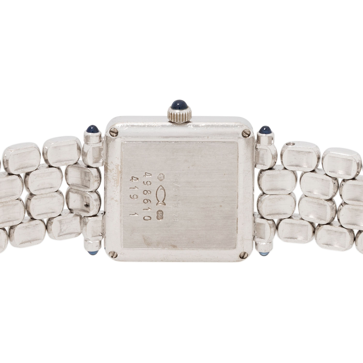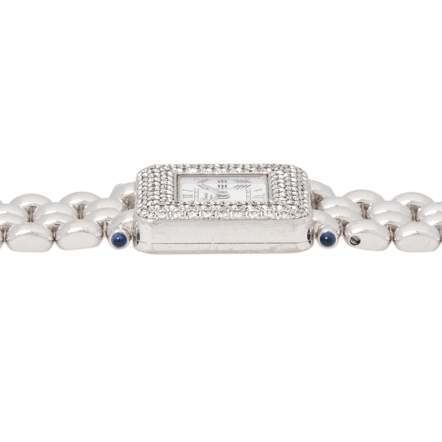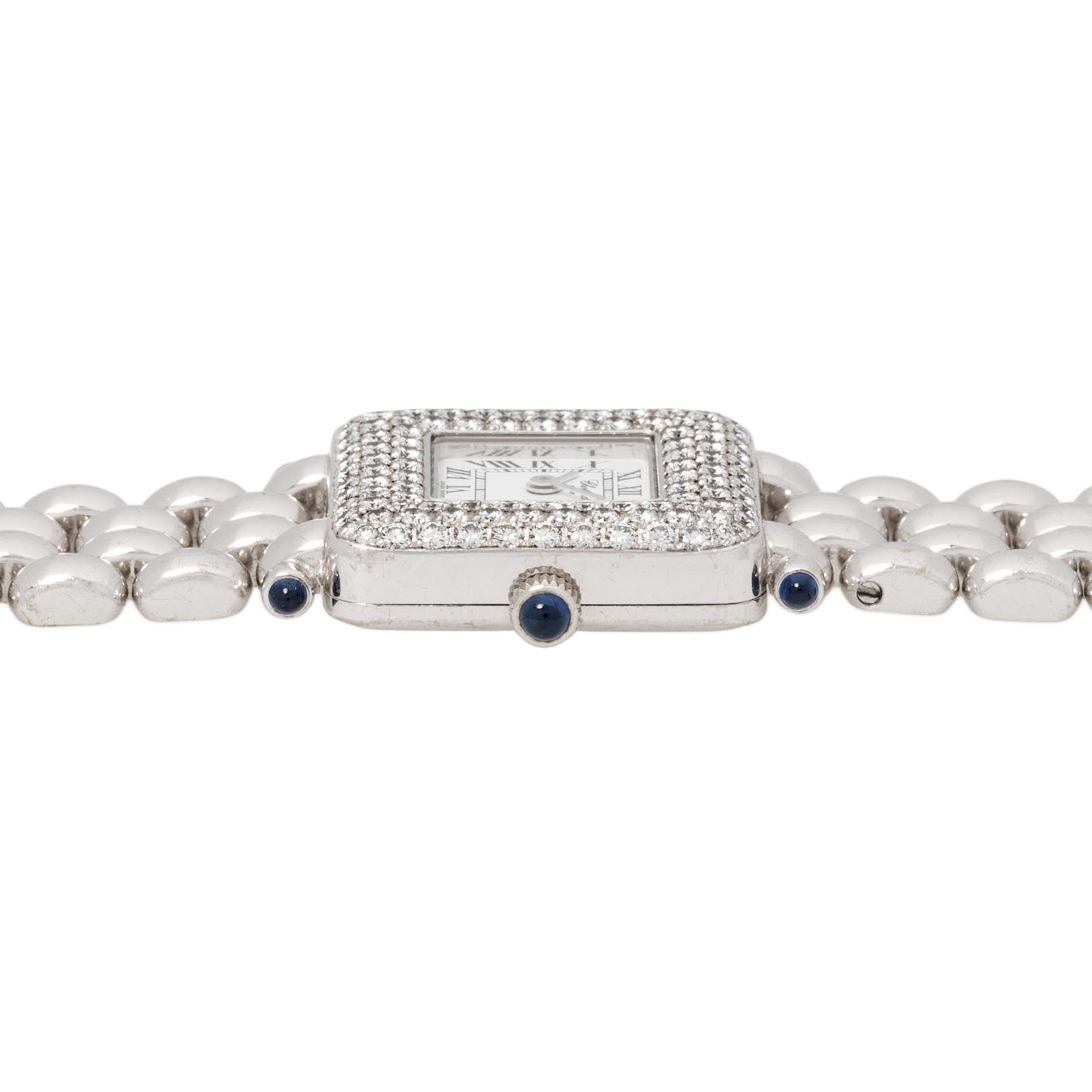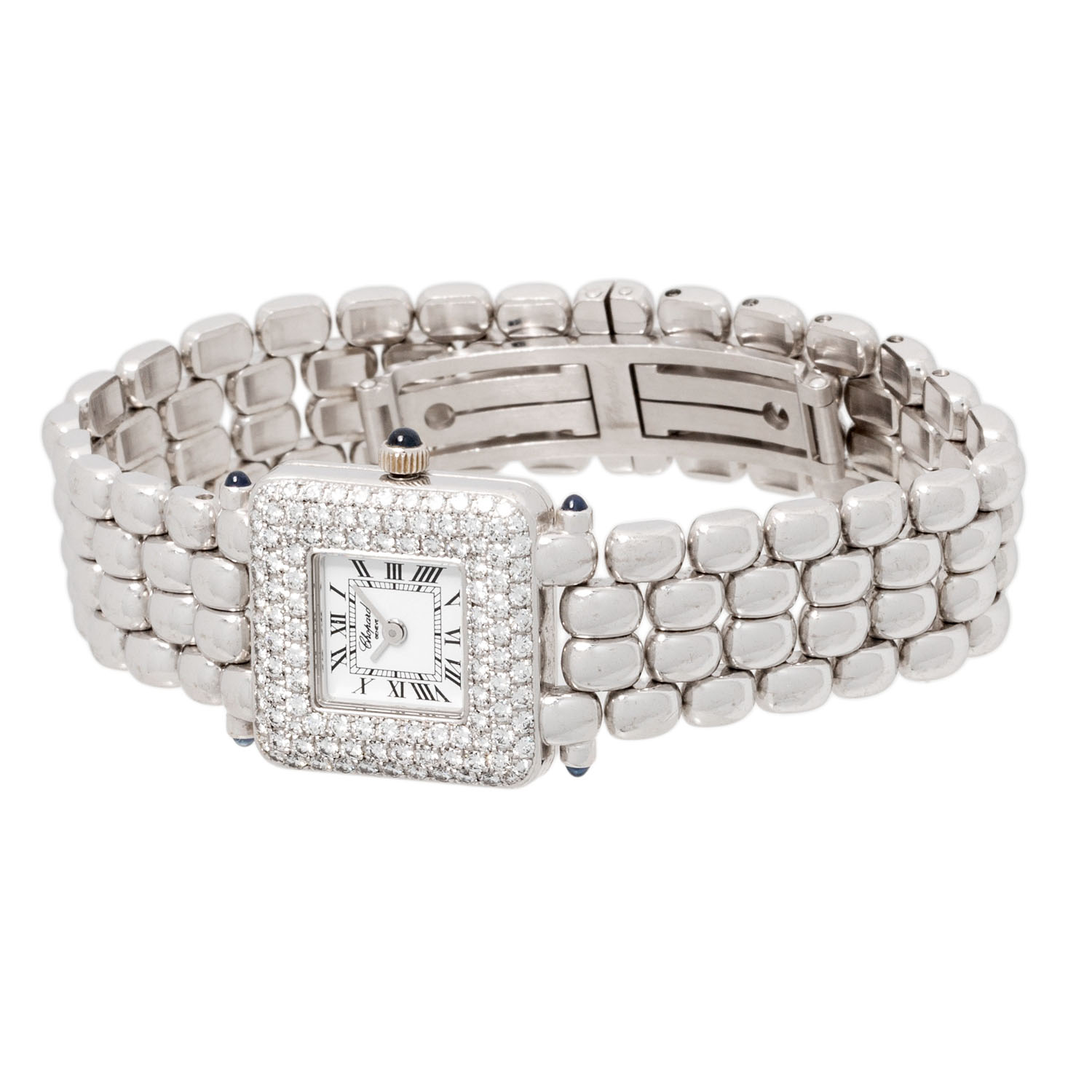 CHOPARD Classic Square ref. 10/6115-23 ladies' wristwatch. 18k white gold, crown and lugs with blue sapphire cabachons, case set with 112 brillant cut diamonds, serial no° 498610. Quartz movement with new battery, movement running. White dial with Roman numerals and railroad minute track. 18k white gold beads-of-rice bracelet with butterfly clasp. Used condition, signs of wear visible on the bracelet and case. Diameter approx. 21 mm measured without crown. Suitable up to a wrist circumference of approx. 17 cm.