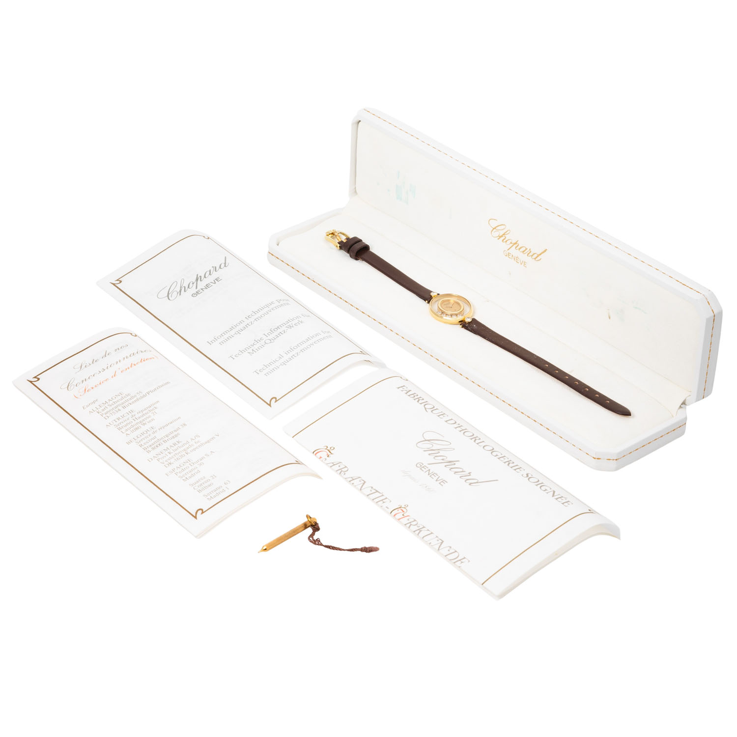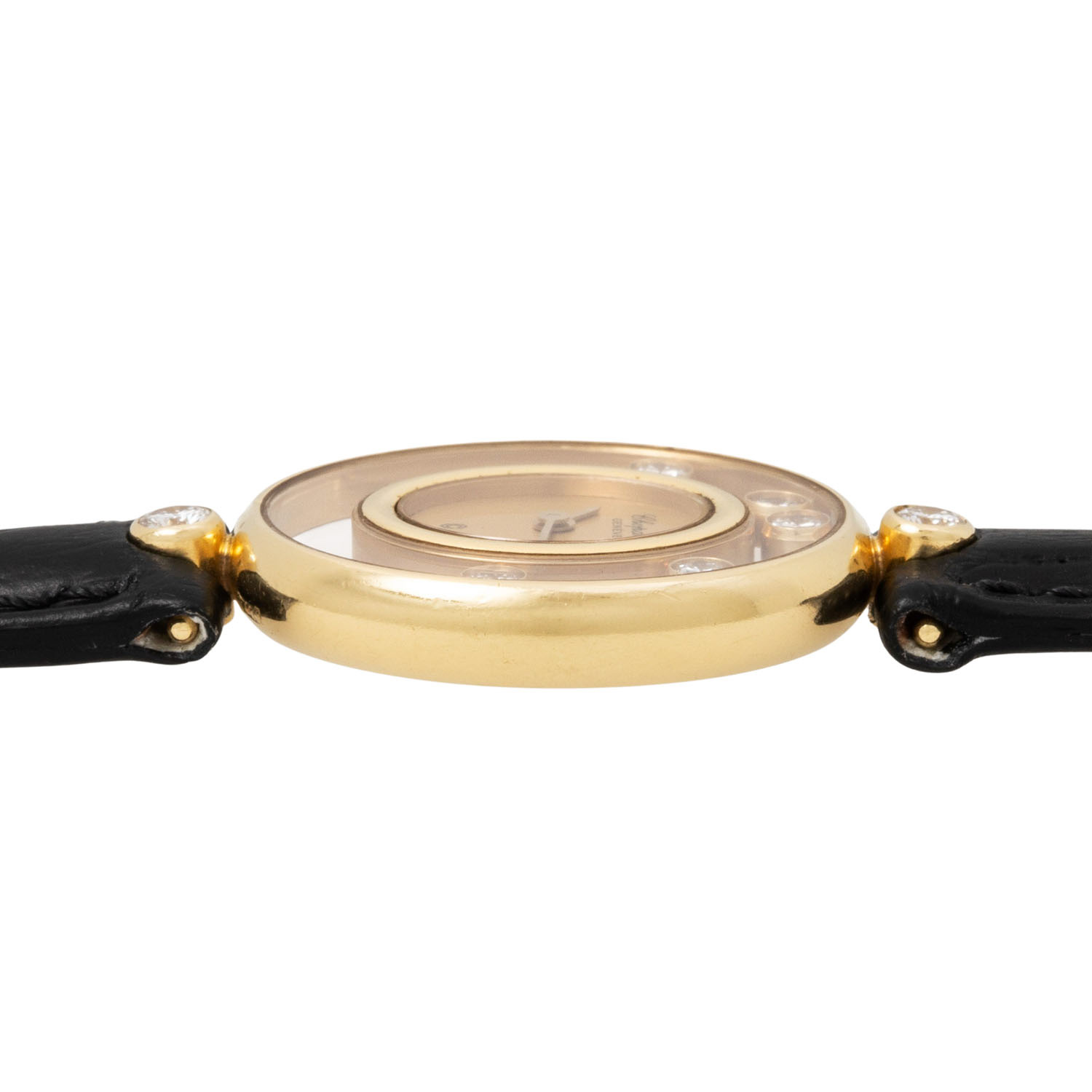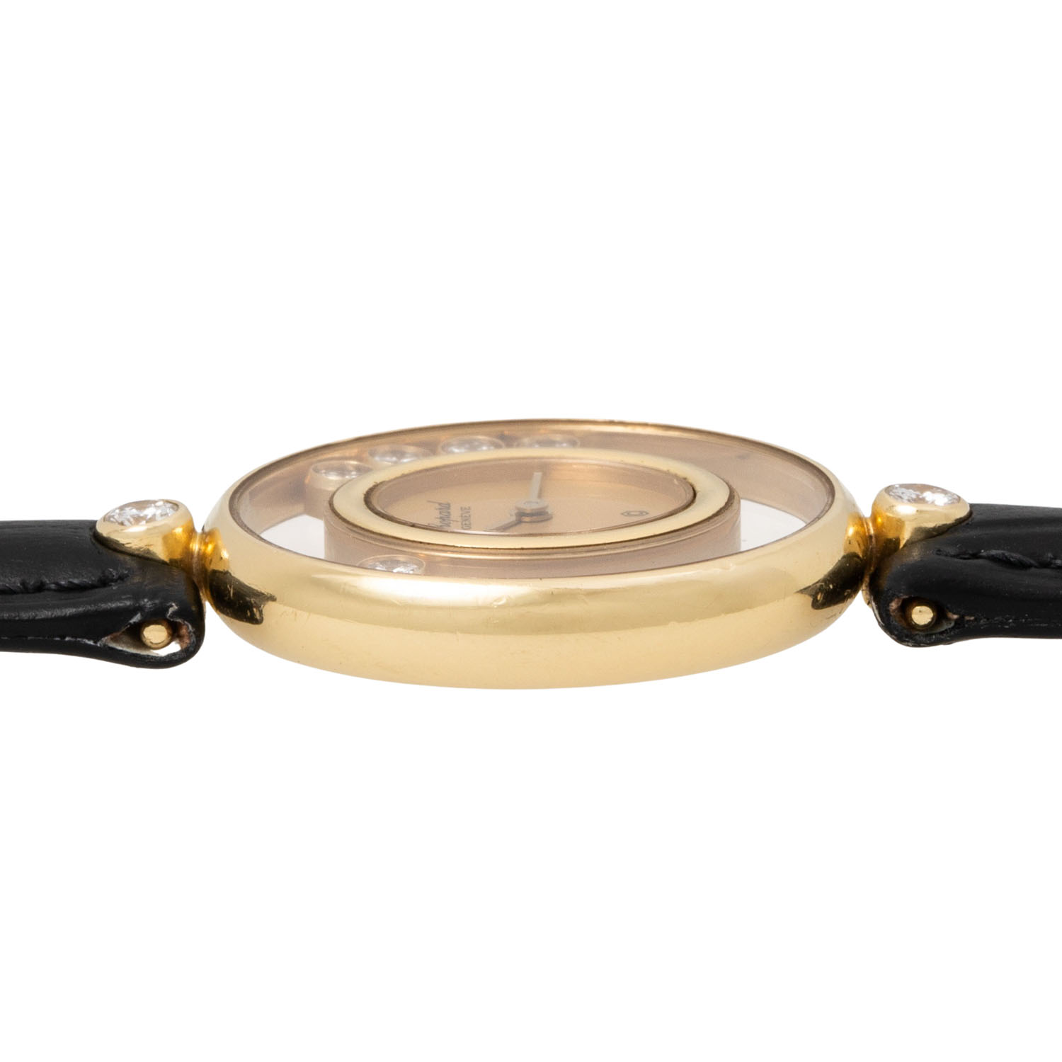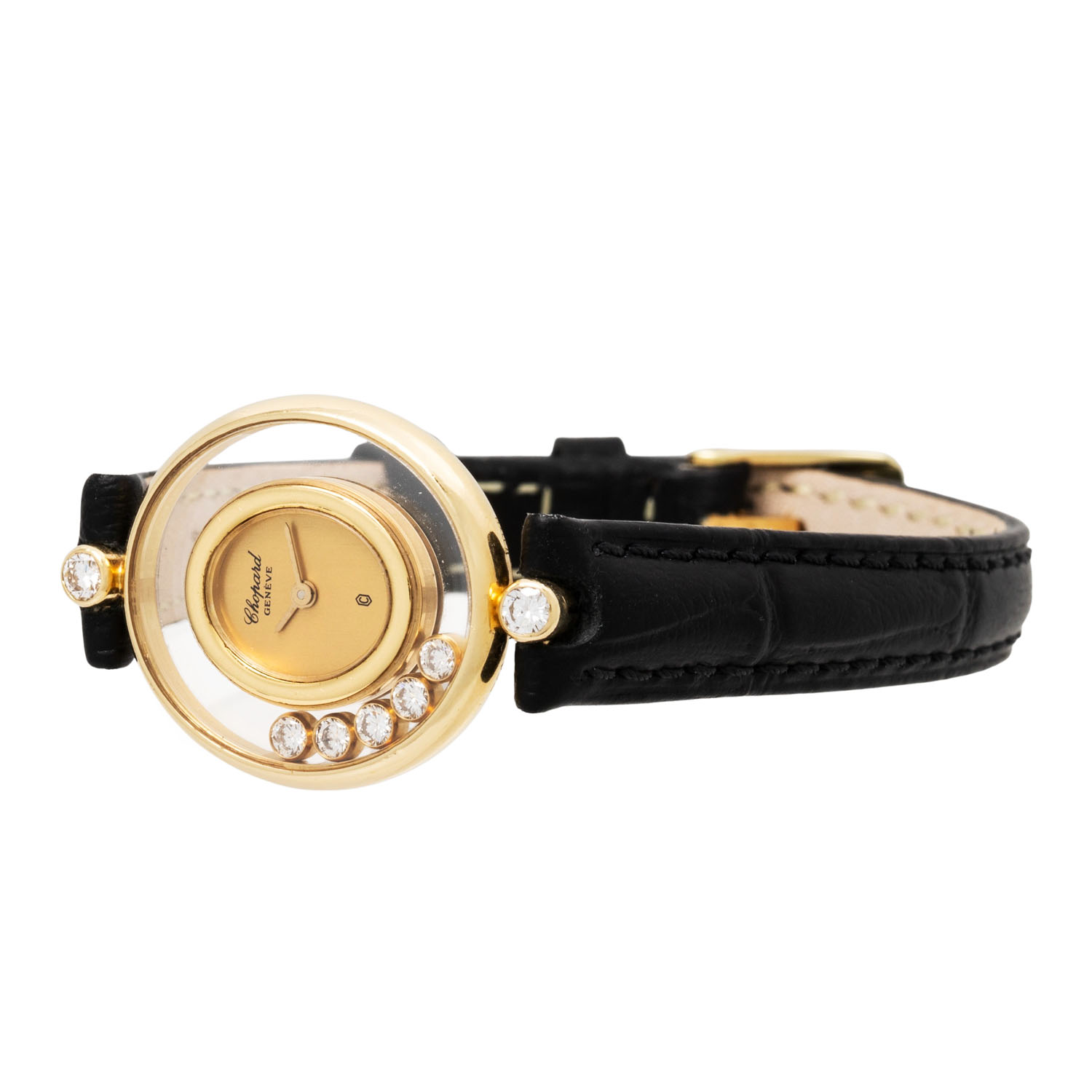CHOPARD Happy Diamonds 5198 ladies wristwatch. 18K yellow gold with 2 brilliant-cut diamonds on the lugs. Quartz movement in working condition. Dial with 5 diamonds. New leather strap with original pin buckle, gold-plated. Used, slight signs of wear on the case. Original box, blank guarantee certificate, instructions, proof of revision from 1991, setting pin and various battery change invoices enclosed. Diameter approx. 21.5 mm.