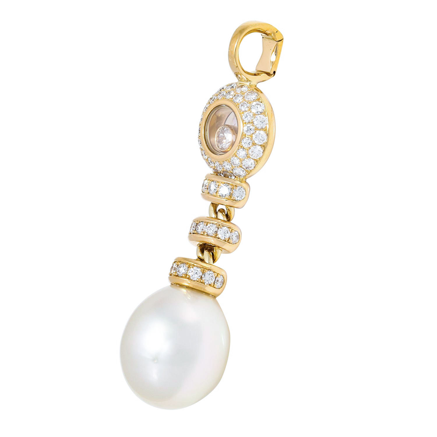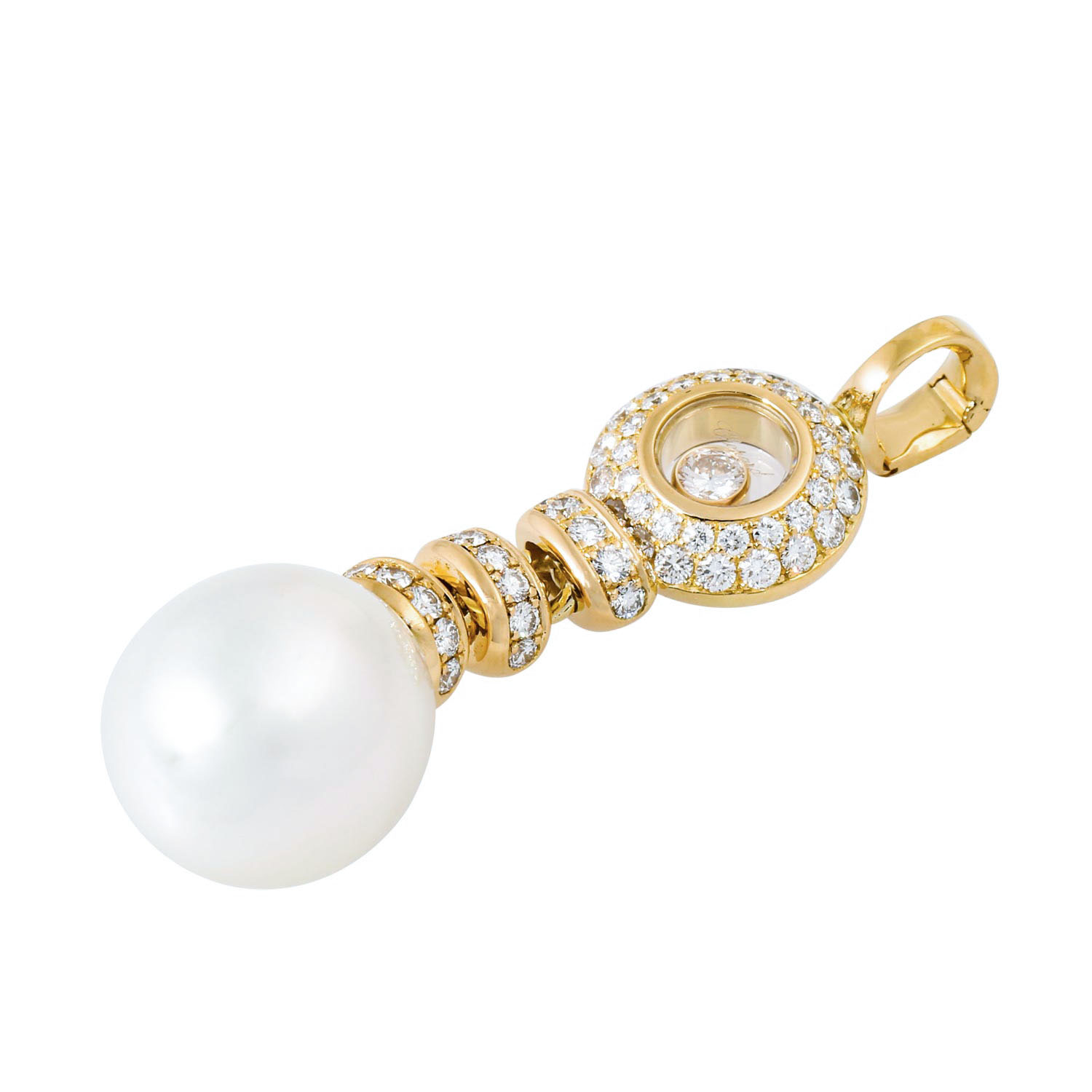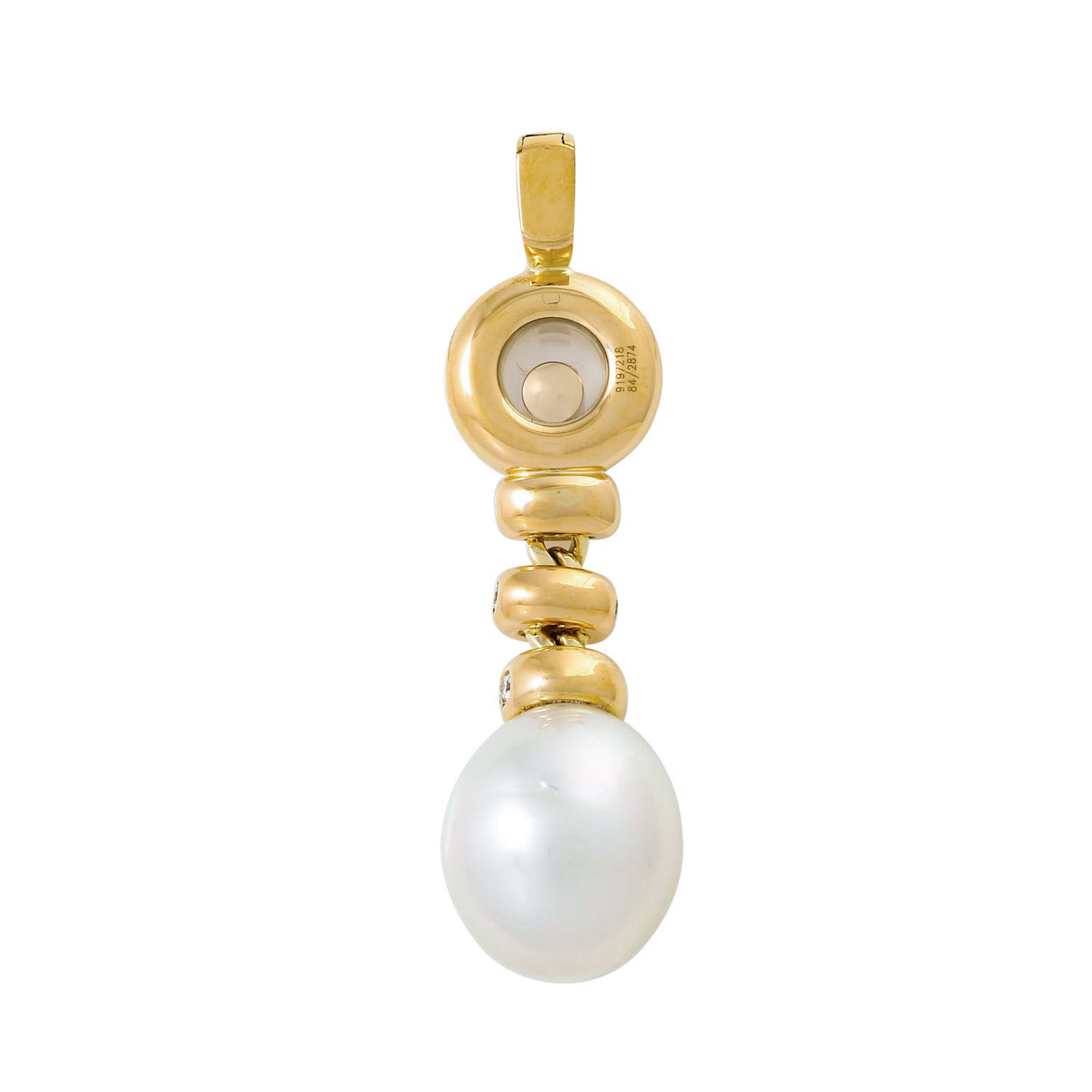 CHOPARD pendant 'Happy Diamondsd' with cultured pearl and brilliant-cut diamonds in total ca.0.94 ct, 18K YG, refurbished and packed in plastic foil (opened for photography), Last retail price ca. 25.200 €. Ref. 842874-0001, 1990s, mint condition, incl. copy of certificate and orignial case. Custom made piece by Chopard on request of the customer.