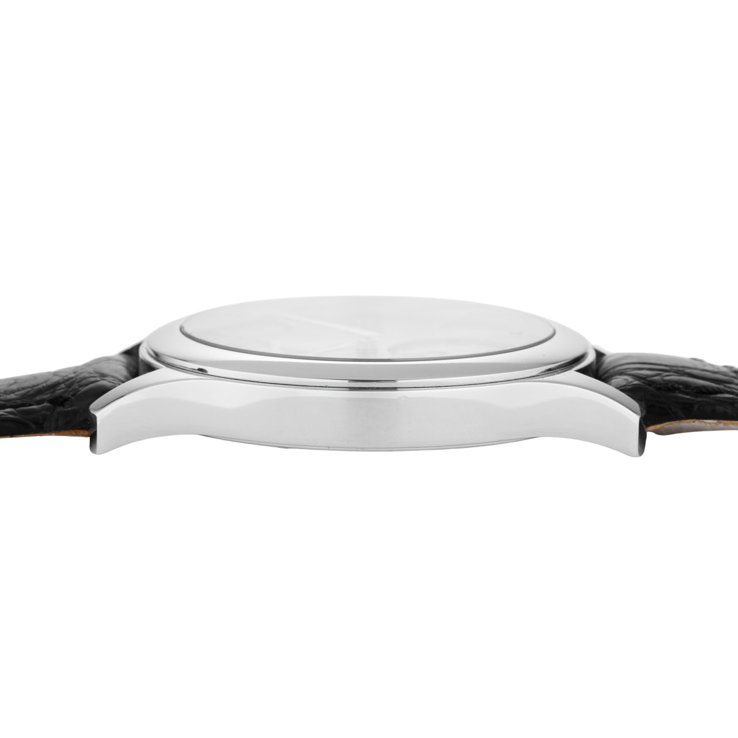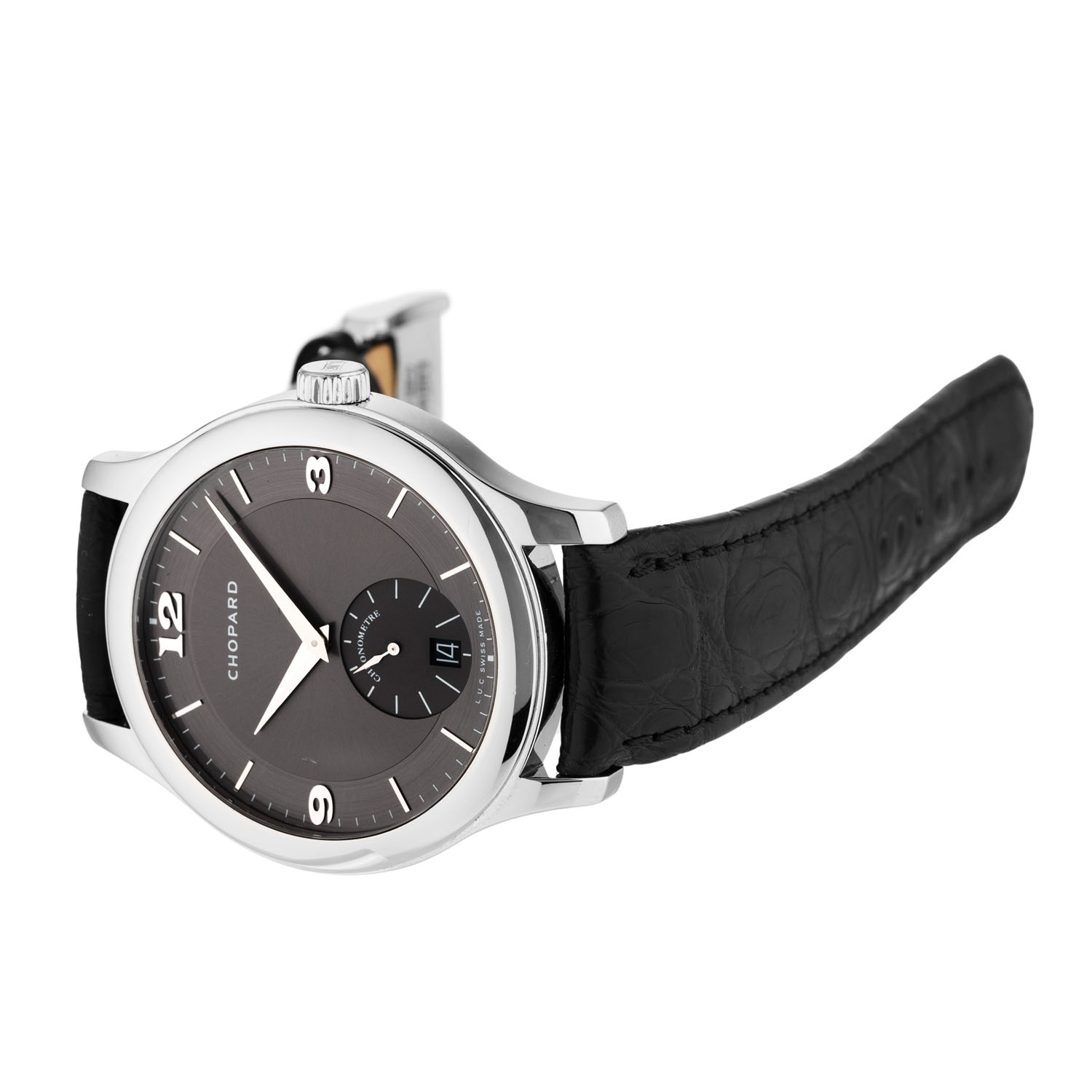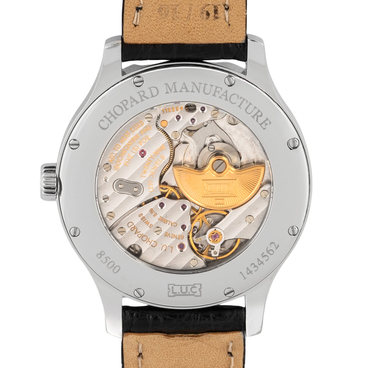 CHOPARD L.U.C. Mark III men's watch Ref. 8500 circa 2000s. Stainless steel with sapphire crystal case back. Automatic movement with micro-rotor Cal. 3.96 and 22K rotor. Good timekeeping +6 sec., 247° amplitude, service recommended. Slate gray dial with small seconds and date display at 6 o'clock. New leather strap with original pin buckle. Good condition, slight signs of wear. Diameter approx. 39.5 mm, measured without crown.