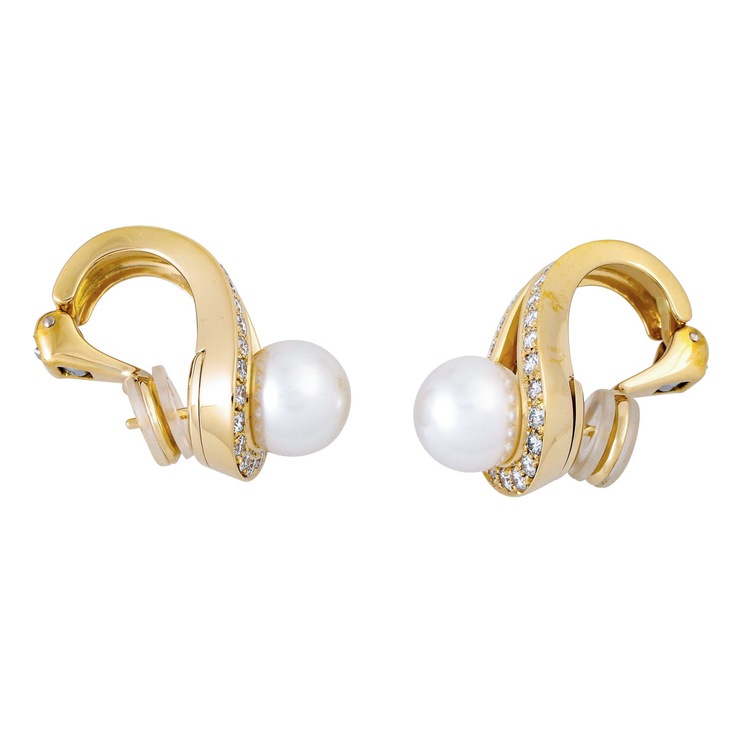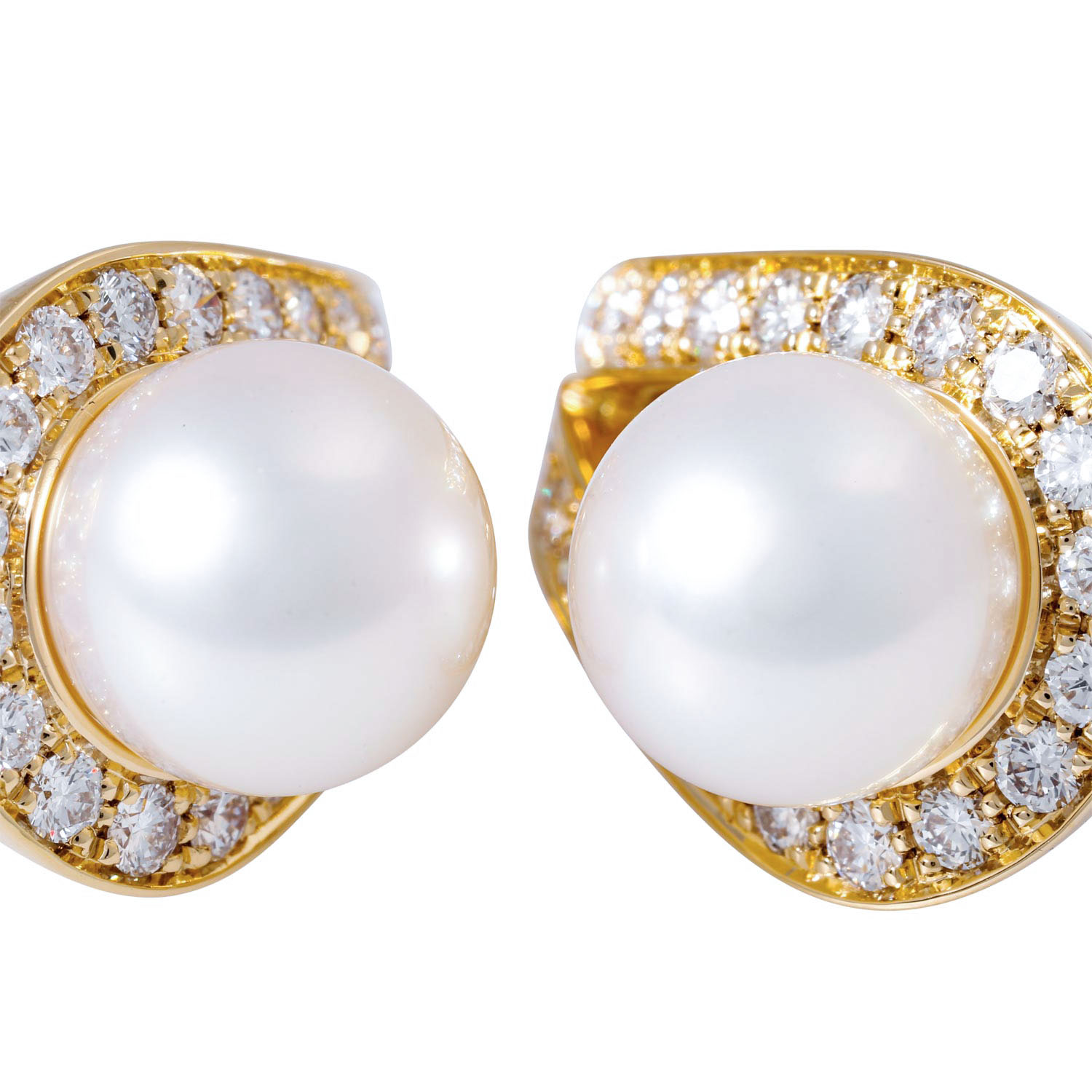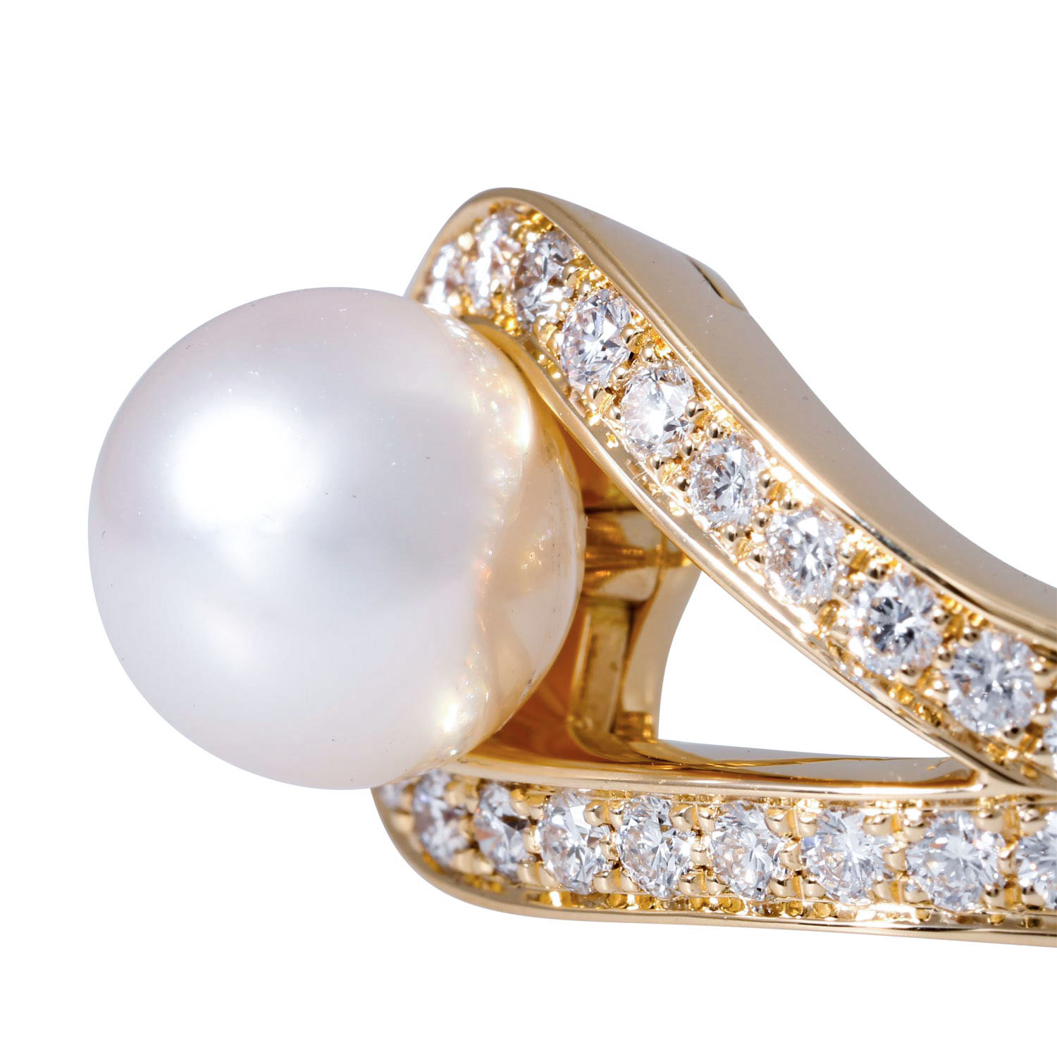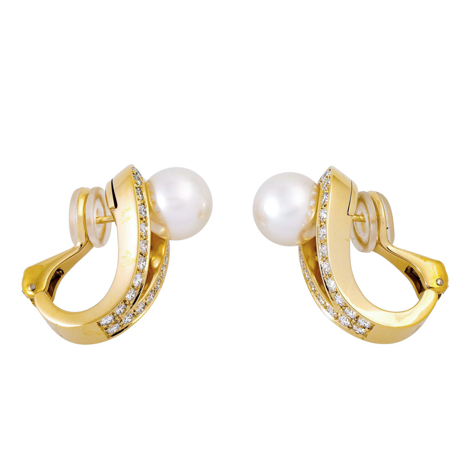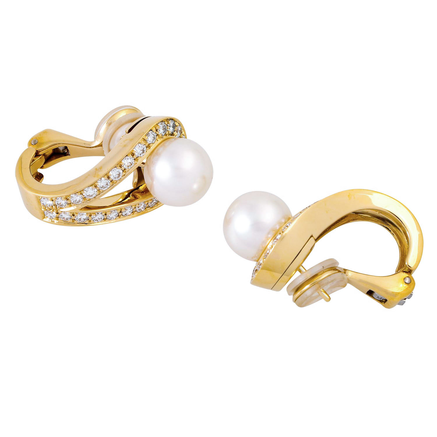 CHOPARD pair of ear clips with pins, studded with diamonds of ca. 1.69 ct and pearls, 18K YG, refurbished and sealed (opened for photography), mint condition, Ref. 844280-0001. Last retail price 28.700 €.Early 2000s, incl. copy of certificate and original case.