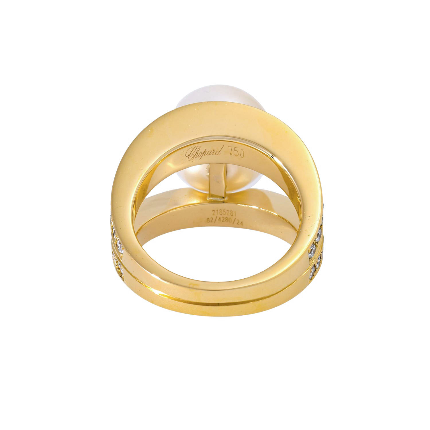 CHOPARD ring with South Sea pearl and brilliant-cut diamonds in total ca. 1.11 ct, 18K YG, ring size 52, 2000s, last retail price 18.700 €. Refurbished and packed in plastic foil (opened for photography), Ref. 824280-0002, mint condition, incl. copy of certfiicate and original case.