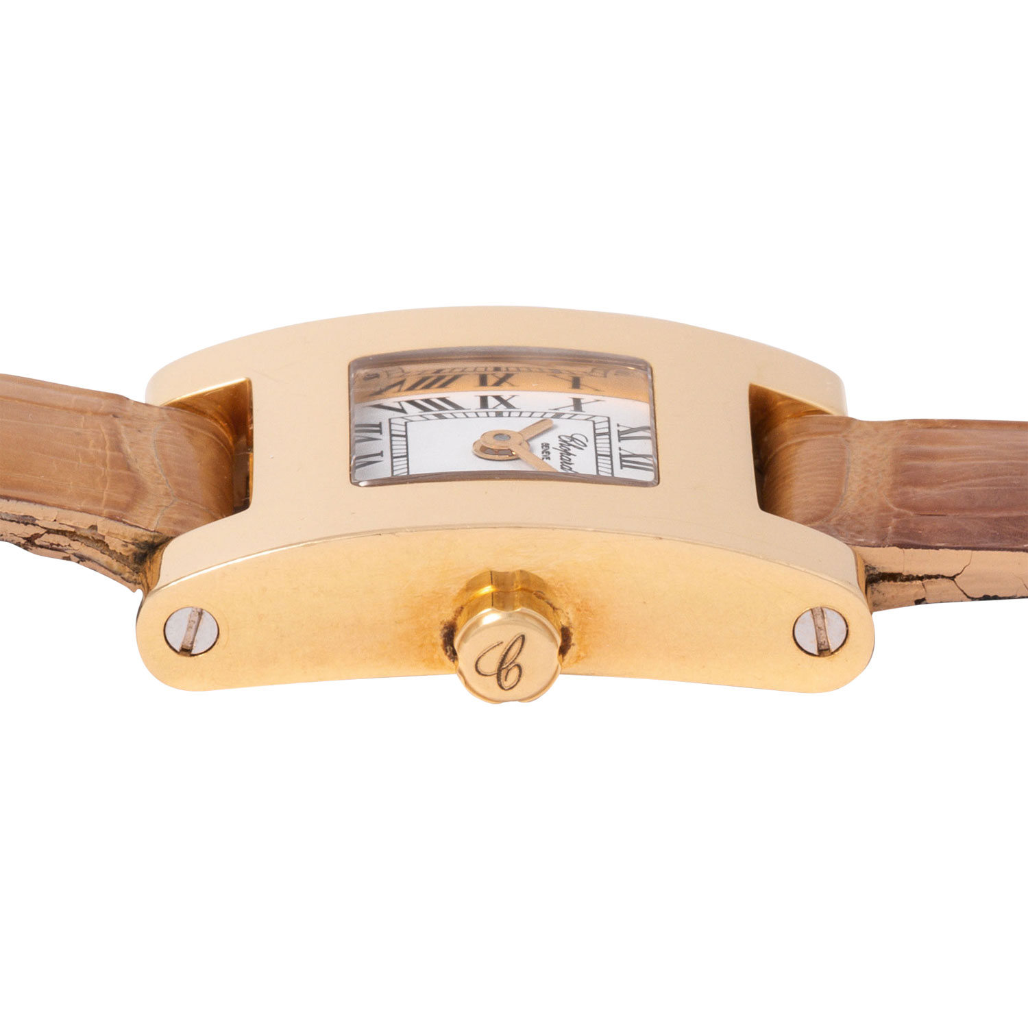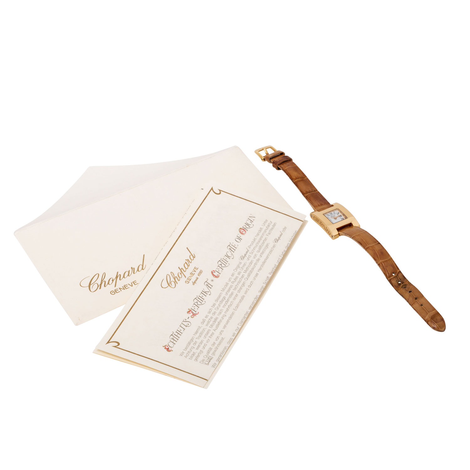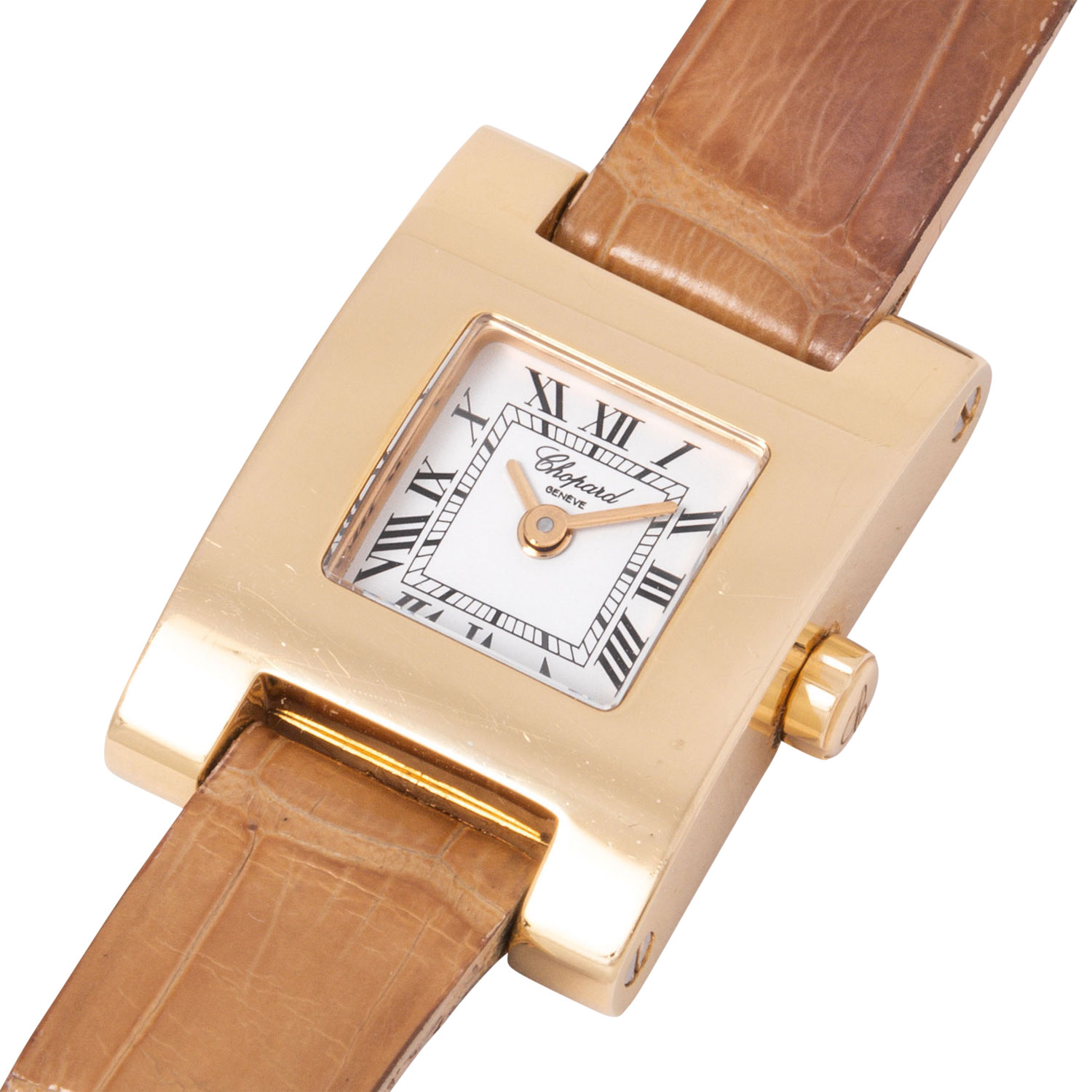 CHOPARD 'Your Hour' Ref 4451-1 ladies' watch. 18K yellow gold. 18K yellow gold. Quartz movement in working condition. Original leather wristband with pin buckle. White dial with Roman numerals. Used condition with visible signs of wear on the case and bracelet (heavily worn). Certificate of authenticity from the purchase at jeweler Wempe in Hamburg from September 2002 enclosed. Diameter approx. 19 mm without crown. Fits up to approx. 16 cm wrist size.